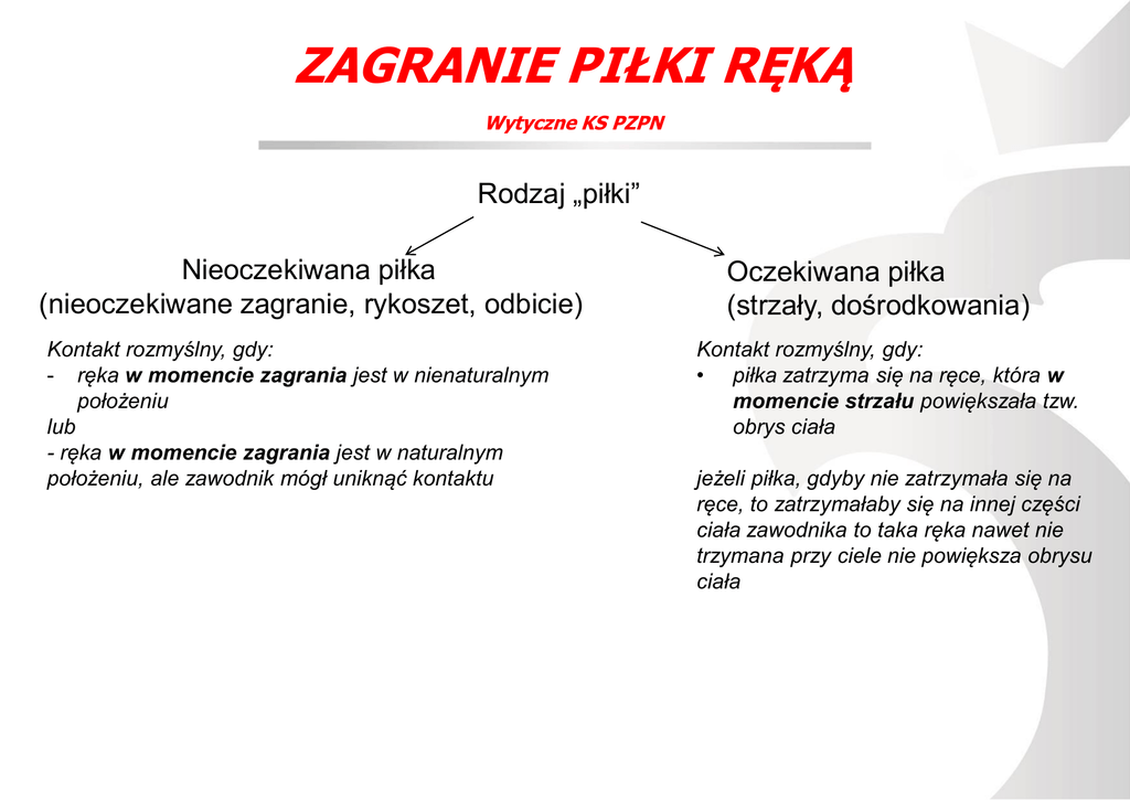 ZAGRANIE PIŁKI RĘKĄ Wytyczne KS PZPN Rodzaj „piłki” Nieoczekiwana piłka (nieoczekiwane zagranie, rykoszet, odbicie) Kontakt rozmyślny, gdy: - ręka w momencie zagrania jest w nienaturalnym położeniu lub - ręka w momencie zagrania jest w naturalnym położeniu, ale zawodnik mógł uniknąć kontaktu Oczekiwana piłka (strzały, dośrodkowania) Kontakt rozmyślny, gdy: • piłka zatrzyma się na ręce, która w momencie strzału powiększała tzw. obrys ciała jeżeli piłka, gdyby nie zatrzymała się na ręce, to zatrzymałaby się na innej części ciała zawodnika to taka ręka nawet nie trzymana przy ciele nie powiększa obrysu ciała