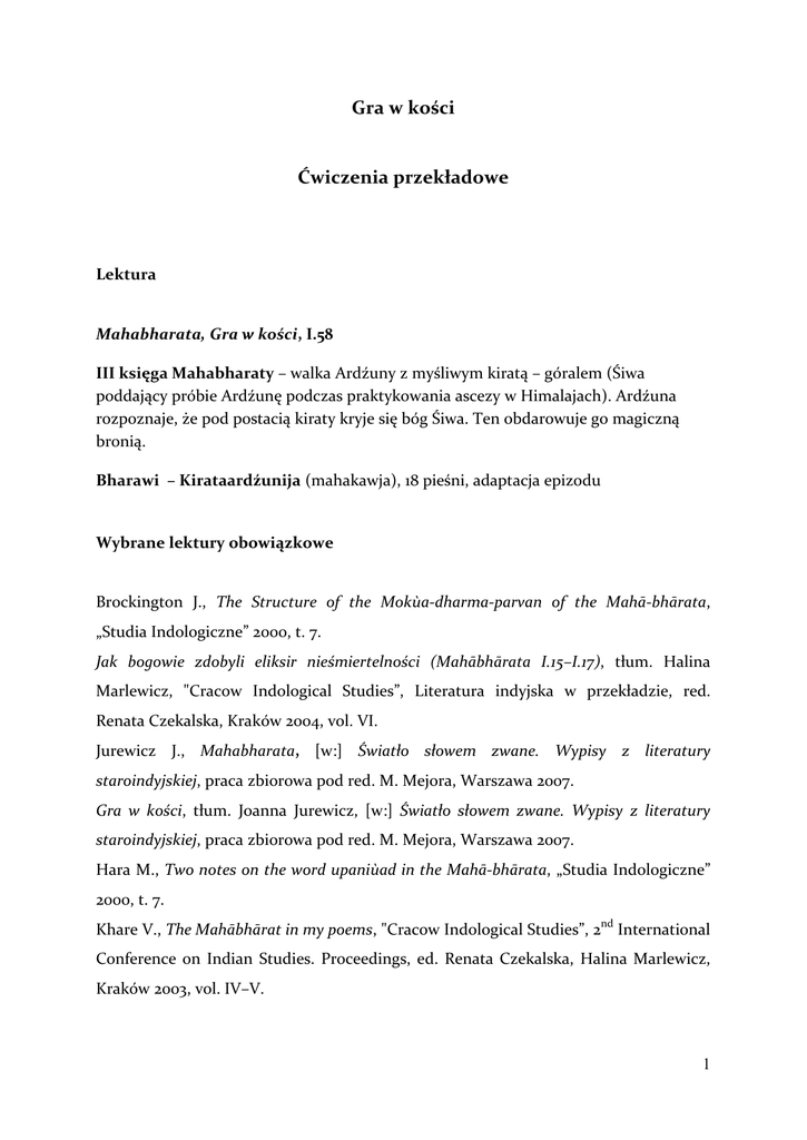 Gra w kości Ćwiczenia przekładowe Lektura Mahabharata, Gra w kości, I.58 III księga Mahabharaty – walka Ardźuny z myśliwym kiratą – góralem (Śiwa poddający próbie Ardźunę podczas praktykowania ascezy w Himalajach). Ardźuna rozpoznaje, że pod postacią kiraty kryje się bóg Śiwa. Ten obdarowuje go magiczną bronią. Bharawi – Kirataardźunija (mahakawja), 18 pieśni, adaptacja epizodu Wybrane lektury obowiązkowe Brockington J., The Structure of the Mokùa-dharma-parvan of the Mahā-bhārata, „Studia Indologiczne” 2000, t. 7. Jak bogowie zdobyli eliksir nieśmiertelności (Mahābhārata I.15–I.17), tłum. Halina Marlewicz, "Cracow Indological Studies”, Literatura indyjska w przekładzie, red. Renata Czekalska, Kraków 2004, vol. VI. Jurewicz J., Mahabharata, [w:] Światło słowem zwane. Wypisy z literatury staroindyjskiej, praca zbiorowa pod red. M. Mejora, Warszawa 2007. Gra w kości, tłum. Joanna Jurewicz, [w:] Światło słowem zwane. Wypisy z literatury staroindyjskiej, praca zbiorowa pod red. M. Mejora, Warszawa 2007. Hara M., Two notes on the word upaniùad in the Mahā-bhārata, „Studia Indologiczne” 2000, t. 7. Khare V., The Mahābhārat in my poems, "Cracow Indological Studies”, 2nd International Conference on Indian Studies. Proceedings, ed. Renata Czekalska, Halina Marlewicz, Kraków 2003, vol. IV–V. 1 Pieśń o Nalu i Damajanti. Baśń staroindyjska z Ksiąg Maha-bharaty, tłum. Antoni Lange, Warszawa 1906. Sachse J., Samochwalstwo i obelgi na polu bitwy w Mahabharacie, „Classica Wratislaviensia”, Thaleia. Humor w antyku, Wrocław 2004, t. XXIV. Zagadki z Mahabharaty (Mahābhārata III.313.45–52; 55–64; 67–84; 87–94), tłum. Iwona Milewska, "Cracow Indological Studies”, Literatura indyjska w przekładzie, red. Renata Czekalska, Kraków 2004, vol. VI. Zaliczenie 1. Przekład i praca pisemna 2. Przekład i test końcowy 1. Przekład i praca pisemna a. Dokonaj przekładu literackiego i omów najważniejsze problemy związane z przekładem. b. Dokonaj przekładu literackiego i analizy wątku Gra w kości. 2. Przekład i test końcowy Przykładowe pytania: 1. Mahabharata jest eposem indyjskim, który powstawał: a. między IV w. p.n.e. a IV w. n.e. b. między II w. p.n.e. a II w. n.e. c. w II w. n.e. d. między III w. p.n.e. a III w. n. e. e. żadna z odpowiedzi nie jest prawidłowa Punktacja: max 2 pkt. Punkty uzyskane: 2. Mahabharata należy do dzieł: 2 a. smriti b. śruti Punktacja: max 1 pkt Punkty uzyskane: 3. Który bohater nie jest synem króla Pandu: a. Judhiszthira b. Bhima c. Durjodhana d. Ardźuna e. Nakula f. Sahadewa Punktacja: max 1 pkt. Punkty uzyskane: 4. Podstawowym metrum Mahabharaty jest ………………………………………… Punktacja: max 1 pkt. Punkty uzyskane: 5. Gra w kości wywodzi się z obrzędu sakralnego związanego z: a. kultem ognia, płodności, śmierci b. kultem władcy, siły i zwycięstwa c. kultem powietrza, siły i ożywczego tchnienia d. kultem wody, mocy i nieśmiertelności Punktacja: max 3 pkt. Punkty uzyskane: 6. U początków gry kości noszą imiona: a. królów 3 b. bogów c. bohaterów epickich Punktacja: max 2 pkt. Punkty uzyskane: 7. Nasiona bobu oznaczają ………………………………………………… Punktacja: max 2 pkt. Punkty uzyskane: 8. Nal podczas tułaczki wpada w płomienie ognia, w których zamienia się w: a. piękną kobietę b. ptaka c. szpetnego starca d. bramina Punktacja: max 2 pkt. Punkty uzyskane: 9. Uzupełnij schemat: przegrywa …………. traci królestwo ………………………….. błąka się, cierpi wygrywa kości odzyskuje królestwo jednoczy się z żoną zdobywa szczęście, piękno, bogactwo zamieszkuje w nim demon śmierci demon śmierci opuszcza jego duszę ………….. zapomnienie, szpetota, starość, niewola, bycie nierozpoznanym dobro ………………….., przybycie do ojczyzny ……………, …………….., młodość, piękno martwota życie wokół gry w kości Powyższy schemat symbolizuje ………………………………………………………… 4 Punktacja: max 7 pkt. Punkty uzyskane: 5