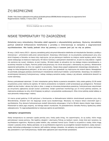 ŻYJ BEZPIECZNIE Źródło: http://www.zyjbezpiecznie.policja.pl/zb/aktualnosci/85066,Niskie-temperatury-to-zagrozenie.html Wygenerowano: Sobota, 4 marca 2017, 10:38 Strona znajduje się w archiwum. NISKIE TEMPERATURY TO ZAGROŻENIE Ostatniej nocy mieszkańcy Sieradza zdali egzamin z obywatelskiej postawy. Dyżurny sieradzkiej policji odebrał kilkanaście telefonów z prośbą o interwencję w związku z zagrożeniem wychłodzeniem. Nie każdy jednak chce tej pomocy a czasem jest już na nią za późno. W nocy z 14/15 marca 2013 r. dyżurny sieradzkiej policji otrzymał kilkanaście telefonów od mieszkańców Sieradza z prośbą o interwencje i uchronienie osób przez zamarznięciem. Dzwoniący informowali, że na przystanku autobusowym przy ulicy Armii Krajowej w Sieradzu na ławce leży mężczyzna. Już po pierwszym telefonie na miejsce został wysłany patrol, który zastał siedzącego na ławeczce mężczyznę. W trakcie rozmowy z policjantami stwierdził on, że jest mu tutaj dobrze i nigdzie nie zamierza się ruszać. Ustalono, że jest trzeźwy. 39-latek dodał, że aktualnie nie ma stałego miejsca zameldowania, a wcześniej mieszkał na Śląsku. Pomimo próśb funkcjonariuszy nie chciał skorzystać z oferowanej mu pomocy. Wielokrotnie zapewniał policjantów, że chce noc spędzić na przystanku. Swoje słowa poparł podpisaniem stosownego oświadczenia. Z uwagi na niską temperaturę policjanci, aż do rana co jakiś czas sprawdzali czy mężczyzna nie zmienił zdania. Niewątpliwie na pochwałę zasługuje postawa anonimowych mieszkańców okolicznych bloków i przechodniów. Dzwoniący nie wiedzieli o wcześniejszej interwencji funkcjonariuszy i widząc siedzącą samotnie osobę z obawy o jej zdrowie, wielokrotnie dzwonili na numer alarmowy. Pomocy potrzebował natomiast 21-letni mieszkaniec gminy Warta w powiecie sieradzkim, który około godziny 22:30 został przywieziony przez rodzinę do szpitala. W trakcie przewożenia na badanie uciekł przewożącej go pielęgniarce. Ponieważ oddalił się bez butów i ubrany był tylko w dres, z uwagi na minusową temperaturę powietrza, funkcjonariusze natychmiast po otrzymaniu zgłoszenia zaczęli szukać uciekiniera. Dzięki systemowi monitoringu już 15 minut później ustalono, że mężczyzna przebywa na ulicy Armii Krajowej na jednym z przystanków autobusowych. Kilka minut później został oddany w ręce personelu medycznego i rodziny. 14 marca przed godziną 11:00 policjnaci z Komisariatu w Aleksadnrowie Łódzkim skontrolowali pustostan przy ulicy Wierzbińskiej. Znaleźli tam nie dającego oznak życia bezdomnego. Wezwany na miejsce lekarz stwierdził zgon z wychłodzenia. Przy denacie funkcjonariusze znaleźli dokumenty wksazujące, iż był to 38-letni dawny lokator tego miejsca. Potwierdził to także jego znajomy, do którego dotarli mundurowi. Po powiadomieniu Ośrodka Pomocy Społecznej zwłoki zabezpieczono. To najprawdopodobniej ta instytucja zajmie sie pochówkiem. Apelujemy i przypominamy Kiedy temperatura na zewnątrz spada poniżej zera, kiedy pada śnieg, nie zapominajmy, że są osoby, które mogą potrzebować naszej pomocy. Nie bądźmy obojętni i alarmujmy Policję za każdym razem, kiedy ktoś jest narażony na wychłodzenie organizmu. Wystarczy jeden telefon, aby uratować komuś życie. Chodzi tu oczywiście o osoby, które mogą cierpieć z powodu zimna. Należy pamiętać, że na wychłodzenie organizmu są szczególnie narażeni bezdomni, osoby starsze i osoby nietrzeźwe przebywające na dworze. Jeśli widzimy takiego człowieka, nie wahajmy się zadzwonić na numer alarmowy, aby powiadomić o tym funkcjonariuszy. Każde takie zgłoszenie jest natychmiast sprawdzane. Policjanci pełniący służbę patrolową sprawdzają miejsca, w których mogą nocować osoby bezdomne. Są to zazwyczaj pustostany, ogródki działkowe, altanki. Aby się rozgrzać bardzo często w takich miejscach rozpalają ogniska, co bywa bardzo niebezpieczne. Funkcjonariusze odnajdujący takie osoby zawsze proponują przewiezienie ich do ośrodków, w których jest ciepło, gdzie mogą zjeść ciepły posiłek i przespać się w normalnych warunkach. Jeśli ktoś zauważy taką osobę, która może potrzebować pomocy nie należy zwlekać i jak najszybciej wykręcić numer alarmowy. Zimową porą na wychłodzenie organizmu są także szczególnie narażone osoby starsze. Jeśli znamy kogoś starszego, żyjącego samotnie nie wstydźmy się sprawdzić i spytać czy potrzebuje naszej pomocy. Należy pamiętać, że są ośrodki i placówki, w których taka osoba otrzyma opiekę i będzie bezpieczna. Jednym z najczęstszych a zarazem najbardziej mylnych mitów jest ten, że na rozgrzewkę najlepszy jest alkohol. To nieprawda. Faktycznie przez chwilę osoba pijąca czuje ciepło, to jednak za chwilę jej organizm jest jeszcze bardziej narażony na wyziębienie. Dużym niebezpieczeństwem jest wychodzenie na dwór będąc pod wpływem alkoholu. Wystarczy chwila nieuwagi, śliska, nierówna nawierzchnia i można się potknąć, wywrócić i nie mieć siły się podnieść. Wtedy o tragedię nietrudno. Dlatego też nie należy przechodzić obojętnie obok osób po alkoholu podczas silnych mrozów. Tu także wystarczy wykręcić numer alarmowy i poinformować policjantów o takim przypadku. On także nie pozostanie bez odpowiedzi. Funkcjonariusze reagują na każde zgłoszenie i niekiedy to właśnie jeden telefon może zadecydować o czyimś życiu. (KWP w Łodzi / KGP) Ocena: 0/5 (0) Tweetnij niebezpieczna zima, wychłodzenia, pomoc policjantów