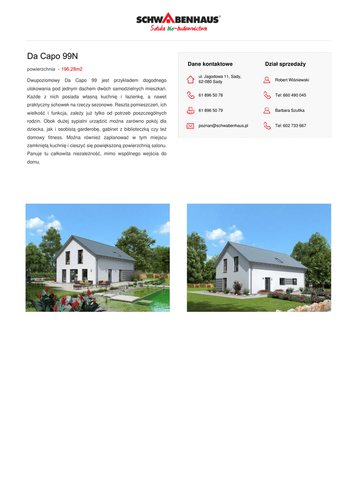 Da Capo 99N Dane kontaktowe . Dział sprzedazy powierzchnia - 196,28m2 Dwupoziomowy Da Capo 99 jest przykładem dogodnego ul. Jagodowa 11, Sady, 62-080 Sady Robert Wiśniewski 61 896 50 78 Tel: 660 490 045 61 896 50 79 Barbara Szultka [email protected] Tel: 602 733 667 ulokowania pod jednym dachem dwóch samodzielnych mieszkań. Każde z nich posiada własną kuchnię i łazienkę, a nawet praktyczny schowek na rzeczy sezonowe. Reszta pomieszczeń, ich wielkość i funkcja, zależy już tylko od potrzeb poszczególnych rodzin. Obok dużej sypialni urządzić można zarówno pokój dla dziecka, jak i osobistą garderobę, gabinet z biblioteczką czy też domowy fitness. Można również zaplanować w tym miejscu zamkniętą kuchnię i cieszyć się powiększoną powierzchnią salonu. Panuje tu całkowita niezależność, mimo wspólnego wejścia do domu. RZUT POMIESZCZEŃ: Powered by TCPDF (www.tcpdf.org)