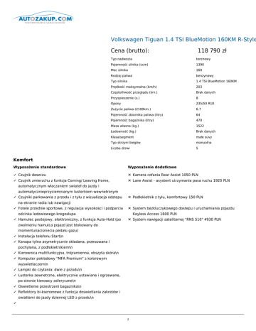 Volkswagen Tiguan 1.4 TSI BlueMotion 160KM R-Style Cena (brutto): 118 790 zł Typ nadwozia terenowy Pojemność silnika (ccm) 1390 Moc silnika 160 Rodzaj paliwa benzynowy Typ silnika 1.4 TSI BlueMotion 160KM Prędkość maksymalna (km/h) 203 Częstotliwość przeglądu (km.) Brak danych Przyspieszenie (s.) 8 Opony 235/50 R18 Zużycie paliwa (l/100km.) 6.7 Pojemność zbiornika paliwa (litry) 64 Pojemność bagażnika (litry) 470 Masa własna (kg.) 1522 Ładowność (kg.) Brak danych Klasa/segment małe suvy Typ skrzyni biegów manualna Liczba drzwi 5 Komfort Wyposażenie standardowe Wyposażenie dodatkowe ✓ Czujnik deszczu ✕ Kamera cofania Rear Assist 1050 PLN ✓ Czujnik zmierzchu z funkcja Coming/ Leaving Home, ✕ Lane Assist - asystent utrzymania pasa ruchu 1920 PLN automatycznym właczaniem swiateł do jazdy i automatycznieprzyciemnianym lusterkiem wewnetrznym ✓ Czujniki parkowania z przodu i z tyłu z wizualizacja odstepu ✕ Podłokietnik z tyłu, komfortowy 150 PLN na ekranie radia lub nawigacji ✓ Fotele przednie sportowe, z regulacja wysokosci i podparcia ✕ System bezkluczykowego dostepu i uruchamiania pojazdu odcinka ledzwiowego kregosłupa ✓ Hamulec postojowy, elektroniczny, z funkcja Auto-Hold (po Keyless Access 1600 PLN ✕ System nawigacji satelitarnej "RNS 510" 4930 PLN zwolnieniu hamulca pojazd jest blokowany do momentunacisniecia pedału gazu) ✓ Instalacja telefonu Start\n ✓ Kanapa tylna asymetrycznie składana, przesuwana i pochylana, z podłokietnikiem\n ✓ Kierownica multifunkcyjna, trójramienna, obszyta skóra\n ✓ Komputer pokładowy "MFA Premium" z kolorowym wyswietlaczem\n ✓ Lampki do czytania: dwie z przodu\n ✓ Lusterka zewnetrzne, elektrycznie ustawiane i ogrzewane, po stronie kierowcy asferyczne\n ✓ Oswietlenie przestrzeni bagaznika\n ✓ Reflektory bi-ksenonowe z funkcja doswietlania zakretów i swiatłami do jazdy dziennej LED z przodu\n ✓ 1 Schowek w dachu, z zamknieciem\n 2 ✓ Stoliki w oparciach przednich foteli, składane\n ✓ Swiatła do jazdy dziennej\n ✓ System parkowania Park Assist 2.0\n ✓ Szuflady pod przednimi fotelami\n ✓ Szyby sterowane elektrycznie z przodu i z tyłu\n ✓ Szyby termoizolacyjne, zielone\n ✓ Tapicerka z Alcantary "Milan"\n ✓ Tempomat\n ✓ Wspomaganie układu kierowniczego regulowane w zaleznosci od predkosci samochodu, elektromechaniczne\n Bezpieczeństwo Wyposażenie standardowe Wyposażenie dodatkowe ✓ ESP ze stabilizacja przyczepy i kontrola przechyłu, ABS z asystentem hamowania, ASR, EDS, MSR\n ✓ Isofix - mocowania dla siedzen zewnetrznych z tyłu\n ✓ Kurtyny powietrzne dla pasazerów z przodu i z tyłu\n ✓ Pasy bezpieczenstwa dla foteli przednich, bezwładnosciowe, 3-punktowe, z regulacja wysokosci i napinaczami\n ✓ Pasy bezpieczenstwa dla siedzen tylnych, bezwładnosciowe, 3-punktowe\n ✓ Poduszki powietrzne boczne dla kierowcy i pasazera z przodu\n ✓ Poduszki powietrzne kierowcy i pasazera, z funkcja deaktywacji poduszki pasazera\n ✓ Swiatła awaryjne właczane automatyczne przy gwałtownym hamowaniu\n ✓ Swiatła przeciwmgielne z funkcja statycznego doswietlania zakretów i chromowana obwódka\n ✓ Sygnalizator niezapietych pasów bezpieczenstwa dla kierowcy i pasazera z przodu, akustyczny i wizualny\n ✓ System wykrywania zmeczenia kierowcy\n ✓ Zderzak przedni z 18-stopniowym katem natarcia\n Dodatki Wyposażenie standardowe Wyposażenie dodatkowe ✓ Antena dachowa, aktywna ✕ Autoalarm z niezaleznym zasilaniem (Back-up-Horn), funkcja dozoru wnetrza i czujnikiem przechyłu 1200 PLN ✓ Aplikacje dekoracyjne "Dark Rhodium" na desce rozdzielczej ✕ Dach szklany, panoramiczny, sterowany elektrycznie 3800 i konsoli środkowej ✓ Aplikacje dekoracyjne "Silber Metallic" na PLN ✕ dodatkowe 12 miesiecy, maksymalny przebieg: 30 000 km drzwiach ✓ Deska rozdzielcza o białym podswietleniu z regulacja 900 PLN ✕ dodatkowe 12 miesiecy, maksymalny przebieg: 60 000 km intensywnosci, czerwone podswietlenie przełaczników ✓ Fotel pasazera z przodu, składany 1200 PLN ✕ dodatkowe 12 miesiecy, maksymalny przebieg: 90 000 km 1700 PLN 3 ✓ Gałka dzwigni zmiany biegów obszyta skóra ✕ dodatkowe 24 miesiace, maksymalny przebieg: 120 000 km 3500 PLN ✓ Gniazdo 12V w bagazniku ✕ dodatkowe 24 miesiace, maksymalny przebieg: 40 000 km 1800 PLN ✓ Hamulce tarczowe z przodu i z tyłu, z przodu wentylowane ✕ dodatkowe 24 miesiace, maksymalny przebieg: 80 000 km 2550 PLN ✓ Kierownica multifunkcyjna, z funkcja Tiptronic - dostepna ✕ dodatkowe 36 miesiecy, maksymalny przebieg: 100 000 km tylko z automatyczna skrzynia biegów, trójramienna, obszyta 4200 PLN skóra,manetki przy kierownicy do zmiany biegów ✓ Kierunkowskazy boczne, zintegrowane w obudowie lusterek, ✕ dodatkowe 36 miesiecy, maksymalny przebieg: 150 000 km białe ✓ Kieszenie w oparciach przednich foteli 5500 PLN ✕ dodatkowe 36 miesiecy, maksymalny przebieg: 50 000 km 2900 PLN ✓ Klimatyzacja dwustrefowa, z automatyczna regulacja ✕ Dynamic Light Assist - asystent swiateł 1800 PLN "Climatronic" ✓ Kolumna kierownicy z mozliwoscia regulacji w dwóch ✕ Dywaniki materiałowe z przodu i z tyłu 420 PLN płaszczyznach ✓ Listwa na dolnej krawedzi drzwi bocznych z przodu i z tyłu, ✕ Hak holowniczy, składany i chowany 3730 PLN chromowana ✓ Listwy dookoła szyb bocznych, chromowane ✕ Klimatyzacja - mozliwosc rezygnacji ze standardowego ✓ Lusterka "Make up" w osłonach przeciwsłonecznych po ✕ Lakier metaliczny 2200 PLN wyposazenia 0 PLN stronie kierowcy i pasazera, podswietlane ✓ Obramowanie i listwy osłony wlotu powietrza do chłodnicy, ✕ Lakier perłowy 2200 PLN chromowane ✓ Obrecze kół ze stopu metali lekkich "Mallory" ✕ Obrecze aluminiowe "Mallory"(obrecze ze stopu (opony 235/50 R18, zawieszenie sportowe) metali lekkich 9J x 19,opony 255/40 R 19,zawieszenie sportowe, sruby kół z zabezpieczeniem antykradziezowym "Thatcham") 1720 PLN ✓ Obudowy lusterek i klamki w kolor