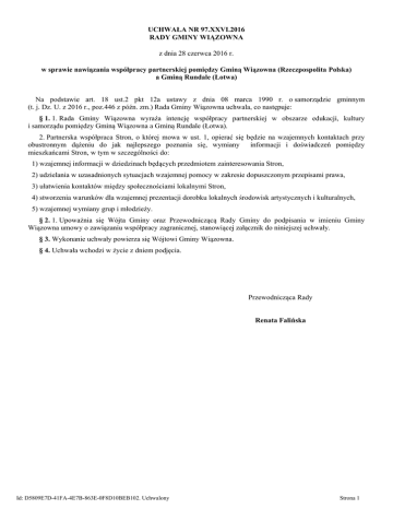 UCHWAŁA NR 97.XXVI.2016 RADY GMINY WIĄZOWNA z dnia 28 czerwca 2016 r. w sprawie nawiązania współpracy partnerskiej pomiędzy Gminą Wiązowna (Rzeczpospolita Polska) a Gminą Rundale (Łotwa) Na podstawie art. 18 ust.2 pkt 12a ustawy z dnia 08 marca 1990 r. o samorządzie gminnym (t. j. Dz. U. z 2016 r., poz.446 z późn. zm.) Rada Gminy Wiązowna uchwala, co następuje: § 1. 1. Rada Gminy Wiązowna wyraża intencję współpracy partnerskiej w obszarze edukacji, kultury i samorządu pomiędzy Gminą Wiązowna a Gminą Rundale (Łotwa). 2. Partnerska współpraca Stron, o której mowa w ust. 1, opierać się będzie na wzajemnych kontaktach przy obustronnym dążeniu do jak najlepszego poznania się, wymiany informacji i doświadczeń pomiędzy mieszkańcami Stron, w tym w szczególności do: 1) wzajemnej informacji w dziedzinach będących przedmiotem zainteresowania Stron, 2) udzielania w uzasadnionych sytuacjach wzajemnej pomocy w zakresie dopuszczonym przepisami prawa, 3) ułatwienia kontaktów między społecznościami lokalnymi Stron, 4) stworzenia warunków dla wzajemnej prezentacji dorobku lokalnych środowisk artystycznych i kulturalnych, 5) wzajemnej wymiany grup i młodzieży. § 2. 1. Upoważnia się Wójta Gminy oraz Przewodniczącą Rady Gminy do podpisania w imieniu Gminy Wiązowna umowy o zawiązaniu współpracy zagranicznej, stanowiącej załącznik do niniejszej uchwały. § 3. Wykonanie uchwały powierza się Wójtowi Gminy Wiązowna. § 4. Uchwała wchodzi w życie z dniem podjęcia. Przewodnicząca Rady Renata Falińska Id: D5809E7D-41FA-4E7B-863E-0F8D10BEB102. Uchwalony Strona 1 Załącznik do uchwały Nr 97.XXVI.2016 Rady Gminy Wiązowna z dnia 28 czerwca 2016 r. Umowa …………………….. o nawiązaniu współpracy partnerskiej pomiędzy Gminą Wiązowna (Rzeczpospolita Polska) a Gminą Rundale (Łotwa) Gmina Wiązowna (Rzeczpospolita Polska) i Gmina Rundale (Łotwa) wyrażają wspólną gotowość zawarcia umowy współpracy partnerskiej. do Wolą samorządu gminy Wiązowna i samorządu gminy Rundale jest nawiązanie do dobrych tradycji przyjaznego współistnienia narodów będących częścią Wspólnoty Europejskiej. Partnerstwo ma stanowić podstawę do rozwoju międzynarodowych relacji. Szeroka integracja jak największej liczby mieszkańców powinna wspierać trwałe przyjaźnie pomiędzy obywatelami obu jednostek oraz prowadzić do rozwoju wzajemnych kontaktów pomiędzy miejscowymi organizacjami i instytucjami. § 1. Gminy partnerskie zobowiązują się do umacniania kontaktów, m. in. w dziedzinach edukacji, kultury, sportu, gospodarki i innych zadań publicznych na zasadzie tolerancji, zrozumienia i wzajemnego poszanowania. § 2. W miarę potrzeb między partnerami mogą zostać zawarte umowy dotyczące realizacji konkretnych przedsięwzięć. § 3. Realizacja postanowień niniejszej umowy będzie się odbywać zgodnie z ustawodawstwem wewnętrznym obu Stron. § 4. Niniejsza umowa zostaje zawarta na czas nieokreślony. Każda ze stron może odstąpić od umowy, powiadamiając pisemnie drugą stronę na 3 miesiące przed odstąpieniem. § 5. Wszelkie spory wynikłe z realizacji niniejszej umowy strony będą rozstrzygane w drodze konsultacji. § 6. Zmiany i uzupełnienia niniejszej umowy wnoszone będą pisemnie za zgodą obu stron w formie aneksów, które stanowią jej integralną część. § 7. Niniejsza umowa wchodzi w życie z dniem jej podpisania. § 8. Podpisane umowy w dwóch jednobrzmiących egzemplarzach, każdy w języku polskim i angielskim, mają jednakową moc prawną. Gmina Wiązowna Id: D5809E7D-41FA-4E7B-863E-0F8D10BEB102. Uchwalony Gmina Rundale Strona 1 Uzasadnienie Rada Gminy Wiązowna jako organ stanowiący gminy, na podstawie art.18 ust.2 pkt 12a ustawy z dnia 08 marca 1990 r. o samorządzie gminnym (t. j. Dz. U. z 2016 r., poz.446 z późn.zm.), może podejmować uchwały w sprawach współpracy ze społeczeństwami lokalnymi i regionalnymi innych państw oraz przystępowania do międzynarodowych zrzeszeń społeczności lokalnych i regionalnych. Nawiązanie partnerskiej współpracy Gminy Wiązowna z Gminą Rundale (Łotwa), może umożliwić wymianę informacji w szczególności w dziedzinie kultury, edukacji i samorządu. Dotychczasowa współpraca Gminy Wiązowna z Gminą Rundale (Łotwa) opierała się na kontaktach szkół poczatkowo poprzez program Comenius, a następnie we własnym zakresie a także Wójtów Stron wymienionych w projekcie uchwały. Jednocześnie należy zwrócić uwagę, że kontakty te - trwające od 2012 roku - nie są jednak sformalizowane. Przykładem takich kontaktów była wizyta w maju 2016 r. Wójta Gminy Wiązowna w Gminie Rundale (Łotwa) podczas której przedstawiciele gminy Rundale przekazali list intencyjny w sprawie chęci zawarcia współpracy partnerskiej. Zasadnym jest pozytywne odniesienie się do tej propozycji. Przewodnicząca Rady Renata Falińska Id: D5809E7D-41FA-4E7B-863E-0F8D10BEB102. Uchwalony Strona 1