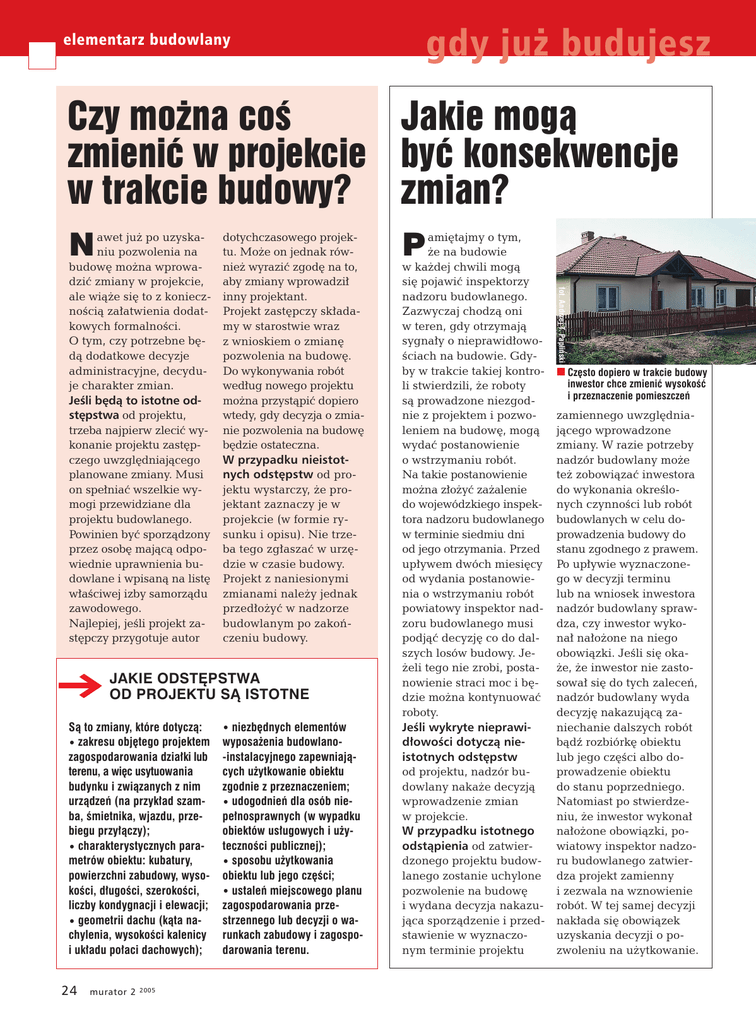 gdy ju˝ budujesz elementarz budowlany Jakie mogà Czy mo˝na coÊ zmieniç w projekcie byç konsekwencje w trakcie budowy? zmian? N dotychczasowego projektu. Mo˝e on jednak równie˝ wyraziç zgod´ na to, aby zmiany wprowadzi∏ inny projektant. Projekt zast´pczy sk∏adamy w starostwie wraz z wnioskiem o zmian´ pozwolenia na budow´. Do wykonywania robót wed∏ug nowego projektu mo˝na przystàpiç dopiero wtedy, gdy decyzja o zmianie pozwolenia na budow´ b´dzie ostateczna. W przypadku nieistotnych odst´pstw od projektu wystarczy, ˝e projektant zaznaczy je w projekcie (w formie rysunku i opisu). Nie trzeba tego zg∏aszaç w urz´dzie w czasie budowy. Projekt z naniesionymi zmianami nale˝y jednak przed∏o˝yç w nadzorze budowlanym po zakoƒczeniu budowy. JAKIE ODST¢PSTWA OD PROJEKTU SÑ ISTOTNE Sà to zmiany, które dotyczà: zakresu obj´tego projektem zagospodarowania dzia∏ki lub terenu, a wi´c usytuowania budynku i zwiàzanych z nim urzàdzeƒ (na przyk∏ad szamba, Êmietnika, wjazdu, przebiegu przy∏àczy); charakterystycznych parametrów obiektu: kubatury, powierzchni zabudowy, wysokoÊci, d∏ugoÊci, szerokoÊci, liczby kondygnacji i elewacji; geometrii dachu (kàta nachylenia, wysokoÊci kalenicy i uk∏adu po∏aci dachowych); 24 murator 2 2005 niezb´dnych elementów wyposa˝enia budowlano-instalacyjnego zapewniajàcych u˝ytkowanie obiektu zgodnie z przeznaczeniem; udogodnieƒ dla osób niepe∏nosprawnych (w wypadku obiektów us∏ugowych i u˝ytecznoÊci publicznej); sposobu u˝ytkowania obiektu lub jego cz´Êci; ustaleƒ miejscowego planu zagospodarowania przestrzennego lub decyzji o warunkach zabudowy i zagospodarowania terenu. P ami´tajmy o tym, ˝e na budowie w ka˝dej chwili mogà si´ pojawiç inspektorzy nadzoru budowlanego. Zazwyczaj chodzà oni w teren, gdy otrzymajà sygna∏y o nieprawid∏owoÊciach na budowie. Gdyby w trakcie takiej kontroli stwierdzili, ˝e roboty sà prowadzone niezgodnie z projektem i pozwoleniem na budow´, mogà wydaç postanowienie o wstrzymaniu robót. Na takie postanowienie mo˝na z∏o˝yç za˝alenie do wojewódzkiego inspektora nadzoru budowlanego w terminie siedmiu dni od jego otrzymania. Przed up∏ywem dwóch miesi´cy od wydania postanowienia o wstrzymaniu robót powiatowy inspektor nadzoru budowlanego musi podjàç decyzj´ co do dalszych losów budowy. Je˝eli tego nie zrobi, postanowienie straci moc i b´dzie mo˝na kontynuowaç roboty. JeÊli wykryte nieprawid∏owoÊci dotyczà nieistotnych odst´pstw od projektu, nadzór budowlany naka˝e decyzjà wprowadzenie zmian w projekcie. W przypadku istotnego odstàpienia od zatwierdzonego projektu budowlanego zostanie uchylone pozwolenie na budow´ i wydana decyzja nakazujàca sporzàdzenie i przedstawienie w wyznaczonym terminie projektu fot. Andrzej T. Papliƒski awet ju˝ po uzyskaniu pozwolenia na budow´ mo˝na wprowadziç zmiany w projekcie, ale wià˝e si´ to z koniecznoÊcià za∏atwienia dodatkowych formalnoÊci. O tym, czy potrzebne b´dà dodatkowe decyzje administracyjne, decyduje charakter zmian. JeÊli b´dà to istotne odst´pstwa od projektu, trzeba najpierw zleciç wykonanie projektu zast´pczego uwzgl´dniajàcego planowane zmiany. Musi on spe∏niaç wszelkie wymogi przewidziane dla projektu budowlanego. Powinien byç sporzàdzony przez osob´ majàcà odpowiednie uprawnienia budowlane i wpisanà na list´ w∏aÊciwej izby samorzàdu zawodowego. Najlepiej, jeÊli projekt zast´pczy przygotuje autor Cz´sto dopiero w trakcie budowy inwestor chce zmieniç wysokoÊç i przeznaczenie pomieszczeƒ zamiennego uwzgl´dniajàcego wprowadzone zmiany. W razie potrzeby nadzór budowlany mo˝e te˝ zobowiàzaç inwestora do wykonania okreÊlonych czynnoÊci lub robót budowlanych w celu doprowadzenia budowy do stanu zgodnego z prawem. Po up∏ywie wyznaczonego w decyzji terminu lub na wniosek inwestora nadzór budowlany sprawdza, czy inwestor wykona∏ na∏o˝one na niego obowiàzki. JeÊli si´ oka˝e, ˝e inwestor nie zastosowa∏ si´ do tych zaleceƒ, nadzór budowlany wyda decyzj´ nakazujàcà zaniechanie dalszych robót bàdê rozbiórk´ obiektu lub jego cz´Êci albo doprowadzenie obiektu do stanu poprzedniego. Natomiast po stwierdzeniu, ˝e inwestor wykona∏ na∏o˝one obowiàzki, powiatowy inspektor nadzoru budowlanego zatwierdza projekt zamienny i zezwala na wznowienie robót. W tej samej decyzji nak∏ada si´ obowiàzek uzyskania decyzji o pozwoleniu na u˝ytkowanie. gdy koƒczysz budow´ elementarz budowlany Jak legalnie zamieszkaç? W stanu zgodnego z prawem; przystàpienie do u˝ytkowania ma nastàpiç przed wykonaniem wszystkich robót budowlanych (na przyk∏ad chcemy zamieszkaç w domu z niewykoƒczonym pi´trem). Zawiadomienie o zakoƒczeniu budowy lub wniosek o wydanie pozwolenia na u˝ytkowanie sk∏ada si´ w powiatowym inspektoracie nadzoru budowlanego. Do u˝ytkowania obiektu mo˝na przystàpiç: je˝eli urzàd w terminie 21 dni od dnia dor´czenia zawiadomienia nie wniesie sprzeciwu w drodze decyzji albo gdy decyzja o pozwoleniu na u˝ytkowanie stanie si´ ostateczna (czyli po 14 dniach od jej otrzymania przez wszystkie strony, pod warunkiem ˝e nikt si´ nie odwo∏a∏). Za wczeÊniejsze przystàpienie do u˝ytkowania domu nadzór budowlany na∏o˝y kar´ w wysokoÊci 10 000 z∏. JAKIE DOKUMENTY ZGROMADZIå Do zawiadomienia o zakoƒczeniu budowy inwestor musi do∏àczyç: orygina∏ dziennika budowy; oÊwiadczenie kierownika budowy, ˝e obiekt zosta∏ wybudowany zgodnie z projektem, pozwoleniem na budow´ i przepisami oraz ˝e uporzàdkowano teren budowy (wzór znajdziesz na stronie www.murator.pl); protoko∏y badaƒ lub kontroli; inwentaryzacj´ geodezyjnà powykonawczà. Do pozwolenia na u˝ytkowanie mogà byç dodatkowo wymagane oÊwiadczenia o braku sprzeciwu lub uwag ze strony: Inspekcji Ochrony Ârodowiska; sanepidu; Paƒstwowej Inspekcji Pracy; Paƒstwowej Stra˝y Po˝arnej. fot. Andrzej T. Papliƒski termin