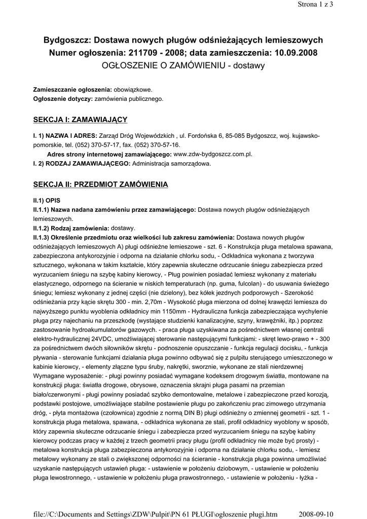 Strona 1 z 3 Bydgoszcz: Dostawa nowych pługów odśnieżających lemieszowych Numer ogłoszenia: 211709 - 2008; data zamieszczenia: 10.09.2008 OGŁOSZENIE O ZAMÓWIENIU - dostawy Zamieszczanie ogłoszenia: obowiązkowe. Ogłoszenie dotyczy: zamówienia publicznego. SEKCJA I: ZAMAWIAJĄCY I. 1) NAZWA I ADRES: Zarząd Dróg Wojewódzkich , ul. Fordońska 6, 85-085 Bydgoszcz, woj. kujawskopomorskie, tel. (052) 370-57-17, fax. (052) 370-57-16. Adres strony internetowej zamawiającego: www.zdw-bydgoszcz.com.pl. I. 2) RODZAJ ZAMAWIAJĄCEGO: Administracja samorządowa. SEKCJA II: PRZEDMIOT ZAMÓWIENIA II.1) OPIS II.1.1) Nazwa nadana zamówieniu przez zamawiającego: Dostawa nowych pługów odśnieżających lemieszowych. II.1.2) Rodzaj zamówienia: dostawy. II.1.3) Określenie przedmiotu oraz wielkości lub zakresu zamówienia: Dostawa nowych pługów odśnieżających lemieszowych A) pługi odśnieżne lemieszowe - szt. 6 - Konstrukcja pługa metalowa spawana, zabezpieczona antykorozyjnie i odporna na działanie chlorku sodu, - Odkładnica wykonana z tworzywa sztucznego, wykonana w takim kształcie, który zapewnia skuteczne odrzucanie śniegu zabezpiecza przed wyrzucaniem śniegu na szybę kabiny kierowcy, - Pług powinien posiadać lemiesz wykonany z materiału elastycznego, odpornego na ścieranie w niskich temperaturach (np. guma, fulcolan) - do usuwania świeżego śniegu; lemiesz wykonany z jednej części (nie dzielony), bez kółek jezdnych podporowych - Szerokość odśnieżania przy kącie skrętu 300 - min. 2,70m - Wysokość pługa mierzona od dolnej krawędzi lemiesza do najwyższego punktu wyoblenia odkładnicy min 1150mm - Hydrauliczna funkcja zabezpieczająca wychylenie pługa przy najechaniu na przeszkodę (wystające studzienki kanalizacyjne, szyny, krawężniki, itp.) poprzez zastosowanie hydroakumulatorów gazowych. - praca pługa uzyskiwana za pośrednictwem własnej centrali elektro-hydraulicznej 24VDC, umożliwiającej sterowanie następującymi funkcjami: - skręt lewo-prawo + - 300 za pośrednictwem dwóch siłowników skrętu - podnoszenie opuszczanie - funkcja regulacji docisku, - funkcja pływania - sterowanie funkcjami działania pługa powinno odbywać się z pulpitu sterującego umieszczonego w kabinie kierowcy, - elementy złączne typu śruby, nakrętki, sworznie, wykonane ze stali nierdzewnej Wymagane wyposażenie: - pługi powinny posiadać wymagane kodeksem drogowym światła, montowane na konstrukcji pługa: światła drogowe, obrysowe, oznaczenia skrajni pługa pasami na przemian biało/czerwonymi - pługi powinny posiadać szybko demontowalne, metalowe i zabezpieczone przed korozją, podstawki postojowe, umożliwiające stabilne postawienie pługu po zakończeniu prac zimowego utrzymania dróg, - płyta montażowa (czołownica) zgodnie z normą DIN B) pługi odśnieżny o zmiennej geometrii - szt. 1 konstrukcja pługa metalowa, spawana, - odkładnica wykonana ze stali, profil odkładnicy wyoblony w sposób, który zapewnia skuteczne odrzucanie śniegu i zabezpiecza przed wyrzucaniem śniegu na szybę kabiny kierowcy podczas pracy w każdej z trzech geometrii pracy pługu (profil odkładnicy nie może być prosty) metalowa konstrukcja pługa zabezpieczona antykorozyjnie i odporna na działanie chlorku sodu, - lemiesz metalowy wykonany ze stali o zwiększonej odporności na ścieranie - konstrukcja pługa powinna umożliwiać uzyskanie następujących ustawień pługa: - ustawienie w położeniu dziobowym, - ustawienie w położeniu pługa lewostronnego, - ustawienie w położeniu pługa prawostronnego, - ustawienie w położeniu - łyżka - file://C:\Documents and Settings\ZDW\Pulpit\PN 61 PŁUGI\ogłoszenie pługi.htm 2008-09-10 Strona 2 z 3 szerokość odśnieżania przy kącie + -900 - min 2650 mm - szerokość odśnieżania przy kącie + -300 - min. 2550mm - wysokość pługu w części dziobowej - min. 850mm - wysokość krawędzi tylnej skrzydła - min. 1100mm - wyposażenie w regulowaną płozę ślizgową, wykonaną ze stali o zwiększonej odporności na ścieranie, - Hydrauliczna funkcja zabezpieczająca wychylenie pługa przy najechaniu na przeszkodę (wystające studzienki kanalizacyjne, szyny, krawężniki, itp.) przez zastosowanie hydroakumulatorów gazowych - praca pługa uzyskiwana za pośrednictwem własnej centrali elektro-hydraulicznej 24VDC, umożliwiającej sterowanie następującymi funkcjami pracy: - podnoszenie opuszczanie - załączanie skrzydła lewego/prawego, - funkcja pływania - funkcja docisku - sterowanie pługiem powinno odbywać się z pulpitu sterującego umieszczonego w kabinie kierowcy, - tłoczyska w siłownikach powinny być wykonane ze stali odpornej na korozję, - elementy złączne typu śruby, nakrętki, sworznie, wykonane ze stali nierdzewnej lub ocynkowanej Wymagane wyposażenie: - pługi powinny posiadać wymagane kodeksem drogowym światła, montowane na konstrukcji pługa: światła drogowe, obrysowe, oznaczenia skrajni pługa pasami na przemian biało/czerwonymi - płyta montażowa (czołownica) zgodnie z normą DIN Warunki gwarancji co najmniej 24 miesiące. Wszystkie pługi będące przedmiotem zamówienia powinny być wyprodukowane i dostarczone przez jednego producenta.. II.1.4) Wspólny Słownik Zamówień (CPV): 29.52.31.31-8. II.1.5) Czy dopuszcza się złożenie oferty częściowej: Nie. II.1.6) Czy dopuszcza się złożenie oferty wariantowej: Nie. II.2) CZAS TRWANIA ZAMÓWIENIA LUB TERMIN WYKONANIA: Zakończenie: 31.10.2008. SEKCJA III: INFORMACJE O CHARAKTERZE PRAWNYM, EKONOMICZNYM, FINANSOWYM I TECHNICZNYM III.1) WARUNKI DOTYCZĄCE ZAMÓWIENIA Informacja na temat wadium: nie wymagane III.2) WARUNKI UDZIAŁU Opis warunków udziału w postępowaniu oraz opis sposobu dokonywania oceny spełniania tych warunków: 1. O udzielenie zamówienia mogą ubiegać się Wykonawcy którzy: a) posiadają uprawnienia do wykonywania określonej działalności lub czynności, jeżeli ustawy nakładają obowiązek p