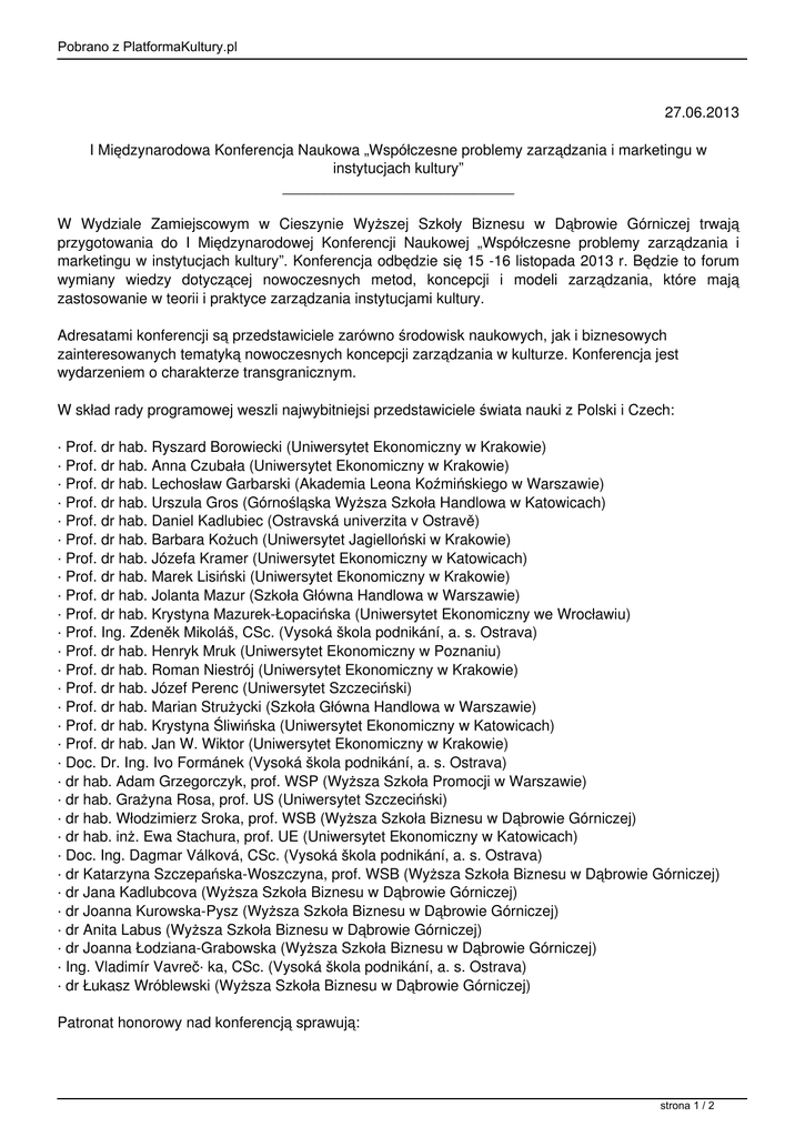 Pobrano z PlatformaKultury.pl 27.06.2013 I Międzynarodowa Konferencja Naukowa „Współczesne problemy zarządzania i marketingu w instytucjach kultury” ____________________________ W Wydziale Zamiejscowym w Cieszynie Wyższej Szkoły Biznesu w Dąbrowie Górniczej trwają przygotowania do I Międzynarodowej Konferencji Naukowej „Współczesne problemy zarządzania i marketingu w instytucjach kultury”. Konferencja odbędzie się 15 -16 listopada 2013 r. Będzie to forum wymiany wiedzy dotyczącej nowoczesnych metod, koncepcji i modeli zarządzania, które mają zastosowanie w teorii i praktyce zarządzania instytucjami kultury. Adresatami konferencji są przedstawiciele zarówno środowisk naukowych, jak i biznesowych zainteresowanych tematyką nowoczesnych koncepcji zarządzania w kulturze. Konferencja jest wydarzeniem o charakterze transgranicznym. W skład rady programowej weszli najwybitniejsi przedstawiciele świata nauki z Polski i Czech: · Prof. dr hab. Ryszard Borowiecki (Uniwersytet Ekonomiczny w Krakowie) · Prof. dr hab. Anna Czubała (Uniwersytet Ekonomiczny w Krakowie) · Prof. dr hab. Lechosław Garbarski (Akademia Leona Koźmińskiego w Warszawie) · Prof. dr hab. Urszula Gros (Górnośląska Wyższa Szkoła Handlowa w Katowicach) · Prof. dr hab. Daniel Kadlubiec (Ostravská univerzita v Ostravě) · Prof. dr hab. Barbara Kożuch (Uniwersytet Jagielloński w Krakowie) · Prof. dr hab. Józefa Kramer (Uniwersytet Ekonomiczny w Katowicach) · Prof. dr hab. Marek Lisiński (Uniwersytet Ekonomiczny w Krakowie) · Prof. dr hab. Jolanta Mazur (Szkoła Główna Handlowa w Warszawie) · Prof. dr hab. Krystyna Mazurek-Łopacińska (Uniwersytet Ekonomiczny we Wrocławiu) · Prof. Ing. Zdeněk Mikoláš, CSc. (Vysoká škola podnikání, a. s. Ostrava) · Prof. dr hab. Henryk Mruk (Uniwersytet Ekonomiczny w Poznaniu) · Prof. dr hab. Roman Niestrój (Uniwersytet Ekonomiczny w Krakowie) · Prof. dr hab. Józef Perenc (Uniwersytet Szczeciński) · Prof. dr hab. Marian Strużycki (Szkoła Główna Handlowa w Warszawie) · Prof. dr hab. Krystyna Śliwińska (Uniwersytet Ekonomiczny w Katowicach) · Prof. dr hab. Jan W. Wiktor (Uniwersytet Ekonomiczny w Krakowie) · Doc. Dr. Ing. Ivo Formánek (Vysoká škola podnikání, a. s. Ostrava) · dr hab. Adam Grzegorczyk, prof. WSP (Wyższa Szkoła Promocji w Warszawie) · dr hab. Grażyna Rosa, prof. US (Uniwersytet Szczeciński) · dr hab. Włodzimierz Sroka, prof. WSB (Wyższa Szkoła Biznesu w Dąbrowie Górniczej) · dr hab. inż. Ewa Stachura, prof. UE (Uniwersytet Ekonomiczny w Katowicach) · Doc. Ing. Dagmar Válková, CSc. (Vysoká škola podnikání, a. s. Ostrava) · dr Katarzyna Szczepańska-Woszczyna, prof. WSB (Wyższa Szkoła Biznesu w Dąbrowie Górniczej) · dr Jana Kadlubcova (Wyższa Szkoła Biznesu w Dąbrowie Górniczej) · dr Joanna Kurowska-Pysz (Wyższa Szkoła Biznesu w Dąbrowie Górniczej) · dr Anita Labus (Wyższa Szkoła Biznesu w Dąbrowie Górniczej) · dr Joanna Łodziana-Grabowska (Wyższa Szkoła Biznesu w Dąbrowie Górniczej) · Ing. Vladimír Vavreč· ka, CSc. (Vysoká škola podnikání, a. s. Ostrava) · dr Łukasz Wróblewski (Wyższa Szkoła Biznesu w Dąbrowie Górniczej) Patronat honorowy nad konferencją sprawują: strona 1 / 2 Pobrano z PlatformaKultury.pl Rektor Wyższej Szkoły Biznesu w Dąbrowie Górniczej Ministerstwo Kultury i Dziedzictwa Narodowego Narodowe Centrum Kultury Polska Akademia Umiejętności Polskie Towarzystwo Ekonomiczne Śląskie Towarzystwo Marketingowe Stowarzyszenie Menedżerów Kultury Polski Związek Kulturalno – Oświatowy Starosta Powiatu Cieszyńskiego Burmistrz Cieszyna W ramach Konferencji planuje się wydanie monografii naukowej zawierającej najważniejsze tematy poruszane podczas wykładów. Artykuły przyjmowane są do 20 września. Zgłoszenia udziału w Konferencji przyjmowane są do 31 lipca. Jest to również termin wniesienia opłaty uczestnictwa w Konferencji. Szczegóły na stronie internetowej konferencji www.wsb.edu.pl/kultura Biuro Organizacyjne Konferencji Wyższa Szkoła Biznesu w Dąbrowie Górniczej Wydział Zamiejscowy w Cieszynie ul. Frysztacka 44, 43-400 Cieszyn tel. 33 851 02 81, +48 727 558 850 e-mail: [email protected], [email protected] strona 2 / 2