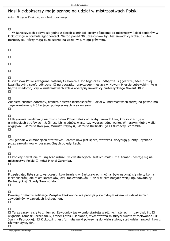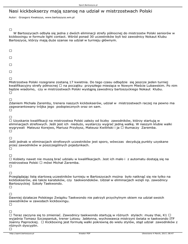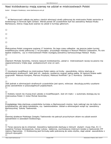 Sport.Bartoszyce.pl Nasi kickbokserzy mają szansę na udział w mistrzostwach Polski Autor: Grzegorz Kwakszys, www.bartoszyce.wm.pl W Bartoszycach odbyła się jedna z dwóch eliminacji strefy północnej do mistrzostw Polski seniorów w kickboxingu w formule light contact. Wśród ponad 30 uczestników byli też zawodnicy Nokaut Klubu Bartoszyce, którzy mają duże szanse na udział w turnieju głównym. Mistrzostwa Polski rozegrane zostaną 17 kwietnia. Do tego czasu odbędzie się jeszcze jeden turniej kwalifikacyjny strefy północnej na początku przyszłego miesiąca w Nowym Mieście Lubawskim. Po nim będzie wiadomo, czy w mistrzostwach Polski wystąpią zawodnicy bartoszyckiego Nokaut Klubu. Zdaniem Michała Zaremby, trenera naszych kickbokserów, udział w mistrzostwach raczej na pewno ma zagwarantowany trójka jego podopiecznych oraz on sam. Uzyskanie kwalifikacji na mistrzostwa Polski zależy od liczby zawodników, którzy startują w eliminacjach strefowych. Jeśli jest ich niedużo, wystarczy wygrać jedną walkę. W naszym klubie walki wygrywali Mateusz Korejwo, Mariusz Przybysz, Mateusz Kwiliński i ja tłumaczy Zaremba. Jeśli jednak w eliminacjach strefowych uczestników jest sporo, wówczas decydują punkty uzyskane przez zawodników w poszczególnych pojedynkach. Kobiety nawet nie muszą brać udziału w kwalifikacjach. Jest ich mało i z automatu dostają się na mistrzostwa Polski mówi Michał Zaremba. Przeglądając listę startową uczestników turnieju w Bartoszycach można było natknąć się nie tylko na kickbokserów, ale także karateków, czy taekwondoków. Udział w eliminacjach wzięli np. zawodnicy Bartoszyckiej Szkoły Taekwondo. Dawniej działacze Polskiego Związku Taekwondo nie patrzyli przychylnym okiem na udział swoich zawodników w zawodach kickboxingu. Teraz zaczyna się to zmieniać. Zawodnicy taekwondo startują w różnych stylach: muay thai, K1 wyjaśnia Tomasz Szczepaniuk, trener Lotosu Jabłonna, wychowawca mistrzyni świata w taekwondo ITF Joanny Paprockiej. Kickboxing jest formułą walki pokrewną do wielu stylów, stąd udział zawodników z różnych dyscyplin. http://sport.bartoszyce.pl Kreator PDF Utworzono 4 March, 2017, 08:47 Sport.Bartoszyce.pl Turniej eliminacyjny w Bartoszycach zorganizowano dzięki wsparciu DM Studio Reklamy oraz Al-Med. Wyniki Mężczyźni -57 kg 1. Piotr Łuszcz (Tajfun Legionowo) 2. Łukasz Michałowski (Gołdap) -63 kg 1. Damian Kowalczyk (KSW Szczecinek) 2. Patryk Hospodar (Elbląski Klub Karate) 3. Paweł Pietrzak (Start Działdowo) -69 kg 1. Adrian Durma (Elbląski Klub Karate) 2. Mariusz Paruzel (Elbląski Klub Karate) 3. Karol Wierzejski (Start Działdowo) 3. Paweł Mikołajczak (KSW Szczecinek) -74 kg 1. Paweł Biernat (Tajfun Legionowo) 2. Marcin Dołęgowski (Tajfun Legionowo) http://sport.bartoszyce.pl Kreator PDF Utworzono 4 March, 2017, 08:47 Sport.Bartoszyce.pl 3. Marcin Jeleniewicz (Elbląski Klub Karate) -79 kg 1. Mateusz Korejwo (Nokaut Klub Kickboxing Bartoszyce) 2. Mateusz Kwiliński (Nokaut Klub Kickboxing Bartoszyce) 3. Marek Derdowski (Elbląski Klub Karate) 3. Piotr Kułak (Megatron Ełk) -84 kg 1. Krzysztof Zdancewicz (Elbląski Klub Karate) 2. Michał Zaremba (Nokaut Klub Kickboxing Bartoszyce) 3. Grzegorz Siwicki ((Nokaut Klub Kickboxing Bartoszyce) -89 kg 1. Łukasz Bieńkowski (Tajfun Legionowo) 2. Artur Zieliński (Elbląski Klub Karate) 3. Mariusz Przybysz (Nokaut Klub Kickboxing Bartoszyce) 3. Tomasz Makuch (Megatron Ełk) -94 kg 1. Wojciech Nieściur (Megatron Ełk) http://sport.bartoszyce.pl Kreator PDF Utworzono 4 March, 2017, 08:47 Sport.Bartoszyce.pl 2. Łukasz Pawłowski (KSW Szczecinek) +94 kg 1. Łukasz Borkowski (Megatron Ełk) Kobiety -60 kg 1. Żaneta Cieśla (Polonia Pasłęk) 2. Paula Błaszczyk (Nokaut Klub Kickboxing Bartoszyce) 3. Marta Kwilińska (Nokaut Klub Kickboxing Bartoszyce) Walki juniorów -74 kg 1. Kamil Jarecki (Elbląski Klub Karate) 2. Michał Ponichtera (Polonia Pasłęk) 3. Jakub Oller (Elbląski Klub Karate) -79 kg 1. Karol Karczewski (Polonia Pasłęk) 2. Mateusz Kwiliński (Nokaut Klub Kickboxing Bartoszyce) Grzegorz Kwakszys [email protected] {gallery}zawody_kickboxing_5_02_2011{/gallery} http://sport.bartoszyce.pl Kreator PDF Utworzono 4 March, 2017, 08:47