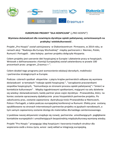 EUROPEJSKI PROJEKT "DLA HOSPICJUM" („PRO HOSPIZ”) Wymiana doświadczeo dla rozwinięcia dyrektyw opieki paliatywnej, zorientowanych na praktykę i wielokulturowość . Projekt „Pro Hozpiz” został zainicjowany w Diakoniezentrum Pirmasens, w 2014 roku, w ramach akcji "Nadzieja dla Europy Wschodniej” między partnerami z Niemiec, Polski, Rumunii i Portugalii . Jako kolejny partner projektu dołączyła Hiszpania. Celem projektu jest szerzenie idei hospicyjnej w Europie i ułatwienie pracy w hospicjach. Wniosek o dofinansowanie z Komisji Europejskiej został zatwierdzony w prawie 100 procentach przez program „Erasmus + ". Celem działao tego programu jest wzmocnienie edukacji dorosłych, mobilności i partnerstw strategicznych w Europie. Podczas czterech spotkao ekspertów z pięciu krajów partnerskich odbywa się wymiana doświadczeo w tematach "rodzaje opieki hospicyjnej ", "zarządzanie pracownikami zespołów hospicyjnych, "komunikacja ze stronami procesu opieki paliatywnej" i "śmierd w kontekście kulturowym" . Między tygodniowymi spotkaniami, mającymi na celu dzielenie się wiedzą i doświadczeniami, każdy partner pisze części dyrektyw - Przewodnika, który na koniec zostanie opracowany dydaktycznie przez hiszpaoskich partnerów projektu. Po zakooczeniu prac, zostanie zapewniona dystrybucja treści Przewodnika w Niemczech, Polsce i Portugalii, a także podczas europejskiej konferencji w Rumunii. Efekty prac zostaną opublikowane na stronach internetowych partnerów projektu w językach narodowych, a tym samym zapewniony zostanie dostęp do materiałów dla każdego zainteresowanego. U podstaw naszej aktywności znajduje się rozwój partnerstw umożliwiających pogłębianie kontaktów europejskich i umożliwiających bezpośrednią międzykulturową wymianę wiedzy. Projekt "Pro Hospiz " propagując ideę hospicjum i tworzenia trwałych struktur dla wspierania osób u kresu życia, wnosi swój wkład w integrację europejską. Diakoniezentrum Pirmasens Diakoniezentrum Pirmasens powstało w 1853 roku jako wspólnota wspierająca i dom dla osieroconych dzieci. W międzyczasie przekształciło się w obiekt służący ludziom w różnym wieku: w znacznej części dla wspierania osób starych i młodzieży w regionie południowozachodniego Palatynatu. Diakoniezentrum stworzyło hospicjum Haus Magdalena, gdzie zapewnia opiekę ludziom nieuleczalnie chorym. Celem pracy hospicyjnej jest realizacja potrzeb i oczekiwao osób śmiertelnie chorych i realizowanie ich w takim zakresie w jakim jest to możliwe. Jest to jedyna tego typu placówka w zachodnim Palatynacie. Tutaj ludzie doświadczają najlepszej możliwej jakości życia do jego kooca. Rumunia Chrześcijaoska Fundacja Diakonia Kościoła Reformowanego Transylwanii powstała w 2001 roku. Jako organizacja humanitarna, oferuje pomoc dla środowisk zagrożonych, znajdujących się w trudnej sytuacji socjalnej. Od dwunastu lat oferuje dzieło pomocy rodzinie i pomoc ambulatoryjną w 48 wsiach i trzech miastach w okręgu Covasna. Ponadto Fundacja angażuje się w różnorodne programy wymiany z zagranicznymi organizacjami partnerskimi. Obecnie organizacja prowadzi certyfikowane szkolenia na rzecz paostwa, szkolenia specjalistyczne, specjalistyczne wymiany dla pielęgniarek i kształcenie dorosłych w zakresie pielęgnacji osób starych. W 2011 w Sankt Georgen rozpoczęto przygotowania do budowy wielofunkcyjnego centrum wsparcia socjalnego, w którym oprócz ośrodka opieki nad osobami starszymi i oddziału dla pacjentów z demencją mają także znaleźd się oddziały do pielęgnacji i opieki hospicyjnej. Portugalia Niemiecka Ewangelicka Wspólnota Porto została założona w 1901 przez niemieckich imigrantów. Od 1956 roku, wspólnota związana jest z Ewangelickim Kościołem w Niemczech (EKD). We współpracy z Kościołem Luzytaoskim, będącym częścią Wspólnoty Anglikaoskiej w Portugalii, został opracowany program szkolenia, jak pomóc ludziom, aby potrafili pomóc sobie sami. Ma to pomóc ludziom pozbawionym środków do życia w reintegracji i zapewnieniu lepszych warunków dla poszukiwania pracy. W realiach związanych z cięciami i restrykcjami w portugalskim systemie opieki społecznej i zdrowotnej w wyniku kryzysu finansowego ambulatoryjna opieka hospicyjna stawia sobie za cel poprawę opieki paliatywnej chorych w ich środowisku domowym oraz zapewnienie pomocy rodzinom chorych. Polska Fundacja Podlaskie Hospicjum Onkologiczne została powołana do życia w 2009 r. w Warszawie. Jej celem jest zapewnienie opieki paliatywnej nieuleczalnie chorym, szczególnie na choroby nowotworowe, a także ich bliskim. Hospicjum w Nowej Woli jest jedynym hospicjum w Polsce mającym siedzibę na obszarach wiejskich i finansowane jest w dużej części z działao charytatywnych. Celem działao hospicjum jest także pomoc osobom opiekującym się chorymi w domu, personelowi medycznemu oraz wolontariuszom. Od 2010 roku, w siedzibie Fundacji działa także warsztat dla osób niepełnosprawnych. 30 osób - najczęściej młodych ludzi z regionu jest pod opieką zespołu, który organizuje zajęcia mające na celu integrację psychiczną i emocjonalną osób niepełnosprawnych . Hiszpania Uniwersytet w La Coruña (UDC), założony w 1989 roku, jest publicznym uniwersytetem w Galicji w północno-zachodniej Hiszpanii. W 2001 roku, UDC przyłączył uniwersytet dla seniorów, który oferuje osobom po 50 roku życia możliwośd przekwalifikowania się w przypadku bezrobocia oraz poszerzania swojej wiedzy i umiejętności zgodnie z zainteresowaniami. Ponad 700 seniorów skorzystało z tej oferty. Rozwijają się oni w wielu dziedzinach: sztuki, nauk społecznych i opieki zdrowotnej. Uniwersytet dla seniorów od 2003 roku bierze udział w projektach europejskich i współpracuje z innymi instytucjami w kształceniu dorosłych na szczeblu lokalnym, regionalnym, krajowym i międzynarodowym.