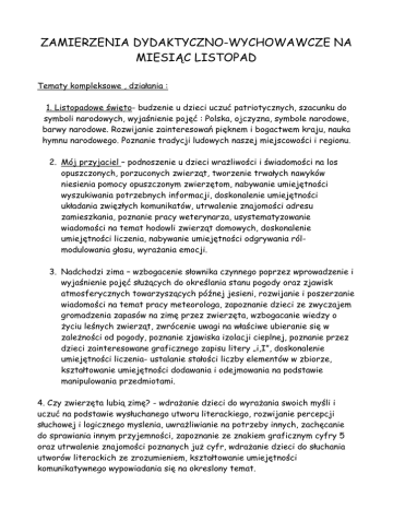 ZAMIERZENIA DYDAKTYCZNO-WYCHOWAWCZE NA MIESIĄC LISTOPAD Tematy kompleksowe , działania : 1. Listopadowe święto- budzenie u dzieci uczuć patriotycznych, szacunku do symboli narodowych, wyjaśnienie pojęć : Polska, ojczyzna, symbole narodowe, barwy narodowe. Rozwijanie zainteresowań pięknem i bogactwem kraju, nauka hymnu narodowego. Poznanie tradycji ludowych naszej miejscowości i regionu. 2. Mój przyjaciel – podnoszenie u dzieci wrażliwości i świadomości na los opuszczonych, porzuconych zwierząt, tworzenie trwałych nawyków niesienia pomocy opuszczonym zwierzętom, nabywanie umiejętności wyszukiwania potrzebnych informacji, doskonalenie umiejętności układania zwięzłych komunikatów, utrwalenie znajomości adresu zamieszkania, poznanie pracy weterynarza, usystematyzowanie wiadomości na temat hodowli zwierząt domowych, doskonalenie umiejętności liczenia, nabywanie umiejętności odgrywania rólmodulowania głosu, wyrażania emocji. 3. Nadchodzi zima – wzbogacenie słownika czynnego poprzez wprowadzenie i wyjaśnienie pojęć służących do określania stanu pogody oraz zjawisk atmosferycznych towarzyszących późnej jesieni, rozwijanie i poszerzanie wiadomości na temat pracy meteorologa, zapoznanie dzieci ze zwyczajem gromadzenia zapasów na zimę przez zwierzęta, wzbogacanie wiedzy o życiu leśnych zwierząt, zwrócenie uwagi na właściwe ubieranie się w zależności od pogody, poznanie zjawiska izolacji cieplnej, poznanie przez dzieci zainteresowane graficznego zapisu litery „i,I”, doskonalenie umiejętności liczenia- ustalanie stałości liczby elementów w zbiorze, kształtowanie umiejętności dodawania i odejmowania na podstawie manipulowania przedmiotami. 4. Czy zwierzęta lubią zimę? - wdrażanie dzieci do wyrażania swoich myśli i uczuć na podstawie wysłuchanego utworu literackiego, rozwijanie percepcji słuchowej i logicznego myslenia, uwrażliwianie na potrzeby innych, zachęcanie do sprawiania innym przyjemności, zapoznanie ze znakiem graficznym cyfry 5 oraz utrwalenie znajomości poznanych już cyfr, wdrażanie dzieci do słuchania utworów literackich ze zrozumieniem, kształtowanie umiejętności komunikatywnego wypowiadania się na okreslony temat.
