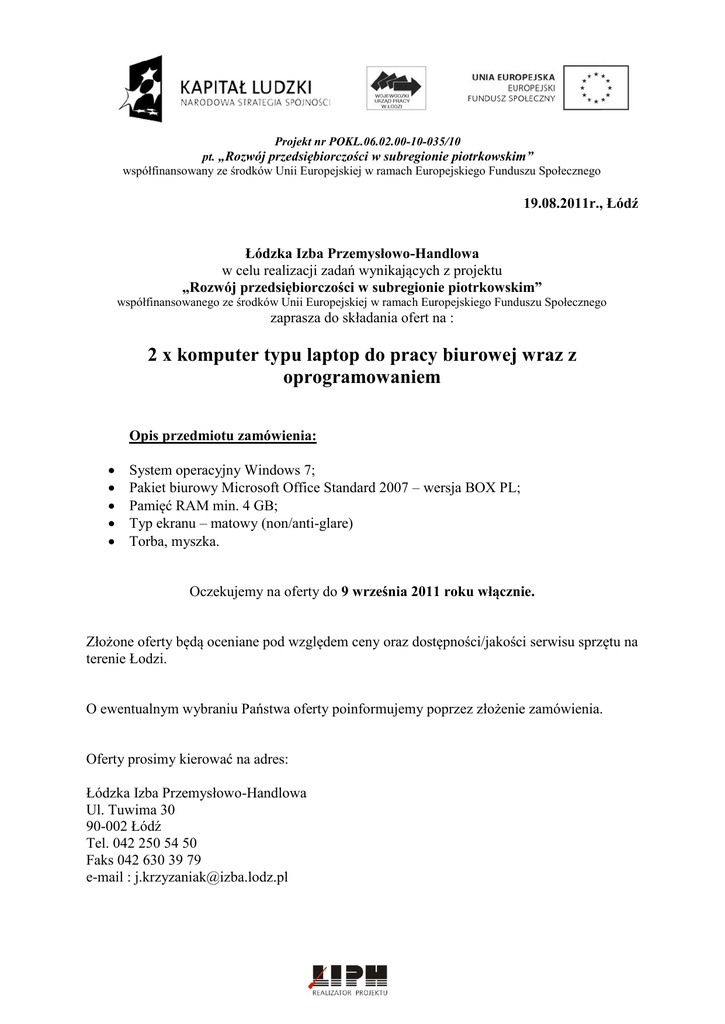 Projekt nr POKL.06.02.00-10-035/10 pt. „Rozwój przedsiębiorczości w subregionie piotrkowskim” współfinansowany ze środków Unii Europejskiej w ramach Europejskiego Funduszu Społecznego 19.08.2011r., Łódź Łódzka Izba Przemysłowo-Handlowa w celu realizacji zadań wynikających z projektu „Rozwój przedsiębiorczości w subregionie piotrkowskim” współfinansowanego ze środków Unii Europejskiej w ramach Europejskiego Funduszu Społecznego zaprasza do składania ofert na : 2 x komputer typu laptop do pracy biurowej wraz z oprogramowaniem Opis przedmiotu zamówienia: System operacyjny Windows 7; Pakiet biurowy Microsoft Office Standard 2007 – wersja BOX PL; Pamięć RAM min. 4 GB; Typ ekranu – matowy (non/anti-glare) Torba, myszka. Oczekujemy na oferty do 9 września 2011 roku włącznie. Złożone oferty będą oceniane pod względem ceny oraz dostępności/jakości serwisu sprzętu na terenie Łodzi. O ewentualnym wybraniu Państwa oferty poinformujemy poprzez złożenie zamówienia. Oferty prosimy kierować na adres: Łódzka Izba Przemysłowo-Handlowa Ul. Tuwima 30 90-002 Łódź Tel. 042 250 54 50 Faks 042 630 39 79 e-mail : [email protected]