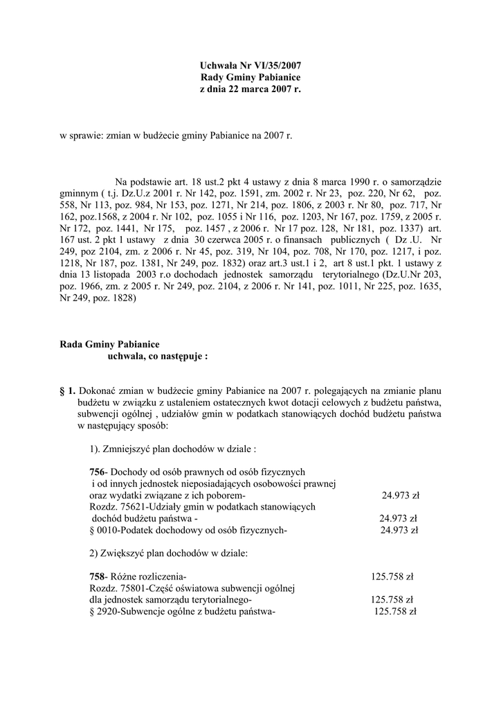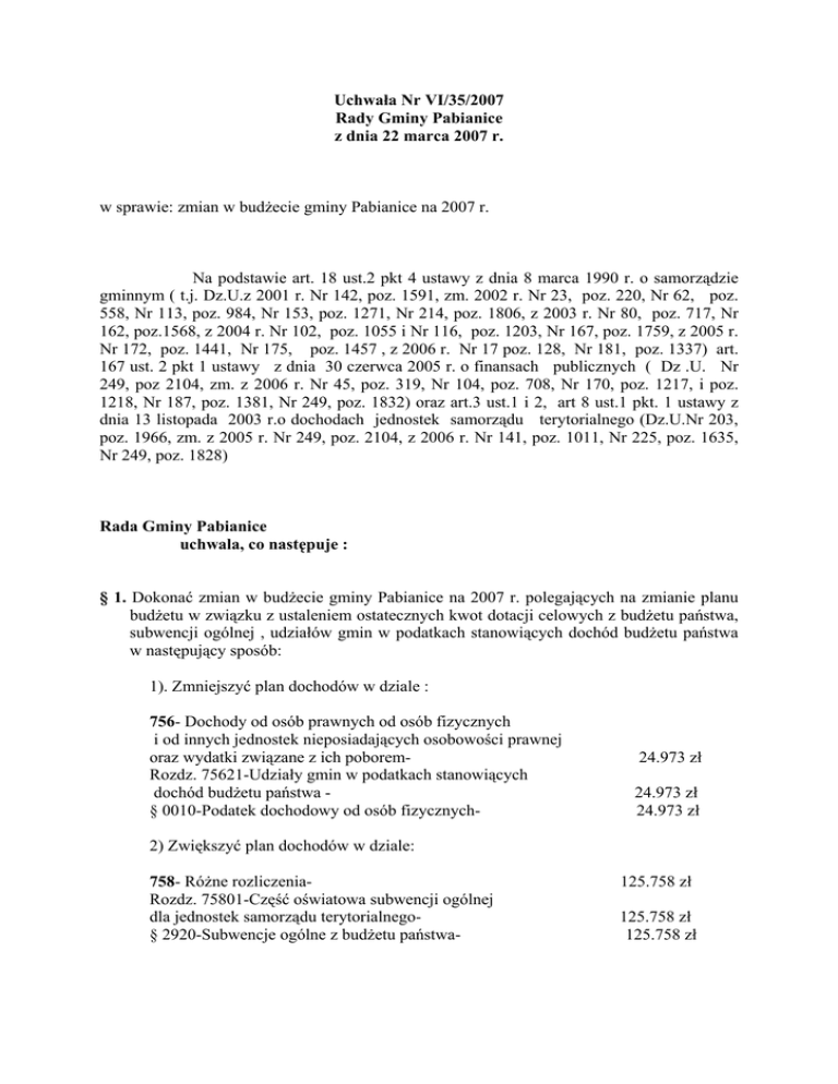 Uchwała Nr VI/35/2007 Rady Gminy Pabianice z dnia 22 marca 2007 r. w sprawie: zmian w budżecie gminy Pabianice na 2007 r. Na podstawie art. 18 ust.2 pkt 4 ustawy z dnia 8 marca 1990 r. o samorządzie gminnym ( t.j. Dz.U.z 2001 r. Nr 142, poz. 1591, zm. 2002 r. Nr 23, poz. 220, Nr 62, poz. 558, Nr 113, poz. 984, Nr 153, poz. 1271, Nr 214, poz. 1806, z 2003 r. Nr 80, poz. 717, Nr 162, poz.1568, z 2004 r. Nr 102, poz. 1055 i Nr 116, poz. 1203, Nr 167, poz. 1759, z 2005 r. Nr 172, poz. 1441, Nr 175, poz. 1457 , z 2006 r. Nr 17 poz. 128, Nr 181, poz. 1337) art. 167 ust. 2 pkt 1 ustawy z dnia 30 czerwca 2005 r. o finansach publicznych ( Dz .U. Nr 249, poz 2104, zm. z 2006 r. Nr 45, poz. 319, Nr 104, poz. 708, Nr 170, poz. 1217, i poz. 1218, Nr 187, poz. 1381, Nr 249, poz. 1832) oraz art.3 ust.1 i 2, art 8 ust.1 pkt. 1 ustawy z dnia 13 listopada 2003 r.o dochodach jednostek samorządu terytorialnego (Dz.U.Nr 203, poz. 1966, zm. z 2005 r. Nr 249, poz. 2104, z 2006 r. Nr 141, poz. 1011, Nr 225, poz. 1635, Nr 249, poz. 1828) Rada Gminy Pabianice uchwala, co następuje : § 1. Dokonać zmian w budżecie gminy Pabianice na 2007 r. polegających na zmianie planu budżetu w związku z ustaleniem ostatecznych kwot dotacji celowych z budżetu państwa, subwencji ogólnej , udziałów gmin w podatkach stanowiących dochód budżetu państwa w następujący sposób: 1). Zmniejszyć plan dochodów w dziale : 756- Dochody od osób prawnych od osób fizycznych i od innych jednostek nieposiadających osobowości prawnej oraz wydatki związane z ich poboremRozdz. 75621-Udziały gmin w podatkach stanowiących dochód budżetu państwa § 0010-Podatek dochodowy od osób fizycznych- 24.973 zł 24.973 zł 24.973 zł 2) Zwiększyć plan dochodów w dziale: 758- Różne rozliczeniaRozdz. 75801-Część oświatowa subwencji ogólnej dla jednostek samorządu terytorialnego§ 2920-Subwencje ogólne z budżetu państwa- 125.758 zł 125.758 zł 125.758 zł 852-Pomoc społecznaRozdz. 85212- Świadczenia rodzinne , zaliczka alimentacyjna oraz składki na ubezpieczenia emerytalne i rentowe z ubezpieczenia społecznego§ 2010- Dotacje celowe otrzymane z budżetu państwa na realizację zadań bieżących z zakresu administracji rządowej oraz innych zadań zleconych gminie ustawamiRozdz.85213- Składki na ubezpieczenia zdrowotne opłacane za osoby pobierające niektóre świadczenia z pomocy społecznej § 2010- Dotacje celowe otrzymane z budżetu państwa na realizację zadań bieżących z zakresu administracji rządowej oraz innych zadań zleconych gminie ustawamiRozdz. 85214- Zasiłki i pomoc w naturze oraz składki na ubezpieczenia emerytalne i rentopwe§ 2010- Dotacje celowe otrzymane z budżetu państwa na realizację zadań bieżących z zakresu administracji rządowej oraz innych zadań zleconych gminie ustawami§ 2030- Dotacje celowe otrzymane z budżetu państwa na realizację własnych zadań bieżących gminRozdz. 85295-Pozostała działalność§ 2030- Dotacje celowe otrzymane z budżetu państwa na realizację własnych zadań bieżących gmin- 76.752 zł 33.095 zł 33.095 zł 2.607 zł 2.607 zł 23.641 zł 20.533 zł 3.108 zł 17.409 zł 17.409 zł 3. Zwiększyć plan wydatków w dziale : 801-Oświata i wychowanie Rozdz. 80101-Szkoły podstawowe§ 4010-Wynagrodzenia osobowe pracowników§ 4110-Składki na ubezpieczenia społeczne § 4120-Składki na Fundusz Pracy- 100.785 zł 59.492 zł 49.547 zł 8.705 zł 1.240 zł Rozdz. 80103-Oddziały przedszkolne w szkołach podstawowych§ 4010-Wynagrodzenia osobowe pracowników§ 4110-Składki na ubezpieczenia społeczne§ 4120-Składki na Fundusz Pracy- 5.142 zł 4.305 zł 732 zł 105 zł Rozdz. 80104- Przedszkola§ 4010-Wynagrodzenia osobowe pracowników§ 4110-Składki na ubezpieczenia społeczne§ 4120-Składki na Fundusz Pracy - 9.556 zł 8.000 zł 1.360 zł 196 zł Rozdz. 80110-Gimnazja § 4010-Wynagrodzenia osobowe pracowników§ 4110-Składki na ubezpieczenia społeczne§ 4120-Składki na Fundusz Pracy- 26.595 zł 22.250 zł 3.800 zł 545 zł Dział : 852- Pomoc społeczna - 76.752 zł Rozdz. 85212- Świadczenia rodzinne , zaliczka alimentacyjna oraz składki na ubezpieczenia emerytalne i rentowe z ubezpieczenia społecznego§ 3110-Świadczenia społeczne § 4010-Wynagrodzenia osobowe pracowników§ 4110-Składki na ubezpieczenia społeczne§ 4120-Składki na Fundusz Pracy- 33.095 zł 32.102 zł 826 zł 146 zł 21 zł Rozdz.85213- Składki na ubezpieczenia zdrowotne opłacane za osoby pobierające niektóre świadczenia z pomocy społecznej § 4130-Składki na ubezpieczenia zdrowotneRozdz. 85214- Zasiłki i pomoc w naturze oraz składki na ubezpieczenia emerytalne i rentowe§ 3110-Świadczenia społeczne ( zad. zlec. -20.533 zł, 3.108 zad. własne) Rozdz. 85295-Pozostała działalność§ 3110-Świadczenia społeczne(zad. wł. dożywianie uczniów w szkołach) 2.607 zł 2.607 zł 23.641 zł 23.641 zł 17.409 zł 17.409 zł § 2. Wykonanie uchwały powierzyć Wójtowi Gminy Pabianice. § 3. Uchwała wchodzi w życie z dniem podjęcia i podlega ogłoszeniu w trybie przewidzianym dla aktów prawa miejscowego.