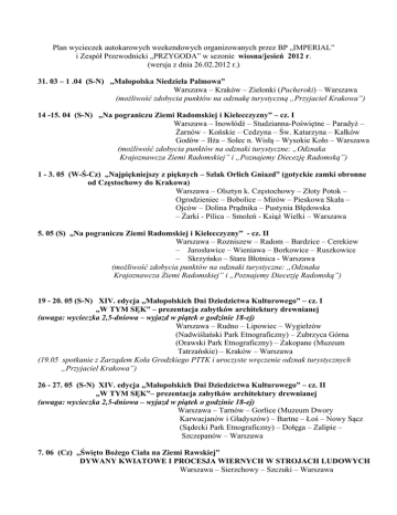 Plan wycieczek autokarowych weekendowych organizowanych przez BP „IMPERIAL” i Zespół Przewodnicki „PRZYGODA” w sezonie wiosna/jesień 2012 r. (wersja z dnia 26.02.2012 r.) 31. 03 – 1 .04 (S-N) „Małopolska Niedziela Palmowa” Warszawa – Kraków – Zielonki (Pucheroki) – Warszawa (możliwość zdobycia punktów na odznakę turystyczną „Przyjaciel Krakowa”) 14 -15. 04 (S-N) „Na pograniczu Ziemi Radomskiej i Kielecczyzny” – cz. I Warszawa – Inowłódź – Studzianna-Poświętne – Paradyż – Żarnów – Końskie – Cedzyna – Św. Katarzyna – Kałków Godów – Iłża – Solec n. Wisłą – Wysokie Koło – Warszawa (możliwość zdobycia punktów na odznaki turystyczne: „Odznaka Krajoznawcza Ziemi Radomskiej” i „Poznajemy Diecezję Radomską”) 1 - 3. 05 (W-Ś-Cz) „Najpiękniejszy z pięknych – Szlak Orlich Gniazd” (gotyckie zamki obronne od Częstochowy do Krakowa) Warszawa – Olsztyn k. Częstochowy – Złoty Potok – Ogrodzieniec – Bobolice – Mirów – Pieskowa Skała – Ojców – Dolina Prądnika – Pustynia Błędowska – Żarki - Pilica – Smoleń - Książ Wielki – Warszawa 5. 05 (S) „Na pograniczu Ziemi Radomskiej i Kielecczyzny” - cz. II Warszawa – Rozniszew – Radom – Bardzice – Cerekiew – Jarosławice – Wieniawa – Borkowice – Ruszkowice – Skrzyńsko – Stara Błotnica - Warszawa (możliwość zdobycia punktów na odznaki turystyczne: „Odznaka Krajoznawcza Ziemi Radomskiej” i „Poznajemy Diecezję Radomską”) 19 - 20. 05 (S-N) XIV. edycja „Małopolskich Dni Dziedzictwa Kulturowego” – cz. I „W TYM SĘK” – prezentacja zabytków architektury drewnianej (uwaga: wycieczka 2,5-dniowa – wyjazd w piątek o godzinie 18-ej) Warszawa – Rudno – Lipowiec – Wygiełzów (Nadwiślański Park Etnograficzny) – Zubrzyca Górna (Orawski Park Etnograficzny) – Zakopane (Muzeum Tatrzańskie) – Kraków – Warszawa (19.05 spotkanie z Zarządem Koła Grodzkiego PTTK i uroczyste wręczenie odznak turystycznych „Przyjaciel Krakowa”) 26 - 27. 05 (S-N) XIV. edycja „Małopolskich Dni Dziedzictwa Kulturowego” – cz. II „W TYM SĘK”– prezentacja zabytków architektury drewnianej (uwaga: wycieczka 2,5-dniowa – wyjazd w piątek o godzinie 18-ej) Warszawa – Tarnów – Gorlice (Muzeum Dwory Karwacjanów i Gładyszów) – Bartne – Łoś – Nowy Sącz (Sądecki Park Etnograficzny) – Dołęga – Zalipie – Szczepanów – Warszawa 7. 06 (Cz) „Święto Bożego Ciała na Ziemi Rawskiej” DYWANY KWIATOWE I PROCESJA WIERNYCH W STROJACH LUDOWYCH Warszawa – Sierzchowy – Szczuki – Warszawa 30. 06 (S) „Świątynie Ziemi Sierpeckiej” Warszawa – Sierpc i Trutowy (zespoły kościelno-klasztorne) – Skępe-Wymyślin i Żurawin (sanktuaria) – Mochowo (unikalny kościół drewniany w stylu klasycystycznym) – Drobin i Łęg Probostwo (kościoły w stylu gotyku mazowieckiego z bogatym wyposażeniem) 7 - 8. 07 (S-N) „Zielone Płuca Polski – Puszcza Kurpiowska” Warszawa – Ostrołęka – Kadzidło – Myszyniec – Czarnia – Lelis - Łyse – Nowogród – Łomża – Drozdowo – Piątnica – Warszawa 21 - 22. 07 (S-N) „W Toruniu i na Szlaku Piastowskim” Warszawa – Toruń – Gniewkowo – Lubostroń – Żnin - Wenecja – Biskupin – Gąsawa – Marcinkowo Górne - Warszawa Uwaga! wycieczka roku !!!!! 11 - 15. 08 (S-N-P-W-Ś) „Małopolskie zamki, dwory, kościoły oraz Szlak Architektury Drewnianej. Noc klasztorów - Cracovia Sacra” Warszawa – Kolbuszowa – Rzeszów – Stara Wieś – Brzozów – Bóbrka – Żarnowiec – Krosno – Miejsce Piastowe - Odrzykoń - Haczów – Kraków (Noc klasztorów) – Warszawa 25 - 26. 08 (S-N) „Klasycystyczne rezydencje magnackie w Wielkopolsce” Warszawa – Ciążeń – Dobrzyca – Kalisz – Lewków – Tubądzin - Warszawa 8 - 9. 09 (S-N) „Statkiem po trawie – Kanał Elbląsko – Ostródzki” Warszawa – Ostróda – Zielonka Pasłęcka – Jelenie – Elbląg – rejs statkiem: Jezioro Drużno – pięć pochylni – Buczyniec – Miłomłyn – Nidzica – Warszawa 22 – 23. 09 (S-N) „Świętokrzyski Szlak Zabytków Techniki. Miasto Ojca Mateusza – Sandomierz” Warszawa – Drzewica – Gielniów – Ruda Maleniecka – Sielpia Wielka – Skarżysko Kamienna – Wąchock – Ostrowiec Świętokrzyski – Sandomierz – Piotrawin – Opole Lubelskie – Wojciechów – Nałęczów - Warszawa Organizatorzy zastrzegają sobie możliwości zmian w programie. Dodatkowe informacje: u koordynatora imprez Marka Piaseckiego tel. 0 - 603 404 213 i w B.P. „Imperial” (Warszawa, ul. Ogrodowa 67 tel. 22 654 – 89 - 89).