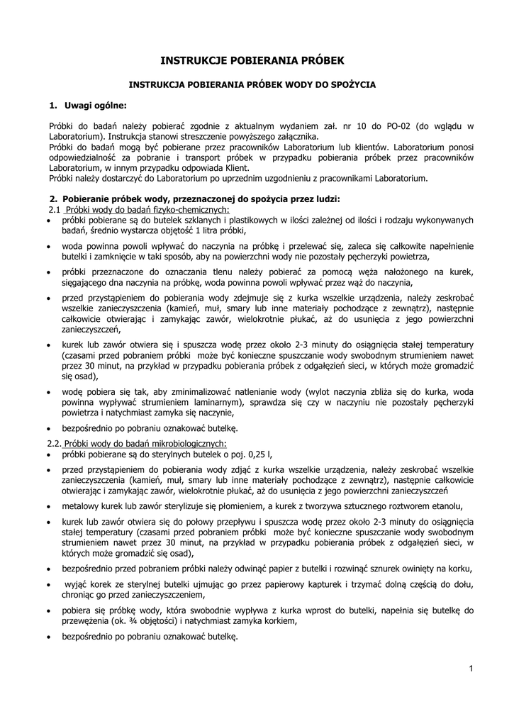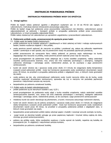 INSTRUKCJE POBIERANIA PRÓBEK INSTRUKCJA POBIERANIA PRÓBEK WODY DO SPOŻYCIA 1. Uwagi ogólne: Próbki do badań należy pobierać zgodnie z aktualnym wydaniem zał. nr 10 do PO-02 (do wglądu w Laboratorium). Instrukcja stanowi streszczenie powyższego załącznika. Próbki do badań mogą być pobierane przez pracowników Laboratorium lub klientów. Laboratorium ponosi odpowiedzialność za pobranie i transport próbek w przypadku pobierania próbek przez pracowników Laboratorium, w innym przypadku odpowiada Klient. Próbki należy dostarczyć do Laboratorium po uprzednim uzgodnieniu z pracownikami Laboratorium. 2. Pobieranie próbek wody, przeznaczonej do spożycia przez ludzi: 2.1 Próbki wody do badań fizyko-chemicznych: próbki pobierane są do butelek szklanych i plastikowych w ilości zależnej od ilości i rodzaju wykonywanych badań, średnio wystarcza objętość 1 litra próbki, woda powinna powoli wpływać do naczynia na próbkę i przelewać się, zaleca się całkowite napełnienie butelki i zamknięcie w taki sposób, aby na powierzchni wody nie pozostały pęcherzyki powietrza, próbki przeznaczone do oznaczania tlenu należy pobierać za pomocą węża nałożonego na kurek, sięgającego dna naczynia na próbkę, woda powinna powoli wpływać przez wąż do naczynia, przed przystąpieniem do pobierania wody zdejmuje się z kurka wszelkie urządzenia, należy zeskrobać wszelkie zanieczyszczenia (kamień, muł, smary lub inne materiały pochodzące z zewnątrz), następnie całkowicie otwierając i zamykając zawór, wielokrotnie płukać, aż do usunięcia z jego powierzchni zanieczyszczeń, kurek lub zawór otwiera się i spuszcza wodę przez około 2-3 minuty do osiągnięcia stałej temperatury (czasami przed pobraniem próbki może być konieczne spuszczanie wody swobodnym strumieniem nawet przez 30 minut, na przykład w przypadku pobierania próbek z odgałęzień sieci, w których może gromadzić się osad), wodę pobiera się tak, aby zminimalizować natlenianie wody (wylot naczynia zbliża się do kurka, woda powinna wypływać strumieniem laminarnym), sprawdza się czy w naczyniu nie pozostały pęcherzyki powietrza i natychmiast zamyka się naczynie, bezpośrednio po pobraniu oznakować butelkę. 2.2. Próbki wody do badań mikrobiologicznych: próbki pobierane są do sterylnych butelek o poj. 0,25 l, przed przystąpieniem do pobierania wody zdjąć z kurka wszelkie urządzenia, należy zeskrobać wszelkie zanieczyszczenia (kamień, muł, smary lub inne materiały pochodzące z zewnątrz), następnie całkowicie otwierając i zamykając zawór, wielokrotnie płukać, aż do usunięcia z jego powierzchni zanieczyszczeń metalowy kurek lub zawór sterylizuje się płomieniem, a kurek z tworzywa sztucznego roztworem etanolu, kurek lub zawór otwiera się do połowy przepływu i spuszcza wodę przez około 2-3 minuty do osiągnięcia stałej temperatury (czasami przed pobraniem próbki może być konieczne spuszczanie wody swobodnym strumieniem nawet przez 30 minut, na przykład w przypadku pobierania próbek z odgałęzień sieci, w których może gromadzić się osad), bezpośrednio przed pobraniem próbki należy odwinąć papier z butelki i rozwinąć sznurek owinięty na korku, wyjąć korek ze sterylnej butelki ujmując go przez papierowy kapturek i trzymać dolną częścią do dołu, chroniąc go przed zanieczyszczeniem, pobiera się próbkę wody, która swobodnie wypływa z kurka wprost do butelki, napełnia się butelkę do przewężenia (ok. ¾ objętości) i natychmiast zamyka korkiem, bezpośrednio po pobraniu oznakować butelkę. 1 3. Postępowanie z próbkami w czasie pobierania i transportu: próbki do badań należy dostarczyć do laboratorium w dniu pobrania próbki, możliwie jak najszybciej, transportowanie próbek powinno odbywać się w warunkach chłodniczych, temp. w urządzeniu do chłodzenia powinna wynosić 5±3ºC, próbki należy zabezpieczyć przed uszkodzeniem, rozlaniem i zanieczyszczeniem zarówno podczas pobierania jak i transportu. 4. Wraz z próbką do laboratorium należy dostarczyć zlecenie (zamówienie) na wykonanie badań i wypełnić protokół pobierania. INSTRUKCJA POBIERANIA PRÓBEK ŚCIEKÓW 1. Uwagi ogólne: Próbki do badań należy pobierać zgodnie z aktualnym wydaniem zał. nr 6 do PO-02 (do wglądu w Laboratorium). Instrukcja stanowi streszczenie powyższych załączników. Próbki do badań mogą być pobierane przez pracowników Laboratorium lub klientów. Laboratorium ponosi odpowiedzialność za pobranie i transport próbek w przypadku pobierania próbek przez pracowników Laboratorium, w innym przypadku odpowiada Klient. Próbki należy dostarczyć do Laboratorium po uprzednim uzgodnieniu z pracownikami Laboratorium. 2. Pobieranie próbek ścieków: próbki ścieków do analiz pobierać ręcznie przy użyciu czystego sprzętu np. wiadra, czerpaka lub automatycznie przy użyciu pobieraków automatycznych. Stosując do pobierania próbek pobieraki automatyczne należy postępować w sposób opisany w instrukcji obsługi urządzenia, przy czym pobierak powinien posiadać funkcję chłodzenia dla zakresu temperatury 3±2ºC. Urządzenie należy sprawdzić przed pobieraniem (objętość i przepływ), zaleca się przed przystąpieniem do pobierania próbek oczyszczenie ścian wybranych miejsc pobierania próbek z osadów i obrostów, a punkt pobierania próbek był umieszczony na odpływie ścieków na jednej trzeciej głębokości poniżej ich powierzchni, należy wybierać miejsca o burzliwym przepływie, zapewniającym dobre ich wymieszanie, zachować szczególną ostrożność przy pobieraniu próbek na oczyszczalniach ścieków, z kanałów i obiektów zamkniętych ze względu na występujące zagrożenia np. gazy toksyczne, mikroorganizmy, niebezpieczeństwo uduszenia z powodu braku tlenu, utonięcie, nie wchodzić do pomieszczeń niewentylowanych, stosować właściwy sprzęt zabezpieczający, odzie