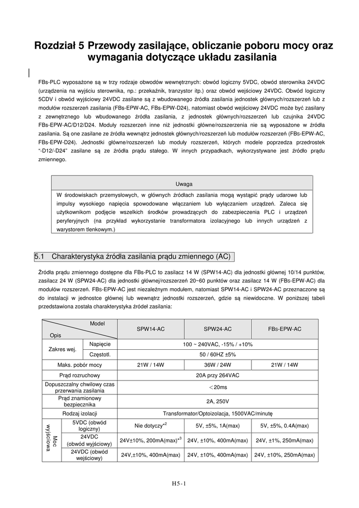 Rozdział 5 Przewody zasilające, obliczanie poboru mocy oraz wymagania dotyczące układu zasilania FBs-PLC wyposażone są w trzy rodzaje obwodów wewnętrznych: obwód logiczny 5VDC, obwód sterownika 24VDC (urządzenia na wyjściu sterownika, np.: przekaźnik, tranzystor itp.) oraz obwód wejściowy 24VDC. Obwód logiczny 5CDV i obwód wyjściowy 24VDC zasilane są z wbudowanego źródła zasilania jednostek głównych/rozszerzeń lub z modułów rozszerzeń zasilania (FBs-EPW-AC, FBs-EPW-D24), natomiast obwód wejściowy 24VDC może być zasilany z zewnętrznego lub wbudowanego źródła zasilania, z jednostek głównych/rozszerzeń lub czujnika 24VDC FBs-EPW-AC/D12/D24. Moduły rozszerzeń inne niż jednostki główne/rozszerzenia nie są wyposażone w źródła zasilania. Są one zasilane ze źródła wewnątrz jednostek głównych/rozszerzeń lub modułów rozszerzeń (FBS-EPW-AC, FBs-EPW-D24). Jednostki główne/rozszerzeń lub moduły rozszerzeń, których modele poprzedza przedrostek “-D12/-D24” zasilane są ze źródła prądu stałego. W innych przypadkach, wykorzystywane jest źródło prądu zmiennego. Uwaga W środowiskach przemysłowych, w głównych źródłach zasilania mogą wystąpić prądy udarowe lub impulsy wysokiego napięcia spowodowane włączaniem lub wyłączaniem urządzeń. Zaleca się użytkownikom podjęcie wszelkich środków prowadzących do zabezpieczenia PLC i urządzeń peryferyjnych (na przykład wykorzystanie transformatora izolacyjnego lub innych urządzeń z warystorem tlenkowym.) 5.1 Charakterystyka źródła zasilania prądu zmiennego (AC) Źródła prądu zmiennego dostępne dla FBs-PLC to zasilacz 14 W (SPW14-AC) dla jednostki głównej 10/14 punktów, zasilacz 24 W (SPW24-AC) dla jednostki głównej/rozszerzeń 20~60 punktów oraz zasilacz 14 W (FBS-EPW-AC) dla modułów rozszerzeń. FBS-EPW-AC jest niezależnym modułem, natomiast SPW14-AC i SPW24-AC przeznaczone są do instalacji w jednostce głównej lub wewnątrz jednostki rozszerzeń, gdzie są niewidoczne. W poniższej tabeli przedstawiona została charakterystyka źródeł zasilania: Model SPW14-AC SPW24-AC FBS-EPW-AC Opis Zakres wej. Napięcie 100 ~ 240VAC, -15% / +10% Częstotl. 50 / 60HZ ±5% Maks. pobór mocy 21W / 14W 36W / 24W Prąd rozruchowy 20A przy 264VAC <20ms Dopuszczalny chwilowy czas przerwania zasilania Prąd znamionowy bezpiecznika Rodzaj izolacji Moc wyjściowa 5VDC (obwód logiczny) 24VDC (obwód wyjściowy) 24VDC (obwód wejściowy) 21W / 14W 2A, 250V Transformator/Optoizolacja, 1500VAC/minutę 2 Nie dotyczy* 5V, ±5%, 1A(max) 5V, ±5%, 0.4A(max) 24V±10%, 200mA(max)* 24V, ±10%, 400mA(max) 24V, ±1%, 250mA(max) 24V,±10%, 400mA(max) 24V, ±10%, 400mA(max) 24V, ±10%, 250mA(max) 3 H5 -1 : Zasilanie 5VDC (obwodu logicznego) i 24VDC (obwodu wyjściowego) dostępne są ze złącza dla rozszerzeń Uwaga *1 znajdującego się po prawej stronie jednostek głównych/rozszerzeń. Zasilanie 5VDC wykorzystywane jest także przez płytkę komunikacyjną (CBxx) lub moduł komunikacyjny (CMxx). Zasilanie 24VDC obwodów wejściowych dostępne jest ze złącza (oznaczonego “+24V OUT-”) położonego w lewym górnym rogu listwy zaciskowej wejść jednostki głównej/rozszerzeń. :Zasilanie 5VDC jednostki głównej 10/14 punktów generowane jest ze źródła 24VDC w obwodzie wyjściowym. Uwaga *2 Charakterystyka zasilania: 5VDC±10% i 400mA (maks.) (Obwód umieszczony jest na płycie we/wy jednostki głównej 10/14 punktów). : Uwaga *3 W przypadku braku interfejsu rozszerzeń we/wy, zasilanie 24VDC przeznaczone jest do obwodu wyjściowego jednostki 10/14 punktów i nie może być wykorzystywane w żadnym innym celu. Uwaga • Poniżej przedstawiony został schemat obwodu zasilania AC w jednostkach głównych/rozszerzeń. Należy stosować się do następujących uwag: W celu włączenia lub wyłączenia zasilania AC, należy stosować wyłączniki jednobiegunowe (odcinające fazę "L") lub dwubiegunowe (odcinające fazę "L" i "N"). Przewód fazowy "L" musi być połączony na jednostce ze złączem złączem N . Należy używać przewodów o przekrojach 1mm Wszystkie złącza G ~2mm . 2 L , natomiast przewód neutralny "N" ze 2 jednostki głównej oraz modułu/jednostki rozszerzeń muszą być połączone ze złączem uziemiającym głównego układu zasilania (schemat przedstawiony poniżej) za pomocą przewodów o przekrojach 2 ponad 2mm . • Ostrzeżenie Wyjście zasilania dla czujników nie może być połączone z innymi źródłami w sposób równoległy, ponieważ połączenie takie spowodowałoby zakłócenia pomiędzy źródłami zasilania, zmniejszenie ich żywotności lub uszkodzenie. To z kolei, doprowadziłoby do nieprawidłowego działania PLC, a co za tym idzie, do niebezpieczeństwa dla ludzi lub sprzętu. Wyjście 24VDC 24VDC output (np.: czujniki) (for Input/Sensor) Zasilanie zewnętrzne 24VDC 24VDC Wejście/ input / Sensor czujnik OR input / Wejście/ input / Wejście/ Sensor czujnik Sensor czujnik OUT Wejście Input CPU sterowanie control 24V Źródło AC-DC Supply AC-DC Jednostka Main unit główna FBs (FBS- M ) Zasilanie 100-240VAC główne main power 100-240 VAC WŁ SW external power IN CONVERTER KONWERTER (DC-DC) (DC-DC) 24V 0V 0V sterowanie control Power zasilania Wyjście Output OUT Wejście Input SPOW24 -AC 0V Źródło AC-DC Power 5V zasilania Supply AC-DC 0V 24V F Wejście Input Zasilanie zewnętrzne 24VDC 24VDC OR OUT SPOW24 -AC 24V Wyjście 24VDC 24VDC output (np.:Sensor) czujnik) (for Wyjście 24VDC 24VDC output (np.: czujnik) (for Sensor) external power F Wyjście Output Moduł rozszerzeń Expansion module (FBS) L N PE H5 -2 5V Źródło AC-DC Power zasilania 0V Supply AC-DC 24V Wyjście Output Moduł rozszerzeń Expansion unit (FBS- XY AC) F 5V sterowanie control 0V 24V AI Moduł rozszerzeń Źródło Expansion Expansion module rozszerzeń power supply (FBS-6AD, 2DA, (FBS-EPW AC) 6TC,6RTD...) 5.2 Charakterystyka źródeła zasilania prąd