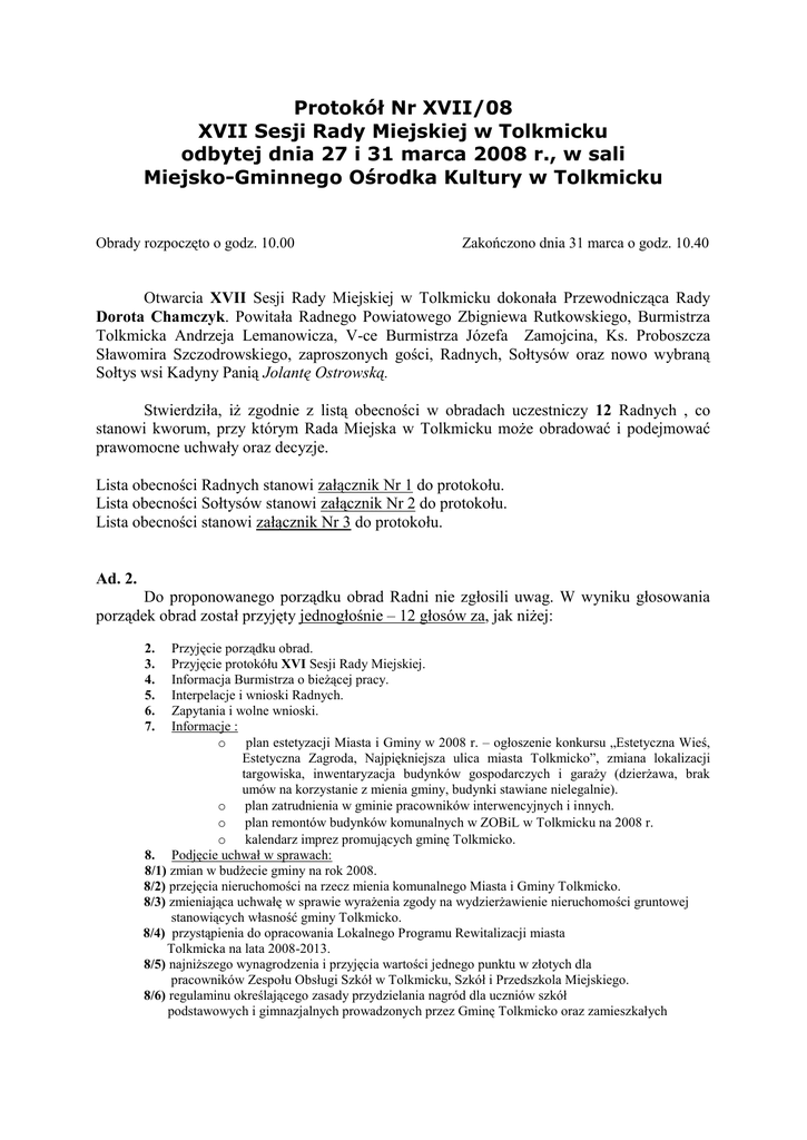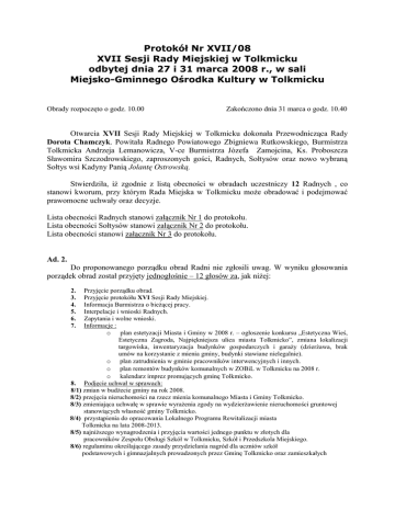Protokół Nr XVII/08 XVII Sesji Rady Miejskiej w Tolkmicku odbytej dnia 27 i 31 marca 2008 r., w sali Miejsko-Gminnego Ośrodka Kultury w Tolkmicku Obrady rozpoczęto o godz. 10.00 Zakończono dnia 31 marca o godz. 10.40 Otwarcia XVII Sesji Rady Miejskiej w Tolkmicku dokonała Przewodnicząca Rady Dorota Chamczyk. Powitała Radnego Powiatowego Zbigniewa Rutkowskiego, Burmistrza Tolkmicka Andrzeja Lemanowicza, V-ce Burmistrza Józefa Zamojcina, Ks. Proboszcza Sławomira Szczodrowskiego, zaproszonych gości, Radnych, Sołtysów oraz nowo wybraną Sołtys wsi Kadyny Panią Jolantę Ostrowską. Stwierdziła, iż zgodnie z listą obecności w obradach uczestniczy 12 Radnych , co stanowi kworum, przy którym Rada Miejska w Tolkmicku może obradować i podejmować prawomocne uchwały oraz decyzje. Lista obecności Radnych stanowi załącznik Nr 1 do protokołu. Lista obecności Sołtysów stanowi załącznik Nr 2 do protokołu. Lista obecności stanowi załącznik Nr 3 do protokołu. Ad. 2. Do proponowanego porządku obrad Radni nie zgłosili uwag. W wyniku głosowania porządek obrad został przyjęty jednogłośnie – 12 głosów za, jak niżej: Przyjęcie porządku obrad. Przyjęcie protokółu XVI Sesji Rady Miejskiej. Informacja Burmistrza o bieżącej pracy. Interpelacje i wnioski Radnych. Zapytania i wolne wnioski. Informacje : o plan estetyzacji Miasta i Gminy w 2008 r. – ogłoszenie konkursu „Estetyczna Wieś, Estetyczna Zagroda, Najpiękniejsza ulica miasta Tolkmicko”, zmiana lokalizacji targowiska, inwentaryzacja budynków gospodarczych i garaży (dzierżawa, brak umów na korzystanie z mienia gminy, budynki stawiane nielegalnie). o plan zatrudnienia w gminie pracowników interwencyjnych i innych. o plan remontów budynków komunalnych w ZOBiL w Tolkmicku na 2008 r. o kalendarz imprez promujących gminę Tolkmicko. 8. Podjęcie uchwał w sprawach: 8/1) zmian w budżecie gminy na rok 2008. 8/2) przejęcia nieruchomości na rzecz mienia komunalnego Miasta i Gminy Tolkmicko. 8/3) zmieniająca uchwałę w sprawie wyrażenia zgody na wydzierżawienie nieruchomości gruntowej stanowiących własność gminy Tolkmicko. 8/4) przystąpienia do opracowania Lokalnego Programu Rewitalizacji miasta Tolkmicka na lata 2008-2013. 8/5) najniższego wynagrodzenia i przyjęcia wartości jednego punktu w złotych dla pracowników Zespołu Obsługi Szkół w Tolkmicku, Szkół i Przedszkola Miejskiego. 8/6) regulaminu określającego zasady przydzielania nagród dla uczniów szkół podstawowych i gimnazjalnych prowadzonych przez Gminę Tolkmicko oraz zamieszkałych 2. 3. 4. 5. 6. 7. na terenie Gminy Tolkmicko, a uczęszczających do szkół podstawowych, gimnazjalnych prowadzonych przez inną osobę prawną lub fizyczną. 9. Odpowiedzi na interpelacje i wnioski. 10. Sprawy różne. 11. Zakończenie obrad. Ad. 3. Do protokołu XVI Sesji Rady Miejskiej w Tolkmicku z dnia 28 lutego 2008 r., Radni nie wnieśli uwag. W głosowaniu jawnym, w wyniku głosowania protokół XVI Sesji Rady Miejskiej w Tolkmicku został przyjęty: za - 11 głosów przeciw – 0 głosów wstrzymał się – 1 głos Ad. 4. Pan Andrzej Lemanowicz przedstawił informację o pracy Burmistrza w okresie międzysesyjnym od 28 lutego do 27 marca 2008 r., która stanowi załącznik Nr 4 do protokołu. Do przedstawionej informacji wniesiono następujące uwagi: Radny Piotr Nowicki odniósł się do punktu 13 informacji „ czy kwota zadłużenia opiewała na 5 000 zł? oraz do punktu 14 informacji. „Działka budowlana w Suchaczu sprzedana za 18 zł za m2 ? W jaki sposób dokonano takiego wyliczenia, to się ma nijak do cen obowiązujących na rynku?” Burmistrz Pan Andrzej Lemanowicz odpowiadając na punkt 13 wyjaśnił, że zadłużenie lokalu mieszkalnego przy ul. Świętojańskiej 34 nie jest spłacone całkowicie. Dokonano zabezpieczenia naszych należności na hipotece osoby, która poczyniła zamianę mieszkania na własnościowe. Brak zainteresowanych we wcześniej ogłaszanych dwóch przetargach na sprzedaż działki budowlanej w Suchaczu spowodowało, że działkę tą zbyto w drodze rokowań. Nie ma takiej potrzeby, by działkę tą pozostawić, choćby ze względu na niską atrakcyjność terenu dodał V-ce Burmistrz Pan Józef Zamojcin. Radny Robert Dziwosz odniósł się do punktu 8 informacji, pytanie dotyczy wymogu jaki był stawiany przy aplikowaniu o środki finansowe. V-ce Burmistrz Józef Zamojcin wyjaśnił, iż opierając się na projekcie Odnowa Wsi mamy możliwość skorzystania ze środków pieniężnych. Podstawowym jednak warunkiem przy składaniu wniosku było uzyskanie wpisu do ewidencji potencjalnych beneficjentów i nadanie numeru w celu ułatwienia prac przy rozpatrzeniu wniosku przez Agencję Restrukturyzacji i Modernizacji Rolnictwa. Radny Robert Grabowski zapytał o punkt 2 informacji „czy to jest droga przy torach w Kadynach?” Burmistrz powiadomił, że w najbliższym czasie i ten odcinek drogi zostanie wyrównany poprzez nawiezienie szlaki. Przewodnicząca Rady Pani Dorota Chamczyk zapytała o efekty wizyty, które przedstawiono w punkcie 19, 21 i 23 informacji? Pan Andrzej Lemanowicz poinformował, iż wizyta w Ministerstwie Kultury i Dziedzictwa Narodowego miała na celu omówienie sposobu rozpatrywania wniosków a przede wszystkim możliwości finansowania remontu Biblioteki. „Musimy uzbroić się w cierpliwość ponieważ konkurencja jest ogromna” - dodał. Spotkanie z Dyrektorem Powiatowego Centrum Pomocy Rodzinie zorganizowano w celu omówienia korzystania przez Stowarzyszenie z pomieszczenia Ponadlokalnej Świetlicy Środowiskowej w Pogrodziu. Radny Jerzy Gajewski „w związku z tym, proszę poinformować na piśmie Panią Dyrektor MGOPS w Tolkmicku o zaistniałej sytuacji”. V-ce Burmistrz Józef Zamojcin odniósł się do punktu 23 informacji. Spotkanie odbyło się z Głównym Inspektorem Urzędu Morskiego w Gdyni. Tematem rozmów była budowa przyczółka do przeprawy promow
