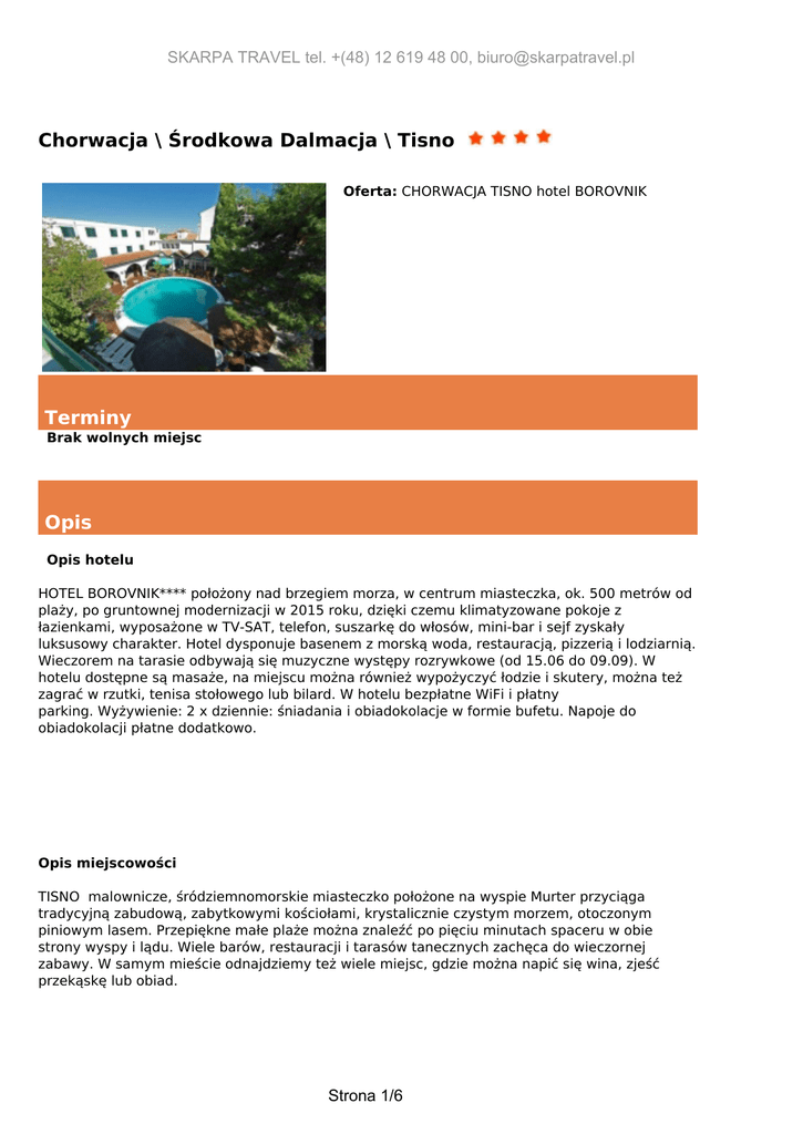 SKARPA TRAVEL tel. +(48) 12 619 48 00, [email protected] Chorwacja \ Środkowa Dalmacja \ Tisno Oferta: CHORWACJA TISNO hotel BOROVNIK Terminy Brak wolnych miejsc Opis Opis hotelu HOTEL BOROVNIK**** położony nad brzegiem morza, w centrum miasteczka, ok. 500 metrów od plaży, po gruntownej modernizacji w 2015 roku, dzięki czemu klimatyzowane pokoje z łazienkami, wyposażone w TV-SAT, telefon, suszarkę do włosów, mini-bar i sejf zyskały luksusowy charakter. Hotel dysponuje basenem z morską woda, restauracją, pizzerią i lodziarnią. Wieczorem na tarasie odbywają się muzyczne występy rozrywkowe (od 15.06 do 09.09). W hotelu dostępne są masaże, na miejscu można również wypożyczyć łodzie i skutery, można też zagrać w rzutki, tenisa stołowego lub bilard. W hotelu bezpłatne WiFi i płatny parking. Wyżywienie: 2 x dziennie: śniadania i obiadokolacje w formie bufetu. Napoje do obiadokolacji płatne dodatkowo. Opis miejscowości TISNO malownicze, śródziemnomorskie miasteczko położone na wyspie Murter przyciąga tradycyjną zabudową, zabytkowymi kościołami, krystalicznie czystym morzem, otoczonym piniowym lasem. Przepiękne małe plaże można znaleźć po pięciu minutach spaceru w obie strony wyspy i lądu. Wiele barów, restauracji i tarasów tanecznych zachęca do wieczornej zabawy. W samym mieście odnajdziemy też wiele miejsc, gdzie można napić się wina, zjeść przekąskę lub obiad. Strona 1/6 SKARPA TRAVEL tel. +(48) 12 619 48 00, [email protected] Cena w PLN obejmuje przejazd autokarem lub dojazd własny, ubezpieczenie rozszerzone KL+NNW+choroby przewlekłe +bagaż, opłatę na turystyczny fundusz gwarancyjny, promocję Cena w EUR obejmuje 7 lub 14 noclegów, 7 śniadań, 7 obiadokolacji w tym 1 uroczysta, leżaki przy basenie hotelowym, takę klimatyczną, Dopłaty 1. Łóżeczko dziecięce 5 EUR/ dzień 2. Parking przy hotelu 7 EUR / dzień Zniżki W cenie uwzględniona PROMOCJĘ FIRST MINUTE: przy dojeździe autokarem – 100 zł / osoba przy dojeździe własnym – 50 zł / osoba I. w STANDARD, SUPERIOR i RODZINNYM 1. Dziecko 0-7 lat jako 3 osoba w pokoju płaci kwotę w zł + 50 € 2. Dziecko 7-14 lat jako 3 osoba w pokoju płaci kwotę w zł + 50 % kwoty w € 3. Osoba powyżej 14 lat jako 3 osoba w pokoju płaci kwotę w zł + 80 % kwoty w € II. w RODZINNYM: 1. Dwoje dzieci 0-8 lat jako 3 i 4 osoba w pokoju płacą kwotę w zł + 50 € III. STAŁY KLIENT: obejmuje osoby korzystające trzeci kolejny rok z naszej oferty ! Uwagi organizatora 1.Kwota w złotych płatna jest w Polsce, kwota w EUR płatna w Chorwacji. Strona 2/6 SKARPA TRAVEL tel. +(48) 12 619 48 00, [email protected] 2.Przy dojeździe własnym, gdy potrzebna jest faktura na całość i przy zakupie ubezpieczenia od kosztów rezygnacji wtedy obowiązkowo równowartość kwoty w EUR płatna jest w Polsce. Kwota w EUR przeliczana jest na zł wg kursu NBP pieniądz sprzedaż z dnia ostatniej wpłaty. 3.W dniu wykupienia imprezy/ wpłaty zaliczki klient ma możliwość wykupienia dodatkowego ubezpieczenia od kosztów rezygnacji z imprezy zgodnie z Ogólnymi Warunkmi Ubezpieczenia KOSZTÓW IMPREZY TURYSTYCZNEJ w wysokości 3,3% jednak nie później niż 5 dni od dnia podpisania umowy. 4. Wycieczki fakultatywne organizowane są przez lokalne biura podróży. 5.Doba hotelowa rozpoczyna się o godz 14 i kończy o godz 9. 6. Miejsca i godziny odjazdów autokarów podano w rozkładzie jazdy 7. Potrzebny DOWÓD OSOBISTY lub PASZPORT ! Prosze pamiętać również o dokumencie dla dzieci. 8. Dla osób dojeżdżających do Krakowa możemy zarezerwować przednocleg w cenie od 100 zł. Uwagi przewoźnika 1.Transport na trasach antenowych w Polsce możliwy jest mikrobusem, autokarem klasy turystycznej, samochodem osobowym lub innym przewoźnikiem np. Polskim Busem, Luxbusem, PKP, PKS itp. Ewentualną zmianę godzin odjazdów podamy najpóźniej na 24 godziny przed odjazdem. Trasa połączeń na terenie kraju zależy od zgłoszeń z poszczególnych miast, co może spowodować, ze przejazd nie będzie realizowany najkrótszą z możliwych tras. 2. Na trasach poza granicami Polski transport odbywa się autokarami wyposażonymi w siedzenia uchylne, klimatyzację, toalety, video i nagłośnienie. Przy małej ilości osób, możliwość przewozu uczestników małym autobusem bez WC i mini baru, wtedy toalety na postojach płatne przez przewoźnika. 3. Podane godziny wyjazdów i przyjazdów mogą ulec zmianie z różnych przyczyn np. złe warunki drogowe, atmosferyczne, zwiększanie ruchu na drogach szczególnie w szczycie sezonu letniego i inne. 4. Prosimy o przybycie na miejsce zbiórki najpóźniej 15 minut przed planowaną godziną odjazdu. Miejsca w autokarze są przydzielane w kolejności podpisania umowy, a klienci o miejscach informowani są przez obsługę na miejscu zbiórki. W autokarze obowiązuje całkowity zakaz palenia papierosów oraz spożywania alkoholu. Osoby korzystające z samego przejazdu, powinny obowiązkowo ubezpieczyć się na czas pobytu. Przewoźnik gwarantuje tylko ubezpieczenie na czas przejazdu. Ramowy program imprezy (klasyczny 7 noclegowy) 1 dzień Wyjazd z Polski zgodnie z rozkładem jazdy, przejazd przez Słowację (dla chętnych posiłek za opłatą ok 5 EUR) i Węgry. 2 dzień przyjazd do Chorwacji na miejsce wypoczynku. Zakwaterowanie od godziny 14:00, obiadokolacja, nocleg. 2 – 8 dzień Wypoczynek, możliwość wykupienia wycieczek fakultatywnych. 9 dzień wykwaterowanie z pokoi do godz. 9:00 czas wolny. wyjazd w drogę powrotną zgodnie z rozkładem jazdy, przejazd przez Chorwację. 10 dzień Przejazd przez Węgry i Słowację (dla chętnych posiłek za opłatą ok. 5 EUR). Orientacyjny przyjazd do Krakowa ok. godz 15. Praktyczne informacje Strona 3/6 SKARPA TRAVEL tel. +(48) 12 619 48 00, [email protected] Najblizsza placówka dyplomatyczna:Ambasada RP, Krlezin Gvozd 3, 10000 Zagreb tel. (+385) 14834575, 4834579 fax. (+385)14834577 Wydzial Konsularnytel/fax 