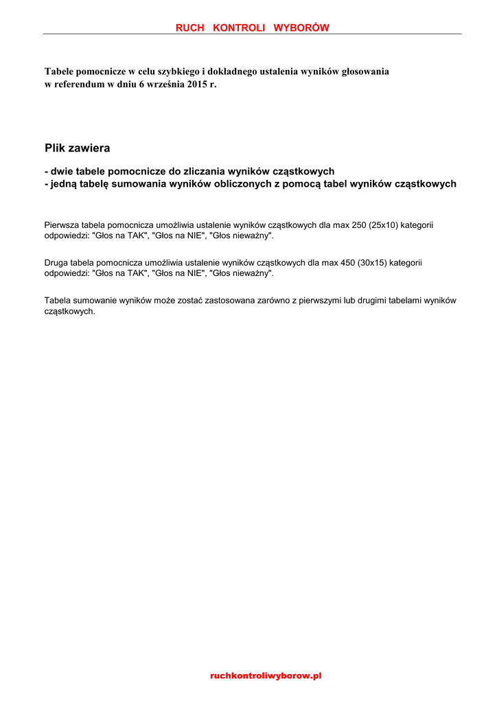 RUCH KONTROLI WYBORÓW Tabele pomocnicze w celu szybkiego i dokładnego ustalenia wyników głosowania w referendum w dniu 6 września 2015 r. Plik zawiera - dwie tabele pomocnicze do zliczania wyników cząstkowych - jedną tabelę sumowania wyników obliczonych z pomocą tabel wyników cząstkowych Pierwsza tabela pomocnicza umożliwia ustalenie wyników cząstkowych dla max 250 (25x10) kategorii odpowiedzi: "Głos na TAK", "Głos na NIE", "Głos nieważny". Druga tabela pomocnicza umożliwia ustalenie wyników cząstkowych dla max 450 (30x15) kategorii odpowiedzi: "Głos na TAK", "Głos na NIE", "Głos nieważny". Tabela sumowanie wyników może zostać zastosowana zarówno z pierwszymi lub drugimi tabelami wyników cząstkowych. ruchkontroliwyborow.pl Załącznik do Instrukcji dla członków obwodowych komisji ds. referendum Pomocnicza tabela do jednoczesnego ustalania wyników głosowania dla trzech pytań Plik zawiera dwie tabele dla max 25x10 = 250 lub max 30x15=450 głosów dla każdej kategorii odpowiedzi i dla każdego z pytań. W trakcie ustalania wyników głosowania trzech członków komisji ma przed sobą arkusz z pomocniczą tabelą. Każdy z nich niezależnie od pozostałych dwóch zaznacza na arkuszu w kolejnych kratkach werdykt komisji, przy pomocy wybranego symbolu: krzyżyka, kółeczka, kropki itp. Dlaczego trzy osoby mają zapisywać wyniki w tabelach? Jeżeli co najmniej dwie osoby będą miały takie same wyniki (dla wszystkich trzech pytań i trzech kategorii odpowiedzi), można założyć, że ich wyniki są prawidłowe. Aby powyższe założenie było prawdziwe, trzy osoby muszą notować ustalenia komisji, niezależnie od siebie. Najlepiej będzie, gdy takie same wyniki zostaną zanotowane przez wszystkie trzy osoby. Instrukcja jednoczesnego ustalania wyników głosowania dla trzech pytań 1 Jedna osoba, np. przewodniczący komisji, znajduje się po przeciwnej stronie stołu niż pozostałe osoby, w tym mężowie zaufania oraz trzy osoby z pomocniczymi tabelami. 2 Jedna osoba, np. przewodniczący komisji, sprawdza jaki głos padł na pytanie nr 1: na TAK, na NIE albo nieważny 3 Nastepnie odwraca kartę do głosowania i pokazując ją pozostałym obecnym osobom ogłasza werdykt, np. Pytanie 1 - "Głos na TAK" 4 Przewodniczacy trzyma kartę, a pozostali członkowie komisji albo potwierdzają ustalenia albo zgłaszają zastrzeżenia. 5 Gdy nie ma jakichkolwiek zastrzeżeń, to osoby z arkuszami zaznaczają kolejną kratkę (krzyżykiem, kółkiem, jakimkolwiek symbolem) w wierszu "Pytanie nr 1" i kolumnie "Głos na TAK". 6 Jeżeli ustalono "Głos na NIE" lub "Głos nieważny" - symbol stawiany jest w odpowiedniej kolumnie. 7 Analogicznie przebiega ustalenie wyników dla pytania nr 2 i pytania nr 3. 8 W momencie, gdy którakolwiek z osób notujących głosy na arkuszach pomocniczych osiągnie liczbę 10 lub 15 (tzn. pełny wiersz) w jakiejkolwiek kolumnie "Głosy na TAK" lub "Głosy na NIE" lub "Głosy NIEważne", następuje sprawdzenie czy wszystkie trzy osoby zaznaczyły te same liczby kratek dla wszystkich pytań i kategorii odpowiedzi. 9 Jeżeli liczba zaznaczeń zgodza się w przypadku co najmniej dwóch osób dla wszystkich pytań i kategorii odpowiedzi, to zakładamy, że zaznaczenia dla tych dwóch osób są prawidłowe. 10 W przypadku braku zgodności między co najmniej dwoma osobami, należy sprawdzić wyniki dla ostatniej partii kart. 11 Zbiory kart, dla których ustalono wynik głosowania, między kolejnymi uzgodniami obliczeń trzech osób, należy odkładać oddzielnie lub zaznaczyć w jakikolwiek sposób, tak aby w przypadku, gdyby doszło do niezgodności w zaznaczeniach trzech osób można było sprawdzać tylko ostatnią partię kart. Zaznaczanie partii kart, zgodnie z powyższym warunkiem, można oznaczać konieczność weryfikacji wyników głosowania dla maksimum 28 lub 43 kart. ruchkontroliwyborow.pl Głosy na TAK Pytanie nr 3 Pytanie nr 2 Pytanie nr 1 1 2 3 4 5 6 7 Głosy na NIE 8 9 10 1 2 3 4 5 6 7 Głosy NIEWAŻNE 8 9 10 1 2 3 4 5 1 2 3 4 5 6 7 8 9 10 11 12 13 14 15 16 17 18 19 20 21 22 23 24 25 SUMA cząstkowa: SUMA cząstkowa: SUMA cząstkowa: SUMA cząstkowa: SUMA cząstkowa: SUMA cząstkowa: SUMA cząstkowa: SUMA cząstkowa: SUMA cząstkowa: 1 2 3 4 5 6 7 8 9 10 11 12 13 14 15 16 17 18 19 20 21 22 23 24 25 1 2 3 4 5 6 7 8 9 10 11 12 13 14 15 16 17 18 19 20 21 22 23 24 25 ruchkontroliwyborow.pl 6 7 8 9 10 Głosy na TAK Pytanie nr 3 Pytanie nr 2 Pytanie nr 1 1 2 3 4 5 6 7 8 9 10 11 12 13 14 15 Głosy na NIE 1 2 3 4 5 6 7 8 9 10 11 12 13 14 15 Głosy NIEWAŻNE 1 2 3 4 5 6 1 2 3 4 5 6 7 8 9 10 11 12 13 14 15 16 17 18 19 20 21 22 23 24 25 26 27 28 29 30 SUMA cząstkowa: SUMA cząstkowa: SUMA cząstkowa: SUMA cząstkowa: SUMA cząstkowa: SUMA cząstkowa: SUMA cząstkowa: SUMA cząstkowa: SUMA cząstkowa: 1 2 3 4 5 6 7 8 9 10 11 12 13 14 15 16 17 18 19 20 21 22 23 24 25 26 27 28 29 30 1 2 3 4 5 6 7 8 9 10 11 12 13 14 15 16 17 18 19 20 21 22 23 24 25 26 27 28 29 30 ruchkontroliwyborow.pl 7 8 9 10 11 12 13 14 15 Tabela do ustalenia końcowych wyników głosowania z pomocą tabel wyników cząstkowych Z pomocą poniższej tabeli możemy zsumować wyniki cząstkowe wyznaczone z pomoca 10 tabel pomocniczych. Pytanie nr 3 Pytanie nr 2 Pytanie nr 1 Głosy na TAK Głosy na NIE Głosy WAŻNE Głosy NIEWAŻNE Arkusz nr 1 Arkusz nr 1 Arkusz nr 1 Arkusz nr 2 Arkusz nr 2 Arkusz nr 2 Arkusz nr 3 Arkusz nr 3 Arkusz nr 3 Arkusz nr 4 Arkusz nr 4 Arkusz nr 4 Arkusz nr 5 Arkusz nr 5 Arkusz nr 5 Arkusz nr 6 Arkusz nr 6 Arkusz nr 6 Arkusz nr 7 Arkusz nr 7 Arkusz nr 7 Arkusz nr 8 Arkusz nr 8 Arkusz nr 8 Arkusz nr 9 Arkusz nr 9 Arkusz nr 10 Arkusz nr 10 SUMA końcowa: SUMA końcowa: Arkusz nr 1 Arkusz nr 1 Arkusz nr 1 Arkusz nr 2 Arkusz nr 2 Arkusz nr 2 Arkusz nr 3 Arkusz nr 3 Arkusz nr 3 Arkusz nr 4 Arkusz nr 4 Arkusz nr 4 Arkusz nr 5 Arkusz nr 5 Arkusz nr 5 Arkusz nr 6 Arkusz nr 6 Arkusz nr 6 Arkusz nr 7 Arkusz nr 7 Arkusz nr 7 Arkusz nr 8 Arkusz nr 8 Arkusz nr