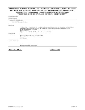 PRZEDMIAR-ROBOTY BUDOWLANE-"BUDYNEK ADMINISTRACYJNY" dla zadania pn: "BUDOWA BUDYNKU HALI NR 1 WRAZ Z NIEZBĘDNĄ INFRASTRUKTURĄ TECHNICZNĄ realizowana w ramach: ROZBUDOWA INKUBATORA TECHNOLOGICZNEGO WRAZ Z CENTRUM OBSŁUGI PPNT" Branża: Budowlana Rodzaj: Przedmiar Wspólny Słownik Zamówień: 45000000-7 Roboty budowlane BUDOWA: "BUDOWA BUDYNKU HALI NR 1 WRAZ Z NIEZBĘDNĄ INFRASTRUKTURĄ TECHNICZNĄ realizowana w ramach: ROZBUDOWA INKUBATORA TECHNOLOGICZNEGO WRAZ Z CENTRUM OBSŁUGI PPNT" BUDYNEK ADMINISTRACYJNY Roboty budowlane Tajęcina dz.ew.nr425/12 i 425/13 oraz Jasionka dz.ew.nr 1867/168 INWESTOR: Rzeszowska Agencja Rozwoju Regionalnego S.A. Szopena 51 5-959 Rzeszów KOSZTORYSANT: Kosztorys sporządził: Tomasz Litwin WYKONAWCA: EDBUD Moduł Kosztorys 3.22 INWESTOR: 2013-08-07 L.p. A Podstawa opisu Opis / Długi opis 45111200-0 Roboty ziemne-poziom terenu +211,00 poziom 0,0=+212,00-po usunięciu humusu głębokość wykopu h= 0,7m Ilość: 1,0000 Wartość rozdziału: Wartość pozycji scalonych: Razem: B 45111200-0 chudy beton pod stopy i ławy fundamentowe Ilość: 1,0000 Wartość rozdziału: Wartość pozycji scalonych: Razem: C 45223500-1 Roboty fundamentowe Ilość: 1,0000 Wartość rozdziału: Wartość pozycji scalonych: Razem: D 45223500-1 Konstrukcja żelbetowa Ilość: 1,0000 Wartość rozdziału: Wartość pozycji scalonych: Razem: E 45223100-7 Pokrycie dachu wraz z ociepleniem Ilość: 1,0000 Wartość rozdziału: Wartość pozycji scalonych: Razem: F 45262522-6 Ściany nośne i wypełniające oraz działowe tynki wewn,malowanie, okładziny wewnętrzne. Ilość: 1,0000 Wartość rozdziału: Wartość pozycji scalonych: Razem: G 45262650-2 Sufity podwieszane Ilość: 1,0000 Wartość rozdziału: Wartość pozycji scalonych: Razem: H 45321000-3 Ocieplenie i wykonanie elewacji ścian Ilość: 1,0000 Wartość rozdziału: Wartość pozycji scalonych: Razem: I 45421100-5 Ślusarka , stolarka Ilość: 1,0000 Wartość rozdziału: Wartość pozycji scalonych: Razem: J 45430000-0 Posadzki Ilość: 1,0000 EDBUD Moduł Kosztorys 3.22 2013-08-07 L.p. Podstawa opisu Opis / Długi opis Wartość rozdziału: Wartość pozycji scalonych: Razem: K Inne roboty-daszki balustrady wycieraczki,drabiny mała architektura,dostwaa i montaż windy Ilość: 1,0000 Wartość rozdziału: Wartość pozycji scalonych: Razem: L 45223100-7 Wiata na gromadzenie odpadów wraz z obudową z płyt włuknocementowych Ilość: 1,0000 Wartość rozdziału: Wartość pozycji scalonych: Razem: M 45262100-2 Rusztowania Ilość: 1,0000 Wartość rozdziału: Wartość pozycji scalonych: Razem: Koszty bezpośrednie: Wartość z narzutami: Wartość pozycjii scalonych: Wydatki inwestora: Dodatkowe koszty: Narzuty kwotowe: [Koszty pośrednie = 0,00 zł] [Zysk = 0,00 zł] Wartość kosztorysu: Wartość VAT: Wartość kosztorysu z VAT: EDBUD Moduł Kosztorys 3.22 2013-08-07 L.p. Podstawa opisu Opis / Obmiar A 45111200-0 Roboty ziemne-poziom terenu +211,00 humusu głębokość wykopu h= 0,7m A.1 KNR 0201 0122-0100 Pomiary przy wykopach fundamentowych, teren równinny i nizinny. Obmiar Jedn. poziom 0,0=+212,00-po usunięciu 433,3000 m3 650,0000 m2 433,3000 m3 619,0000 m2 110,2560 m3 27,5640 m3 27,5640 m3 97,5000 m3 61,9000 m3 166,1200 m2 209,2600 m2 496,9900 m2 171,6800 m3 Obmiar: 433,3000 A.2 KNR 0201 0126-0100 Usunięcie warstwy ziemi urodzajnej - humusu, za pomocą spycharek, grubość warstwy do 15 cm. Obmiar: 10*65 = 650,0000 A.3 KSNR 0001 0207-0300 Wykopy jamiste o głębokości do 4,0 m,wykonywane na odkład koparkami podsiębiernymi,o pojemności łyżki 0,60 m3,w grunciekategorii I, II-fundamenty-grunt zostanie wykorzystany do niwelacji terenu wokół hali Obmiar: 433,3000 A.4 KNNR 0001 0503-0300 Plantowanie (obrobienie na czysto) skarp i dna wykopów wykonywanych mechanicznie, grunt kategorii I-III Obmiar: 619,0000 A.5 KSNR 0001 0210-0500 Zasypanie wykopów fundamentowych podłużnych,punktowych,obiektowych,rowów spycharkami 55kw/75km.zagęszczanie ubijakami warstwy luźnej grub.25cm,grunt kat. III, IV-80% Obmiar: 137,82 * 0,8 = 110,2560 A.6 KSNR 0001 0309-0100 Zasypywanie wykopów ze skarpami w gruntach kategorii I, III,z przerzutem na odległość do 3 m,z zagęszczeniem-20% ręcznie Obmiar: 137,82 * 0,2 = 27,5640 A.7 KNNR 0001 0408-0100 Zagęszczanie nasypów ubijakamii mechanicznymi, grunty sypkie kategorii I-II Obmiar: 27,5640 A.8 KNNR 0001 0526-0100 Rozścielenie ziemi urodzajnej (humusu) spycharką na terenie płaskim Obmiar: 10 * 65 * 0,15 = 97,5000 B 45111200-0 chudy beton pod stopy i ławy fundamentowe B.9 KNR 0202 1101-0100 Podkłady na podłożu gruntowym, z betonu zwykłego i kruszywa naturalnego.C-8/10 gr.10,0cm pod fundamenty Obmiar: 619*0,1 = 61,9000 C 45223500-1 Roboty fundamentowe C.10 KSNR 0002 0102-0200 Deskowanie systemowe drobnowymiarowe konstrukcji betonowych lub żelbetowych, stóp (i płyty trzonu windy) fundamentowych Obmiar: 159,24 + 6,88 = 166,1200 C.11 KSNR 0002 0102-0100 Deskowanie systemowe drobnowymiarowe konstrukcji betonowych lub żelbetowych, ław fundamentowych Obmiar: 209,2600 C.12 KSNR 0002 0102-0300 Deskowanie systemowe drobnowymiarowe konstrukcji betonowych lub żelbetowych, ścian prostych Obmiar: 133,89 + 341,18 + 21,92 = 496,9900 C.13 KSNR 0002 0107-0300 Betonowanie konstrukcji zbrojonych ław i stóp oraz płyty dolnej trzonu windowego fundamentowych w deskowaniu systemowym drobnowymiarowym z transportem betonu pompą-Beton C25/30 (B-30) EDBUD Moduł Kosztorys 3.22 2013-08-07 L.p. Podstawa opisu Opis / Obmiar Obmiar Jedn. Obmiar: 76,152 + 88,168 + 7,36 = 171,6800 C.14 KSNR 0002 0107-0200 Betonowanie konstrukcji niezbrojonych ścian prostych w deskowaniu systemowym drobnowymiarowym z transportem betonu pompą -Beton C25/30 (B-30) 45,2000 m3 20,5300 m3 0,9660 t 3,4637 t 5,7067 t Obmiar: 45,2000 C.15 KSNR 0002 0107-0400 Betonowanie konstrukcji zbrojonych ścian prostych w deskowaniu systemowym drobnowymiarowym z transportem betonu pompą-beton C25/30 (B-30) Obmiar