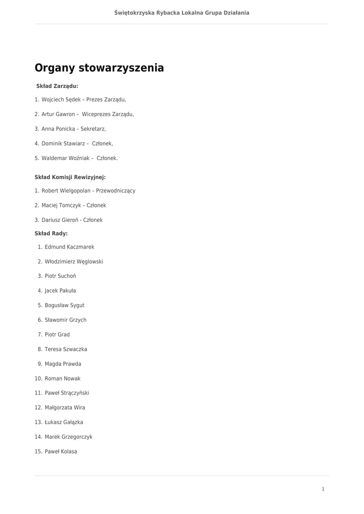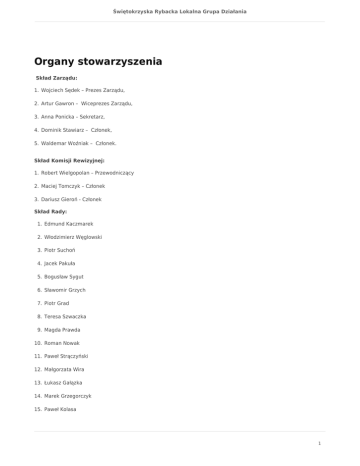 Świętokrzyska Rybacka Lokalna Grupa Działania Organy stowarzyszenia Skład Zarządu: 1. Wojciech Sędek – Prezes Zarządu, 2. Artur Gawron – Wiceprezes Zarządu, 3. Anna Ponicka – Sekretarz, 4. Dominik Stawiarz – Członek, 5. Waldemar Woźniak – Członek. Skład Komisji Rewizyjnej: 1. Robert Wielgopolan – Przewodniczący 2. Maciej Tomczyk – Członek 3. Dariusz Gieroń - Członek Skład Rady: 1. Edmund Kaczmarek 2. Włodzimierz Węglowski 3. Piotr Suchoń 4. Jacek Pakuła 5. Bogusław Sygut 6. Sławomir Grzych 7. Piotr Grad 8. Teresa Szwaczka 9. Magda Prawda 10. Roman Nowak 11. Paweł Strączyński 12. Małgorzata Wira 13. Łukasz Gałązka 14. Marek Grzegorczyk 15. Paweł Kolasa 1 Świętokrzyska Rybacka Lokalna Grupa Działania 16. Władysław Musiał 17. Paulina Szczerba 18. Bartek Robak 2