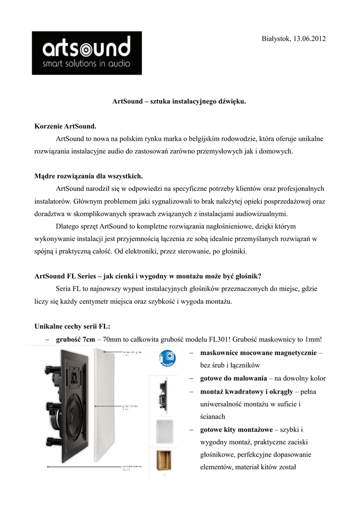 Białystok, 13.06.2012 ArtSound – sztuka instalacyjnego dźwięku. Korzenie ArtSound. ArtSound to nowa na polskim rynku marka o belgijskim rodowodzie, która oferuje unikalne rozwiązania instalacyjne audio do zastosowań zarówno przemysłowych jak i domowych. Mądre rozwiązania dla wszystkich. ArtSound narodził się w odpowiedzi na specyficzne potrzeby klientów oraz profesjonalnych instalatorów. Głównym problemem jaki sygnalizowali to brak należytej opieki posprzedażowej oraz doradztwa w skomplikowanych sprawach związanych z instalacjami audiowizualnymi. Dlatego sprzęt ArtSound to kompletne rozwiązania nagłośnieniowe, dzięki którym wykonywanie instalacji jest przyjemnością łączenia ze sobą idealnie przemyślanych rozwiązań w spójną i praktyczną całość. Od elektroniki, przez sterowanie, po głośniki. ArtSound FL Series – jak cienki i wygodny w montażu może być głośnik? Seria FL to najnowszy wypust instalacyjnych głośników przeznaczonych do miejsc, gdzie liczy się każdy centymetr miejsca oraz szybkość i wygoda montażu. Unikalne cechy serii FL: − grubość 7cm – 70mm to całkowita grubość modelu FL301! Grubość maskownicy to 1mm! − maskownice mocowane magnetycznie – bez śrub i łączników − gotowe do malowania – na dowolny kolor − montaż kwadratowy i okrągły – pełna uniwersalność montażu w suficie i ścianach − gotowe kity montażowe – szybki i wygodny montaż, praktyczne zaciski głośnikowe, perfekcyjne dopasowanie elementów, materiał kitów został opracowany pod kątem poprawy pracy akustycznej głośnika − jakość dźwięku – dwudrożna konstrukcja z polipropylenowymi przetwornikami, zawieszonymi na ultralekkiej piance resorującej. ArtSound seria FL – cena od 529 PLN Głośniki wodoszczelne, łazienkowe, do wnętrz. ArtSound oferuje szeroką, różnorodną ofertę głośników odpornych na wilgoć i zakroplenie oraz specjalnie przygotowane serie całkowicie wodoszczelne. Unikalne cechy serii RO: − odporność na wilgoć, zakroplenie, zachlapanie, − grubość 8cm – 80mm całkowita grubość montażu! − gotowe do malowania – na dowolny kolor − zmienna akustyka – obrotowa kopułka wysokotonowa pozwala wybrać kierunek promieniowania wysokich tonów, co pozwala na skuteczną korekcję dźwięku w różnorodnych pomieszczeniach − jakość dźwięku – dwudrożna konstrukcja wyposażona w wysokotonowy głośnik koaksjalny z magnesem neodymowym, oraz potężny 16.5-centymetrowy głośnik średnio-niskotonowy z aluminium na zawieszeniu gumowym − gotowe kity montażowe – w dwóch wariantach: do montażu w karton-gipsie oraz do montażu w ścianie z dedykowanym wygłuszeniem. Wygodne sprężynowe zaciski głośnikowe, szybki i wygodny montaż. ArtSound RO – cena od 699 PLN Inne modele głośników wewnętrznych w pełni wodoodpornych: MDC6, MDC64, DC84. Głośniki zewnętrzne (outdoor) wodoodporne. Podstawową cechą zewnętrznych głośników ArtSound jest wybitna odporność na zewnętrzne warunki atmosferyczne – wodę, słońce czy ujemne temperatury. Unikalne cechy serii ASW: − całkowita wodoodporność, mrozoodporność − zintegrowany uchwyt do ściany lub sufitu, − kompletny system montażowy z kołkami i śrubami montażowymi, − zdolne do nagłośnienia dużych przestrzeni otwartych – od 50 do 85W ciągłej mocy RMS − zoptymalizowane akustycznie – dwudrożna konstrukcja z bas-refleksem. ArtSound ASW – Cena od 445 PLN Głośniki ze zmienną opornością. Rozwiązania ArtSound to unikalna uniwersalność i elastyczność rozwiązań wyrażona w niepowtarzalnych pomysłach, takich jak seria instalacyjnych głośników G ze zmienną opornością. Unikalne cechy modeli G4 i G5: − 8 lub 16 Ohm – zmiana oporności, która pozwala na połączenie ze sobą dwóch głośników równolegle pod jeden kanał wzmacniacza 8 Ohm lub czterech głośników pod jeden kanał wzmacniacza 4 Ohm, − kompletny system montażowy – z uchwytem, śrubami i kołkami montażowymi w komplecie, − obudowa z materiału ABS – niezwykle trwała, odporna na zarysowania, − montaż do ściany lub sufitu – dzięki regulowanemu w zakresie 90-stopni uchwytowi seria G sprawdzi się zarówno jako głośnik sufitowy jak i ścienny. ArtSound G4 - Cena: 679 PLN Budżetowy system multiroom: 4 strefowy i 2-źródłowy wzmacniacz ze sterowaniem z bezprzewodowych klawiatur. Każdy kto postanowił zainstalować w swoim domu system multiroom spotkał się z jedną z największych bolączek instalacji wielopokojowych – czyli ze sterowaniem. Rozwiązanie kwestii sterowania zawsze tworzy dylemat – czy warto kuć ściany w celu umieszczenia przewodowej klawiatury sterującej multiroom w pomieszczeniu? Czy też zainwestować znaczną sumę w przenośne centrum sterowania, które jest mało wygodne i wymaga częstego doładowywania? Największą wadą mobilnego centrum sterowania takiego jak tablet lub smartfon jest konieczność ciągłego noszenia go przy sobie. Poza tym, zarówno tablet jak i smartfon mogą być wykorzystywane tylko przez jedną osobę i tylko w jednym pomieszczeniu – tego typu rozwiązanie nie spełnia podstawowych założeń multiroomu. ArtSound rozwiązał ten problem. Wystarczy zestaw multiroom ArtSound 2.4 z 4-strefowym wzmacniaczem i systemem bezprzewodowych klawiatur ArtSound z własnym niezależnym zasilaniem! Unikalne cechy wzmacniacza ART 2.4: − bezprzewodowe sterowanie z poziomu klawiatur naściennych, − 4 w pełni niezależne strefy − 2 źródła w tym jedno ze standardowo wbudowanego tunera radiowego FM − obsługa do 4 pilotów i dwóch klawiatur bezprzewodowych na jedną strefę! − w zestawie jeden bezprzewodowy pilot − możliwość dokupienia interfejsu integrującego z domowym systemem KNX Unikalne cechy klawiatur ART 2.4: − bezprzewodowa łączność - z pomocą fal radiowych, − mobilność – montaż na stałe nie jest wymagany, − niezależ
