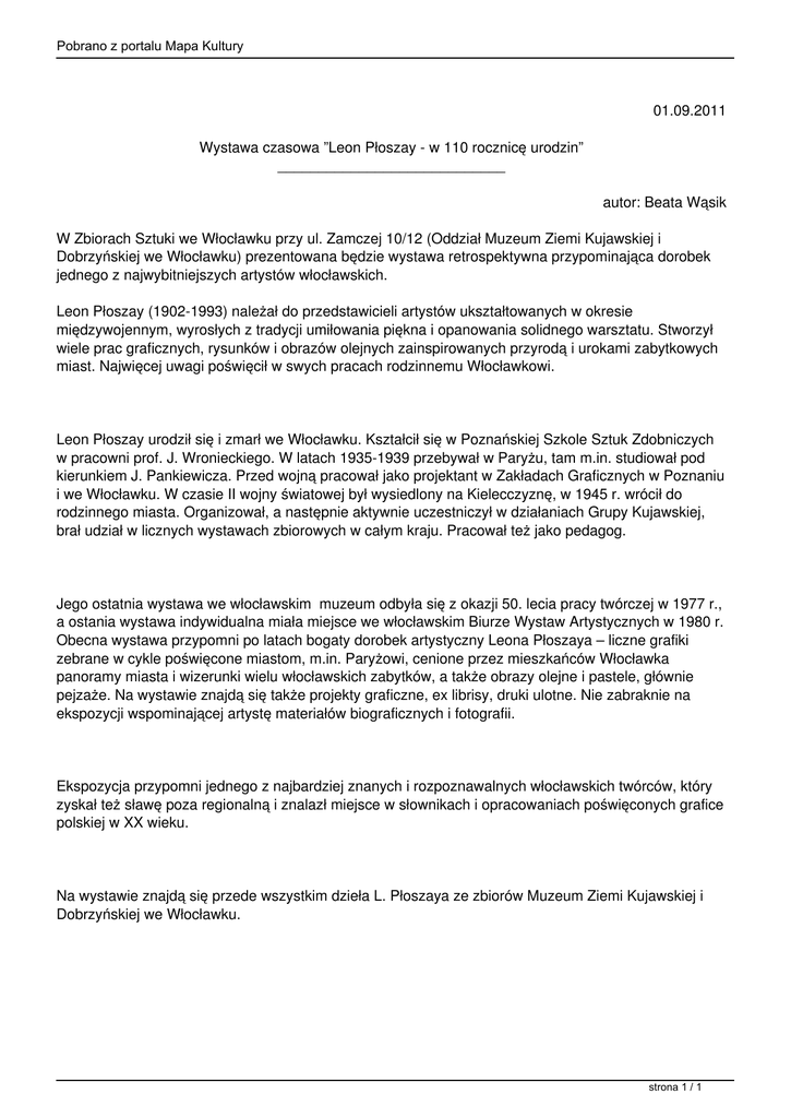 Pobrano z portalu Mapa Kultury 01.09.2011 Wystawa czasowa ”Leon Płoszay - w 110 rocznicę urodzin” ____________________________ autor: Beata Wąsik W Zbiorach Sztuki we Włocławku przy ul. Zamczej 10/12 (Oddział Muzeum Ziemi Kujawskiej i Dobrzyńskiej we Włocławku) prezentowana będzie wystawa retrospektywna przypominająca dorobek jednego z najwybitniejszych artystów włocławskich. Leon Płoszay (1902-1993) należał do przedstawicieli artystów ukształtowanych w okresie międzywojennym, wyrosłych z tradycji umiłowania piękna i opanowania solidnego warsztatu. Stworzył wiele prac graficznych, rysunków i obrazów olejnych zainspirowanych przyrodą i urokami zabytkowych miast. Najwięcej uwagi poświęcił w swych pracach rodzinnemu Włocławkowi. Leon Płoszay urodził się i zmarł we Włocławku. Kształcił się w Poznańskiej Szkole Sztuk Zdobniczych w pracowni prof. J. Wronieckiego. W latach 1935-1939 przebywał w Paryżu, tam m.in. studiował pod kierunkiem J. Pankiewicza. Przed wojną pracował jako projektant w Zakładach Graficznych w Poznaniu i we Włocławku. W czasie II wojny światowej był wysiedlony na Kielecczyznę, w 1945 r. wrócił do rodzinnego miasta. Organizował, a następnie aktywnie uczestniczył w działaniach Grupy Kujawskiej, brał udział w licznych wystawach zbiorowych w całym kraju. Pracował też jako pedagog. Jego ostatnia wystawa we włocławskim muzeum odbyła się z okazji 50. lecia pracy twórczej w 1977 r., a ostania wystawa indywidualna miała miejsce we włocławskim Biurze Wystaw Artystycznych w 1980 r. Obecna wystawa przypomni po latach bogaty dorobek artystyczny Leona Płoszaya – liczne grafiki zebrane w cykle poświęcone miastom, m.in. Paryżowi, cenione przez mieszkańców Włocławka panoramy miasta i wizerunki wielu włocławskich zabytków, a także obrazy olejne i pastele, głównie pejzaże. Na wystawie znajdą się także projekty graficzne, ex librisy, druki ulotne. Nie zabraknie na ekspozycji wspominającej artystę materiałów biograficznych i fotografii. Ekspozycja przypomni jednego z najbardziej znanych i rozpoznawalnych włocławskich twórców, który zyskał też sławę poza regionalną i znalazł miejsce w słownikach i opracowaniach poświęconych grafice polskiej w XX wieku. Na wystawie znajdą się przede wszystkim dzieła L. Płoszaya ze zbiorów Muzeum Ziemi Kujawskiej i Dobrzyńskiej we Włocławku. strona 1 / 1