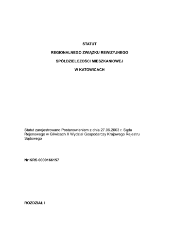 STATUT REGIONALNEGO ZWIĄZKU REWIZYJNEGO SPÓŁDZIELCZOŚCI MIESZKANIOWEJ W KATOWICACH Statut zarejestrowano Postanowieniem z dnia 27.06.2003 r. Sądu Rejonowego w Gliwicach X Wydział Gospodarczy Krajowego Rejestru Sądowego Nr KRS 0000166157 ROZDZIAŁ I NAZWA, SIEDZIBA, TEREN DZIAŁANIA I CEL ZWIĄZKU. § 1. 1. Związek nosi nazwę: „Regionalny Związek Rewizyjny Spółdzielczości Mieszkaniowej”. 2. Związek działa na terenie Rzeczypospolitej Polskiej. 3. Siedzibą Związku jest miasto Katowice. § 2. Celem Związku Rewizyjnego jest zapewnienie zrzeszonym w nim spółdzielniom pomocy w ich działalności statutowej. § 3. 1. Przedmiotem działania Związku jest: 1) Przeprowadzanie lustracji zrzeszonych spółdzielni w oparciu o kryteria legalności, gospodarności i rzetelności. 2) Przeprowadzanie lustracji spółdzielni nie zrzeszonych. 3) Prowadzenie działalności instruktażowej i doradczej w zakresie: a) doradztwa prawnego i pomocy prawnej b) doradztwa ekonomicznego i finansowego c) doradztwa w zakresie rozwiązań organizacyjnych i gospodarczych oraz form i metod zarządzania spółdzielnią. 4) Badanie sprawozdań finansowych spółdzielni mieszkaniowych 5) Prowadzenie działalności szkoleniowej, kulturalno-oświatowej i wydawniczej. 6) Reprezentowanie interesów zrzeszonych spółdzielni wobec organów administracji państwowej, organów samorządu terytorialnego i za granicą. 7) Inicjowanie i rozwijanie współpracy między spółdzielniami oraz współdziałanie z placówkami naukowo-badawczymi. ROZDZIAŁ II CZŁONKOWIE ZWIĄZKU. § 4. 1. Zrzeszanie w Związku jest dobrowolne. 2. Członkami Związku mogą być spółdzielnie mieszkaniowe. § 5. 1. Członkostwo w Związku powstaje z chwilą przyjęcia przez Zarząd Związku na podstawie złożonych przez spółdzielnię przystępującą pisemnej deklaracji. Spółdzielnie - założyciele stają się członkami Związku z dniem jego zarejestrowania. 2. Do deklaracji spółdzielnia przystępująca załącza uchwałę walnego zgromadzenia o przystąpieniu spółdzielni do Związku oraz odpis zarejestrowanego statutu. 3. Uchwałą w sprawie przyjęcia członka powinna być podjęta w ciągu 3 miesięcy od dnia złożenia deklaracji. O uchwale o przyjęciu w poczet członków oraz o uchwale odmawiającej przyjęcia, Zarząd Związku zawiadamia na piśmie zainteresowaną spółdzielnię w ciągu miesiąca od dnia jej powzięcia. Zawiadomienie o odmowie przyjęcia powinno zawierać uzasadnienie. 4. W razie nie przyjęcia spółdzielni na członka Związku, bądź zwłoki w rozpatrzeniu wniosku trwającej ponad 3 miesiące od złożenia deklaracji, zainteresowanej spółdzielni przysługuje, w ciągu 6 tygodni od dnia otrzymania zawiadomienia lub upływu terminu, w którym powinno nastąpić przyjęcie, prawo wniesienia odwołania do Rady Nadzorczej Związku. Rada Nadzorcza obowiązana jest rozpatrzyć odwołanie w ciągu trzech miesięcy od daty jej złożenia. Decyzja Rady Nadzorczej jest ostateczna. § 6. Członkowie Związku mają prawo: 1. Brać udział przez swoich delegatów w obradach Zjazdu Delegatów. 2. Uczestniczyć w wyborach do organów Związku oraz ocenie jej działalności. 3. Korzystać z prowadzonej przez Związek działalności statutowej na zasadach określonych przez Zjazd Delegatów. 4. Żądać przeprowadzenia dodatkowej lustracji działalności spółdzielni; wysokość opłaty za dodatkową lustrację określi Zarząd. 5. Zgłaszać wnioski, opinie i postulaty w sprawie działalności Związku. § 7. Do obowiązków członka Związku należy: 1. Wniesienie wpisowego. 2. Wpłacanie składek na wykonanie zadań Związku. 3. Przestrzeganie postanowień statutu Związku oraz uchwał Zjazdu Delegatów i Rady Nadzorczej w sprawach organizacyjnych i majątkowych Związku. 4. Umożliwienie Związkowi przeprowadzenie lustracji oraz udzielanie niezbędnych informacji i udostępnienie dokumentacji. 5. Zawiadomienie Związku o zmianie statutu spółdzielni. § 8. Członkostwo Związku ustaje w przypadku: 1. Dobrowolnego wystąpienia spółdzielni ze Związku w trybie określonym w § 9 statutu. 2. Wykluczenia spółdzielni z przyczyn określonych w § 10 statutu. 3. Wykreślenia z rejestru członków, jeżeli z przyczyn nie zawinionych przez siebie, spółdzielnia nie wykonuje swoich obowiązków statutowych. 4. Skreślenia z rejestru członków w przypadku wykreślenia spółdzielni z rejestru sądowego. § 9. Spółdzielnia może wystąpić ze Związku na koniec danego roku kalendarzowego za uprzednim trzymiesięcznym pisemnym wypowiedzeniem. Do wypowiedzenia spółdzielnia obowiązana jest dołączyć uchwałę walnego zgromadzenia o wystąpieniu ze Związku. § 10. Spółdzielnia może być wykluczona ze Związku uchwałą Rady Nadzorczej z powodu: 1. Rażącego naruszenia prawa, postanowień statutu Związku bądź uchwał organów Związku, o których mowa w § 7 pkt 3. 2. Działania na szkodę Związku. § 11. 1. Spółdzielni wykluczonej lub wykreślonej z rejestru członków przysługuje prawo pisemnego odwołania do najbliższego Zjazdu Delegatów Związku, w terminie 30 dni od daty otrzymania uchwały o wykluczeniu lub wykreśleniu wraz z jej uzasadnieniem. 2. Spółdzielnia dobrowolnie występująca ze Związku lub wykreślona z rejestru członków może być ponownie przyjęta do Związku. ROZDZIAŁ III MAJĄTEK I FUNDUSZE ZWIĄZKU. § 12. 1. Majątek Związku składa się z : 1) Wpłat z tytułu wpisowego i składek 2) Darowizn osób prawnych i fizycznych 3) Pozostałych przychodów. § 13. Związek tworzy następujące fundusze własne: 1. Fundusz zasobowy powstający z wpłat wpisowego oraz członków, darowizn, nadwyżki między pobranymi składkami a kosztami utrzymania Związku oraz z dochodów uzyskanych z innych źródeł. 2. Fundusze specjalne, których źródło tworzenia i zasady gospodarowania określają uchwały Zjazdu Delegatów oraz obowiązujące przepisy prawne. § 14. Spółdzieln