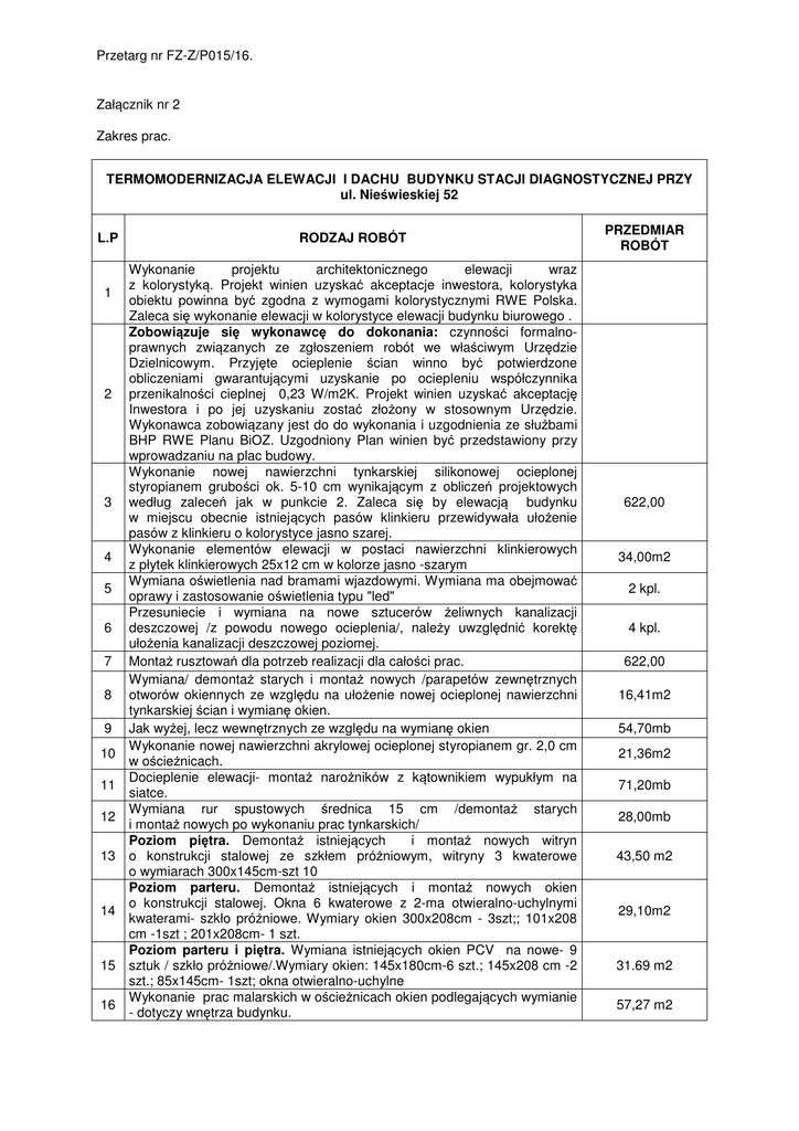 Przetarg nr FZ-Z/P015/16. Załącznik nr 2 Zakres prac. TERMOMODERNIZACJA ELEWACJI I DACHU BUDYNKU STACJI DIAGNOSTYCZNEJ PRZY ul. Nieświeskiej 52 L.P 1 2 3 4 5 6 7 8 9 10 11 12 13 14 15 16 RODZAJ ROBÓT Wykonanie projektu architektonicznego elewacji wraz z kolorystyką. Projekt winien uzyskać akceptacje inwestora, kolorystyka obiektu powinna być zgodna z wymogami kolorystycznymi RWE Polska. Zaleca się wykonanie elewacji w kolorystyce elewacji budynku biurowego . Zobowiązuje się wykonawcę do dokonania: czynności formalnoprawnych związanych ze zgłoszeniem robót we właściwym Urzędzie Dzielnicowym. Przyjęte ocieplenie ścian winno być potwierdzone obliczeniami gwarantującymi uzyskanie po ociepleniu współczynnika przenikalności cieplnej 0,23 W/m2K. Projekt winien uzyskać akceptację Inwestora i po jej uzyskaniu zostać złożony w stosownym Urzędzie. Wykonawca zobowiązany jest do do wykonania i uzgodnienia ze służbami BHP RWE Planu BiOZ. Uzgodniony Plan winien być przedstawiony przy wprowadzaniu na plac budowy. Wykonanie nowej nawierzchni tynkarskiej silikonowej ocieplonej styropianem grubości ok. 5-10 cm wynikającym z obliczeń projektowych według zaleceń jak w punkcie 2. Zaleca się by elewacją budynku w miejscu obecnie istniejących pasów klinkieru przewidywała ułożenie pasów z klinkieru o kolorystyce jasno szarej. Wykonanie elementów elewacji w postaci nawierzchni klinkierowych z płytek klinkierowych 25x12 cm w kolorze jasno -szarym Wymiana oświetlenia nad bramami wjazdowymi. Wymiana ma obejmować oprawy i zastosowanie oświetlenia typu "led" Przesuniecie i wymiana na nowe sztucerów żeliwnych kanalizacji deszczowej /z powodu nowego ocieplenia/, należy uwzględnić korektę ułożenia kanalizacji deszczowej poziomej. Montaż rusztowań dla potrzeb realizacji dla całości prac. Wymiana/ demontaż starych i montaż nowych /parapetów zewnętrznych otworów okiennych ze względu na ułożenie nowej ocieplonej nawierzchni tynkarskiej ścian i wymianę okien. Jak wyżej, lecz wewnętrznych ze względu na wymianę okien Wykonanie nowej nawierzchni akrylowej ocieplonej styropianem gr. 2,0 cm w ościeżnicach. Docieplenie elewacji- montaż narożników z kątownikiem wypukłym na siatce. Wymiana rur spustowych średnica 15 cm /demontaż starych i montaż nowych po wykonaniu prac tynkarskich/ Poziom piętra. Demontaż istniejących i montaż nowych witryn o konstrukcji stalowej ze szkłem próżniowym, witryny 3 kwaterowe o wymiarach 300x145cm-szt 10 Poziom parteru. Demontaż istniejących i montaż nowych okien o konstrukcji stalowej. Okna 6 kwaterowe z 2-ma otwieralno-uchylnymi kwaterami- szkło próżniowe. Wymiary okien 300x208cm - 3szt;; 101x208 cm -1szt ; 201x208cm- 1 szt. Poziom parteru i piętra. Wymiana istniejących okien PCV na nowe- 9 sztuk / szkło próżniowe/.Wymiary okien: 145x180cm-6 szt.; 145x208 cm -2 szt.; 85x145cm- 1szt; okna otwieralno-uchylne Wykonanie prac malarskich w ościeżnicach okien podlegających wymianie - dotyczy wnętrza budynku. PRZEDMIAR ROBÓT 622,00 34,00m2 2 kpl. 4 kpl. 622,00 16,41m2 54,70mb 21,36m2 71,20mb 28,00mb 43,50 m2 29,10m2 31.69 m2 57,27 m2 Przetarg nr FZ-Z/P015/16. 17 18 19 20 21 22 23 24 25 26 27 28 29 30 31 32 33 34 35 36 37 38 39 Wykonanie poprawek tynkarskich w ościeżach wymienianych okien- pasy 190,90mb tynkarskie szerokości 10 cm Wymiana 2-ch par drzwi wejściowych o wym. 100x205 cm. Nowe drzwi winny być wykonane w konstrukcji stalowej , ocieplone. /malowanie 4,20 m2 próżniowe/ Kompleksowy remont nawierzchni 2-ch daszków nad drzwiami wejściowymi. Zdjęcie istniejącej warstwy papy, uzupełnienie nawierzchni konstrukcji żelbetowej, ułożenie 2-ch warstw papy termozgrzewalnej, 6,4 m2 wykonanie pełnego zakresu obróbek blacharskich i odwodnienia daszków/ ok 6,0m2 blachy ocynkowanej/ Kompleksowy remont nawierzchni 2-ch podestów wejściowych do 4,60 m2 budynku. Wymiana wycieraczek stalowych 100x80 cm - 2szt. 1.60 m2 Wykonanie cokołu wokół budynku. Wykonanie prac rozbiórkowych cokołu z płytek ceramicznych, skucie podłoża i wykonanie nowego cokołu 24,90 m2 z tynku żywicznego. Demontaż istniejącej instalacji odgromowej. Po zakończeniu prac termomodernizacyjnych dachu i ścian wykonanie nowej instalacji 383,00m2 odgromowej wraz z jej opomiarowanym. Wykonanie termomodernizacji pokrycia dachowego budynku stacji zgodnie 383,00m2 z wymogami / współczynnik przenikalności ciepła 0,23 W/M2k/. Montaż kantówek na obrzeżu pokrycia dachowego, dla prawidłowego 84,00mb montażu obróbek blacharskich i zabezpieczenia ocieplenia dachu. /1,89m3 Wykonanie obróbek blacharskich wokół dachu /pasy pod i nad rynnowe, 84,00m2 obróbki blacharskie szczytów budynku/ Demontaż i montażowej rynny /15cm/ z blachy ocynkowanej 54.00mb Demontaż istniejących wywietrzaków stalowych / blacha ocynkowana/. 2 kpl. Naprawa podstaw i montaż nowych konstrukcji H= 100cm, średnica -80cm. Oczyszczenie i pomalowanie konstrukcji wentylatora dachowego- wymiary 2 kpl./ 1,80m2 100cm/60 cm. Demontaż istniejącej drabiny wejściowej na dach. Drabina wejściowa ma być wyposażona w obejmy i szynę Assecuro wraz z kompletem szelek i 7,00mb/180 kg wózków. Należy przewidzieć wzmocnienie pokrycia dachowego w miejscu wyjścia na dach- 100 x120 cm. Montaż systemu Assesuro na połaci dachowej wraz z kompletem 383,00m2 wyposażenia Wykonanie i montaż daszków z polietylenu o konstrukcji stalowej nad 4 kpl. bramami wjazdowymi. Wymiary daszków- 450x120cm Dokonanie przeglądu technicznego 4 bram wjazdowych / wymiary bram 365x425- 2szt i 345x360cm- 2szt/. Wykonanie przeglądu stanu 4 kpl. technicznego bram, wymiana uszkodzonych elementów itp.- zlecenie do firmy serwisującej/ Wykonanie nawierzchni tynkarskiej silikonowej na warstwie styropianu 132,00 m2 wyrównawczego gr 2,00 cm, na budynku stacji transformatorowej. Demontaż drzwi zewnętrznych stalowych o wymiarach 90x210 cm- 1 szt. 1 szt. - 1,90 m2 Zamurowanie otwo