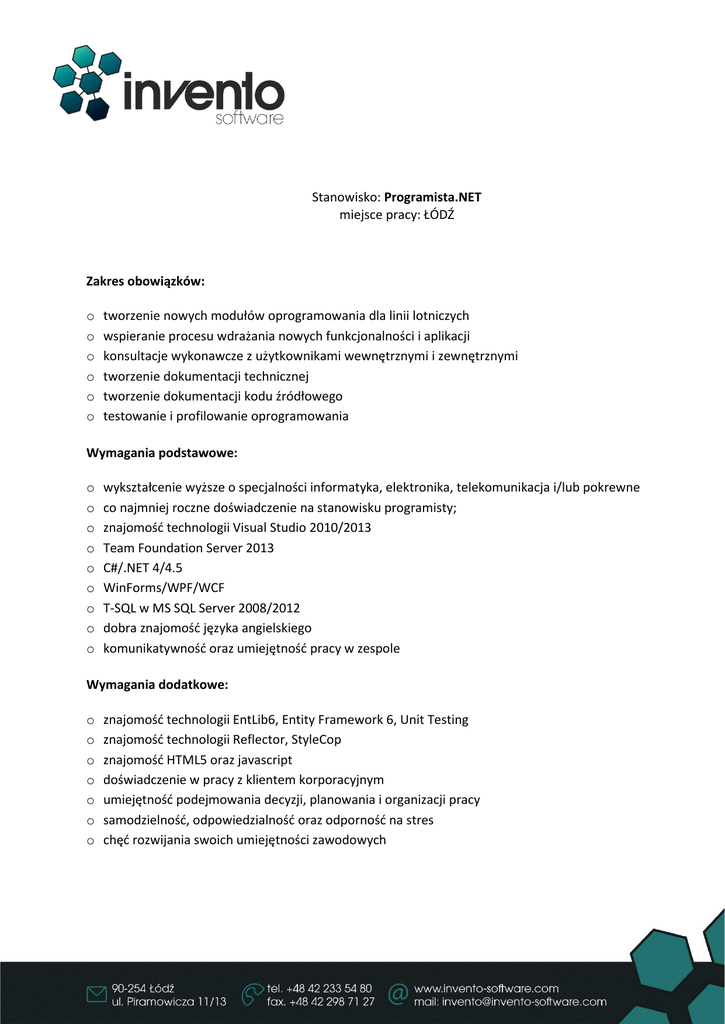 Stanowisko: Programista.NET miejsce pracy: ŁÓDŹ Zakres obowiązków: o o o o o o tworzenie nowych modułów oprogramowania dla linii lotniczych wspieranie procesu wdrażania nowych funkcjonalności i aplikacji konsultacje wykonawcze z użytkownikami wewnętrznymi i zewnętrznymi tworzenie dokumentacji technicznej tworzenie dokumentacji kodu źródłowego testowanie i profilowanie oprogramowania Wymagania podstawowe: o o o o o o o o o wykształcenie wyższe o specjalności informatyka, elektronika, telekomunikacja i/lub pokrewne co najmniej roczne doświadczenie na stanowisku programisty; znajomość technologii Visual Studio 2010/2013 Team Foundation Server 2013 C#/.NET 4/4.5 WinForms/WPF/WCF T-SQL w MS SQL Server 2008/2012 dobra znajomość języka angielskiego komunikatywność oraz umiejętność pracy w zespole Wymagania dodatkowe: o o o o o o o znajomość technologii EntLib6, Entity Framework 6, Unit Testing znajomość technologii Reflector, StyleCop znajomość HTML5 oraz javascript doświadczenie w pracy z klientem korporacyjnym umiejętność podejmowania decyzji, planowania i organizacji pracy samodzielność, odpowiedzialność oraz odporność na stres chęć rozwijania swoich umiejętności zawodowych Oferujemy: o o o o o umowę o pracę atrakcyjny system szkoleń pracę w dynamicznym, międzynarodowym zespole możliwość rozwoju kompetencji oraz budowanie indywidualnej ścieżki kariery możliwość współpracy z prestiżowymi partnerami biznesowymi z branży lotniczej w Europie i na świecie CV prosimy przesyłać na adres: [email protected] Uprzejmie informujemy, iż zastrzegamy sobie prawo kontaktu jedynie z wybranymi osobami. Prosimy o zawarcie w aplikacji klauzuli: „Wyrażam zgodę na przetwarzanie moich danych osobowych dla potrzeb obecnych oraz przyszłych procesów rekrutacyjnych prowadzonych przez firmę Invento Software z siedzibą w Łodzi, zgodnie z przepisami ustawy z dnia 29.08.1997 r. o ochronie danych osobowych (Dz.U. Nr 133, poz. 883 z późn. zm.)”