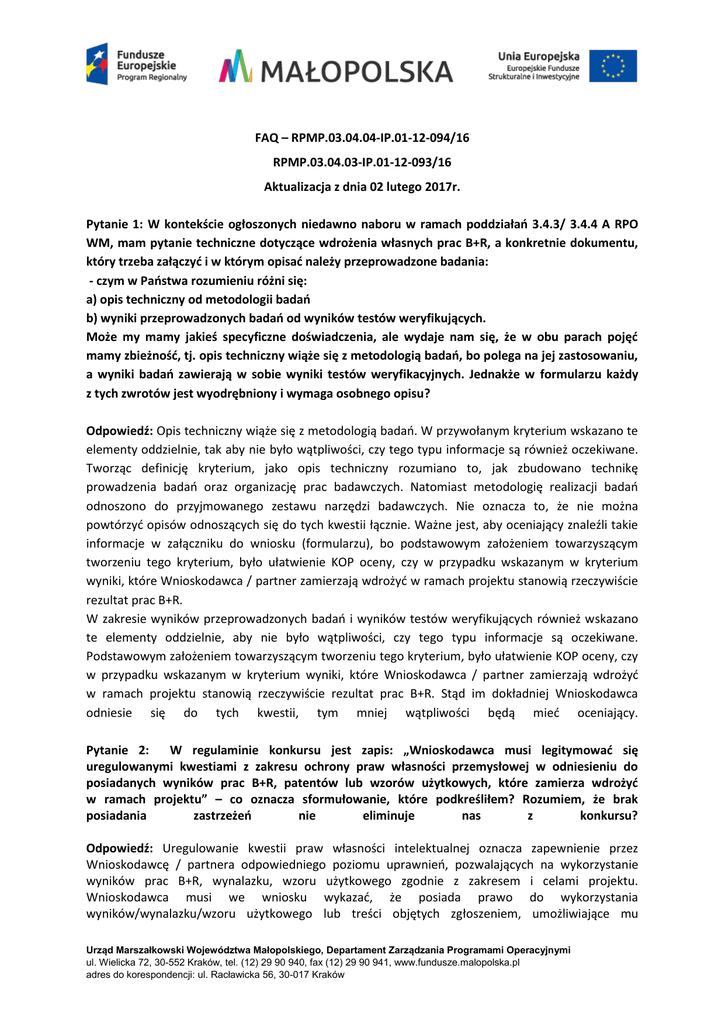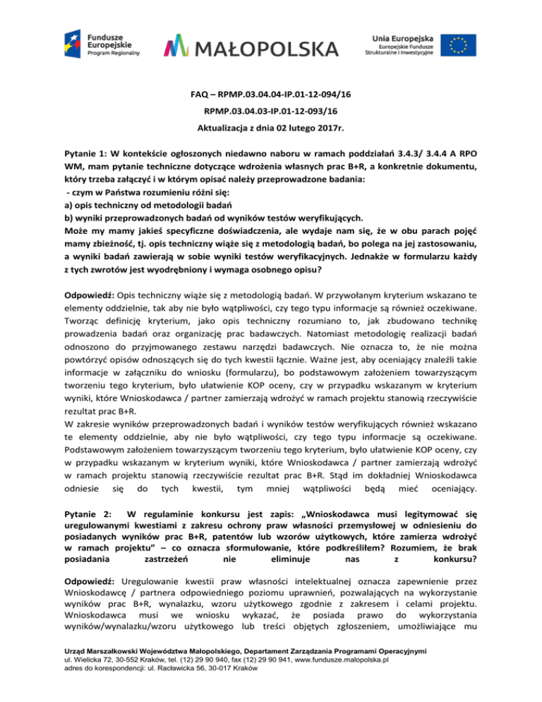 FAQ – RPMP.03.04.04-IP.01-12-094/16 RPMP.03.04.03-IP.01-12-093/16 Aktualizacja z dnia 02 lutego 2017r. Pytanie 1: W kontekście ogłoszonych niedawno naboru w ramach poddziałań 3.4.3/ 3.4.4 A RPO WM, mam pytanie techniczne dotyczące wdrożenia własnych prac B+R, a konkretnie dokumentu, który trzeba załączyć i w którym opisać należy przeprowadzone badania: - czym w Państwa rozumieniu różni się: a) opis techniczny od metodologii badań b) wyniki przeprowadzonych badań od wyników testów weryfikujących. Może my mamy jakieś specyficzne doświadczenia, ale wydaje nam się, że w obu parach pojęć mamy zbieżność, tj. opis techniczny wiąże się z metodologią badań, bo polega na jej zastosowaniu, a wyniki badań zawierają w sobie wyniki testów weryfikacyjnych. Jednakże w formularzu każdy z tych zwrotów jest wyodrębniony i wymaga osobnego opisu? Odpowiedź: Opis techniczny wiąże się z metodologią badań. W przywołanym kryterium wskazano te elementy oddzielnie, tak aby nie było wątpliwości, czy tego typu informacje są również oczekiwane. Tworząc definicję kryterium, jako opis techniczny rozumiano to, jak zbudowano technikę prowadzenia badań oraz organizację prac badawczych. Natomiast metodologię realizacji badań odnoszono do przyjmowanego zestawu narzędzi badawczych. Nie oznacza to, że nie można powtórzyć opisów odnoszących się do tych kwestii łącznie. Ważne jest, aby oceniający znaleźli takie informacje w załączniku do wniosku (formularzu), bo podstawowym założeniem towarzyszącym tworzeniu tego kryterium, było ułatwienie KOP oceny, czy w przypadku wskazanym w kryterium wyniki, które Wnioskodawca / partner zamierzają wdrożyć w ramach projektu stanowią rzeczywiście rezultat prac B+R. W zakresie wyników przeprowadzonych badań i wyników testów weryfikujących również wskazano te elementy oddzielnie, aby nie było wątpliwości, czy tego typu informacje są oczekiwane. Podstawowym założeniem towarzyszącym tworzeniu tego kryterium, było ułatwienie KOP oceny, czy w przypadku wskazanym w kryterium wyniki, które Wnioskodawca / partner zamierzają wdrożyć w ramach projektu stanowią rzeczywiście rezultat prac B+R. Stąd im dokładniej Wnioskodawca odniesie się do tych kwestii, tym mniej wątpliwości będą mieć oceniający. Pytanie 2: W regulaminie konkursu jest zapis: „Wnioskodawca musi legitymować się uregulowanymi kwestiami z zakresu ochrony praw własności przemysłowej w odniesieniu do posiadanych wyników prac B+R, patentów lub wzorów użytkowych, które zamierza wdrożyć w ramach projektu” – co oznacza sformułowanie, które podkreśliłem? Rozumiem, że brak posiadania zastrzeżeń nie eliminuje nas z konkursu? Odpowiedź: Uregulowanie kwestii praw własności intelektualnej oznacza zapewnienie przez Wnioskodawcę / partnera odpowiedniego poziomu uprawnień, pozwalających na wykorzystanie wyników prac B+R, wynalazku, wzoru użytkowego zgodnie z zakresem i celami projektu. Wnioskodawca musi we wniosku wykazać, że posiada prawo do wykorzystania wyników/wynalazku/wzoru użytkowego lub treści objętych zgłoszeniem, umożliwiające mu Urząd Marszałkowski Województwa Małopolskiego, Departament Zarządzania Programami Operacyjnymi ul. Wielicka 72, 30-552 Kraków, tel. (12) 29 90 940, fax (12) 29 90 941, www.fundusze.malopolska.pl adres do korespondencji: ul. Racławicka 56, 30-017 Kraków zastosowanie ww. do działalności gospodarczej (komercjalizację) – co więcej, musi to znaleźć potwierdzenie w przedstawionej dokumentacji, np. kopie umów w sprawie zakupu patentu, licencji, praw majątkowych. Nieuregulowane kwestie z zakresu praw własności przemysłowej mogłyby uniemożliwić realizację projektu (np. brak praw do patentu czy wzoru użytkowego, na podstawie którego Wnioskodawca zamierza produkować nowy produkt). Kwestie te oceniane są na etapie oceny merytorycznej projektu w ramach kryterium pn. Prawo własności intelektualnej – jest to kryterium logiczne, którego niespełnienie skutkuje negatywną oceną projektu. Pytanie 3: Co to jest instytucja weryfikująca, o której mowa w następującym fragmencie kryteriów: We wniosku o dofinansowanie Wnioskodawca musi przedstawić informacje dotyczące zakresu prac B+R, którymi dysponuje Wnioskodawca. Wnioskodawca musi określić i opisać wyniki przeprowadzonych prac B+R (w tym co najmniej: opis techniczny, założenia przyjęte w badaniach, metodologię badań, wyniki przeprowadzonych badań, wyniki testów weryfikujących, wskazanie autora badań oraz instytucji weryfikującej)? Odpowiedź: W Regulaminie konkursu nie została ujęta definicja instytucji weryfikującej badania, jednakże założyć należy, iż może być to np. instytucja prowadząca badania i rozpowszechniająca wiedzę. Rzeczoną instytucję należy wskazać jedynie w przypadku gdy doszło do weryfikacji prac badawczo-rozwojowych. Jeśli badania nie były weryfikowane przez zewnętrzną jednostkę, która posiada ku temu potencjał należy taką informację wpisać do treści załącznika nr 11 do Regulaminu konkursu. Informacje oczekiwane zgodnie z treścią kryterium pn. Wdrożenie wyników prac B+R lub wynalazków lub wzorów użytkowych mają za zadanie ułatwić KOP ocenę tego, czy w przypadku projektów dotyczących wdrożenia wyników prac badawczo-rozwojowych (B+R), które nie są chronione patentem lub prawem ochronnym na wzór użytkowy - wyniki, które Wnioskodawca / partner zamierzają wdrożyć w ramach projektu stanowią rezultat prac B+R. Pytanie 4: Kryterium pn. „Wdrożenie wyników prac B+R lub wynalazków lub wzorów użytkowych” – czy posiadanie zgłoszenia na wzór użytkowy lub patent (samo zgłoszenie) zwalnia z obowiązku przygotowania opisu, o którym mowa w pkt 2 tegoż kryterium? Przytaczam stosowny fragment: „We wniosku o dofinansowanie Wnioskodawca musi przedstawić informacje dotyczące zakresu prac B+R, którymi d