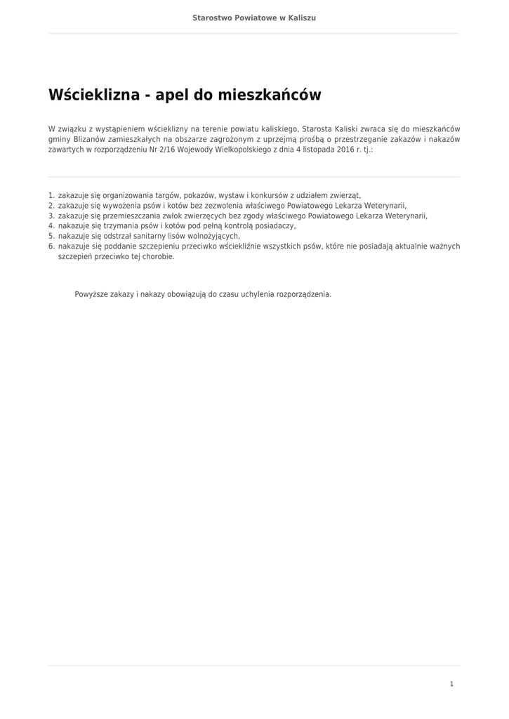 Starostwo Powiatowe w Kaliszu Wścieklizna - apel do mieszkańców W związku z wystąpieniem wścieklizny na terenie powiatu kaliskiego, Starosta Kaliski zwraca się do mieszkańców gminy Blizanów zamieszkałych na obszarze zagrożonym z uprzejmą prośbą o przestrzeganie zakazów i nakazów zawartych w rozporządzeniu Nr 2/16 Wojewody Wielkopolskiego z dnia 4 listopada 2016 r. tj.: 1. 2. 3. 4. 5. 6. zakazuje się organizowania targów, pokazów, wystaw i konkursów z udziałem zwierząt, zakazuje się wywożenia psów i kotów bez zezwolenia właściwego Powiatowego Lekarza Weterynarii, zakazuje się przemieszczania zwłok zwierzęcych bez zgody właściwego Powiatowego Lekarza Weterynarii, nakazuje się trzymania psów i kotów pod pełną kontrolą posiadaczy, nakazuje się odstrzał sanitarny lisów wolnożyjących, nakazuje się poddanie szczepieniu przeciwko wściekliźnie wszystkich psów, które nie posiadają aktualnie ważnych szczepień przeciwko tej chorobie. Powyższe zakazy i nakazy obowiązują do czasu uchylenia rozporządzenia. 1