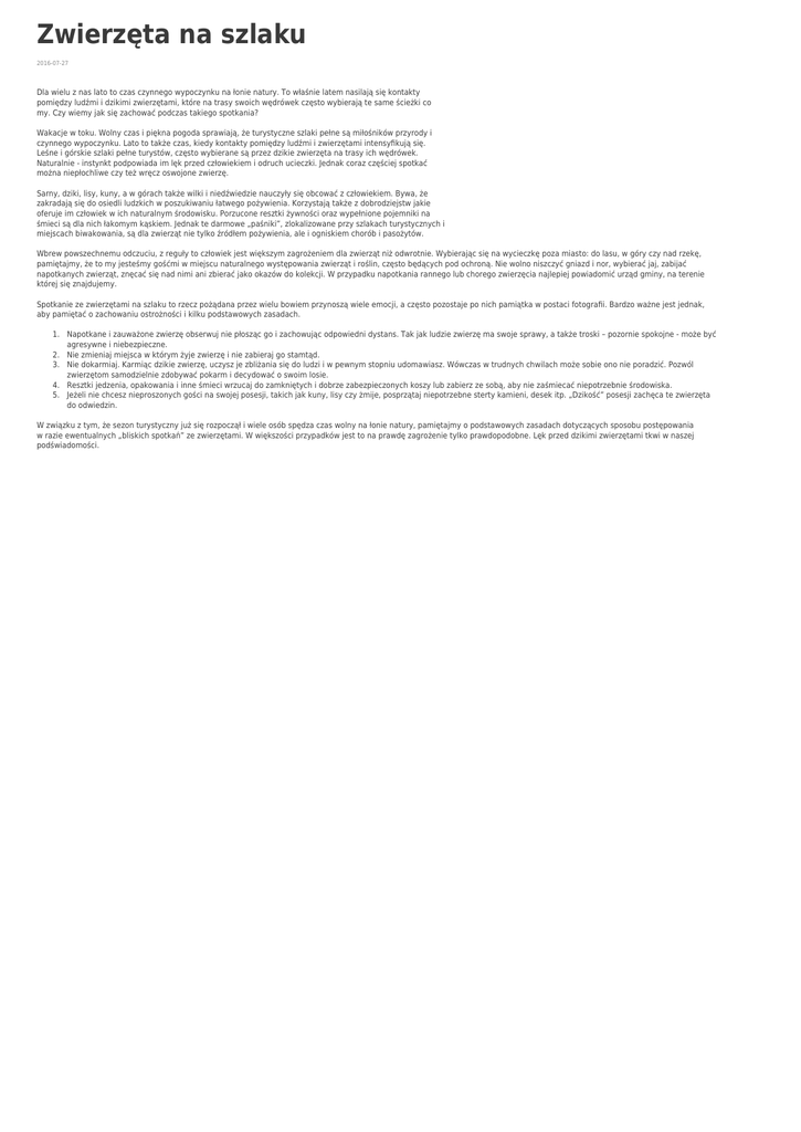 Zwierzęta na szlaku 2016-07-27 Dla wielu z nas lato to czas czynnego wypoczynku na łonie natury. To właśnie latem nasilają się kontakty pomiędzy ludźmi i dzikimi zwierzętami, które na trasy swoich wędrówek często wybierają te same ścieżki co my. Czy wiemy jak się zachować podczas takiego spotkania? Wakacje w toku. Wolny czas i piękna pogoda sprawiają, że turystyczne szlaki pełne są miłośników przyrody i czynnego wypoczynku. Lato to także czas, kiedy kontakty pomiędzy ludźmi i zwierzętami intensyfikują się. Leśne i górskie szlaki pełne turystów, często wybierane są przez dzikie zwierzęta na trasy ich wędrówek. Naturalnie - instynkt podpowiada im lęk przed człowiekiem i odruch ucieczki. Jednak coraz częściej spotkać można niepłochliwe czy też wręcz oswojone zwierzę. Sarny, dziki, lisy, kuny, a w górach także wilki i niedźwiedzie nauczyły się obcować z człowiekiem. Bywa, że zakradają się do osiedli ludzkich w poszukiwaniu łatwego pożywienia. Korzystają także z dobrodziejstw jakie oferuje im człowiek w ich naturalnym środowisku. Porzucone resztki żywności oraz wypełnione pojemniki na śmieci są dla nich łakomym kąskiem. Jednak te darmowe „paśniki”, zlokalizowane przy szlakach turystycznych i miejscach biwakowania, są dla zwierząt nie tylko źródłem pożywienia, ale i ogniskiem chorób i pasożytów. Wbrew powszechnemu odczuciu, z reguły to człowiek jest większym zagrożeniem dla zwierząt niż odwrotnie. Wybierając się na wycieczkę poza miasto: do lasu, w góry czy nad rzekę, pamiętajmy, że to my jesteśmy gośćmi w miejscu naturalnego występowania zwierząt i roślin, często będących pod ochroną. Nie wolno niszczyć gniazd i nor, wybierać jaj, zabijać napotkanych zwierząt, znęcać się nad nimi ani zbierać jako okazów do kolekcji. W przypadku napotkania rannego lub chorego zwierzęcia najlepiej powiadomić urząd gminy, na terenie której się znajdujemy. Spotkanie ze zwierzętami na szlaku to rzecz pożądana przez wielu bowiem przynoszą wiele emocji, a często pozostaje po nich pamiątka w postaci fotografii. Bardzo ważne jest jednak, aby pamiętać o zachowaniu ostrożności i kilku podstawowych zasadach. 1. Napotkane i zauważone zwierzę obserwuj nie płosząc go i zachowując odpowiedni dystans. Tak jak ludzie zwierzę ma swoje sprawy, a także troski – pozornie spokojne - może być agresywne i niebezpieczne. 2. Nie zmieniaj miejsca w którym żyje zwierzę i nie zabieraj go stamtąd. 3. Nie dokarmiaj. Karmiąc dzikie zwierzę, uczysz je zbliżania się do ludzi i w pewnym stopniu udomawiasz. Wówczas w trudnych chwilach może sobie ono nie poradzić. Pozwól zwierzętom samodzielnie zdobywać pokarm i decydować o swoim losie. 4. Resztki jedzenia, opakowania i inne śmieci wrzucaj do zamkniętych i dobrze zabezpieczonych koszy lub zabierz ze sobą, aby nie zaśmiecać niepotrzebnie środowiska. 5. Jeżeli nie chcesz nieproszonych gości na swojej posesji, takich jak kuny, lisy czy żmije, posprzątaj niepotrzebne sterty kamieni, desek itp. „Dzikość” posesji zachęca te zwierzęta do odwiedzin. W związku z tym, że sezon turystyczny już się rozpoczął i wiele osób spędza czas wolny na łonie natury, pamiętajmy o podstawowych zasadach dotyczących sposobu postępowania w razie ewentualnych „bliskich spotkań” ze zwierzętami. W większości przypadków jest to na prawdę zagrożenie tylko prawdopodobne. Lęk przed dzikimi zwierzętami tkwi w naszej podświadomości.