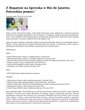Z Bogatyni na Igrzyska w Rio de Janeiro. Potrzebna pomoc! Napisano dnia: 2016-03-24 10:34:05 Agata Czernik i Katarzyna Tendaj – dwie młode dziewczyny, które aplikowały o wyjazd na sportowy wolontariat na Igrzyska Olimpijskie w Rio de Janeiro. Ich aplikacja została rozpatrzona pozytywnie i teraz - dwie studentki czeka przygoda życia. Potrzebna jest jednak pomoc finansowa, która umożliwi wylot do Brazylii. Ta kwota to około 8 000 zł dla każdej z nich. Agata pochodzi z Bogatyni. Aktualnie studiuje na kierunku Menadżer Sportu na wrocławskim AWF-ie. Razem z Kasią mają bardzo bogate doświadczenie jeśli chodzi o wolontariat. Brały udział w największych sportowych wydarzeniach organizowanych w naszym kraju. Wolontariaty: Agata: ● ● ● ● ● ● Halowe Mistrzostwa Świata w Lekkiej atletyce, Sopot 2014 Mistrzostwa Europy w Judo U-23 kobiet i mężczyzn, Wrocław 2014 Otwarte Mistrzostwa Wrocławia Nordic Walking o Puchar Prezydenta Wrocławia 2014, 2015 Fitness trening z Anną Lewandowską, Wrocław 2015 Finał Ligi Europejskiej w piłce nożnej, Warszawa 2015 Christmas Cup w piłce ręcznej, Wrocław 2015 Kasia: ● PTG Sokół Łańcut piłka koszykowa mężczyzn Wspólne: ● ● ● ● ● Mistrzostwa Świata w piłce siatkowej mężczyzn, Wrocław 2014 Impel Wrocław piłka siatkowa kobiet, sezon 2014/2015, 2015/2016 Otwarte Mistrzostwa Wrocławia Nordic Walking o Puchar Prezydenta Wrocławia 2014 Mistrzostwa Europy w piłce ręcznej, Wrocław 2016 Finał Pucharu Polski w piłce siatkowej mężczyzn, Wrocław 2016 Jak powiedziała Agata: Poznałyśmy się na wolontariacie podczas Mistrzostw Świata w piłce siatkowej mężczyzn i od tego czasu razem aplikujemy na różnego rodzaju wolontariaty sportowe. Naszym największym sukcesem jest dostanie się na Igrzyska Olimpijskie do Rio de Janeiro. Jest to dla nas super zabawa i wiedza, a także doświadczenie związane z naszym kierunkiem studiów tj. menadżer sportu. Udział w wolontariacie daje nam radość i możliwość zobaczenia organizacji największych imprez sportowych na świecie. Wyjazd do Rio będzie także przykładem w mojej pracy magisterskiej, którą piszę na temat Sponsoringu w wolontariacie sportowym. Niebawem wystartuje również strona internetowa, na której Agata i Kasia będą zamieszczały informacje dotyczące swoich wolontariatów. Uruchomiony zostanie również numer konta, na który będzie można dokonywać wpłat, które pomogą spełnić sportowe marzenie życia. Patronat honorowy nad wyjazdem objął Burmistrz Miasta i Gminy Bogatynia Andrzej Grzmielewicz.