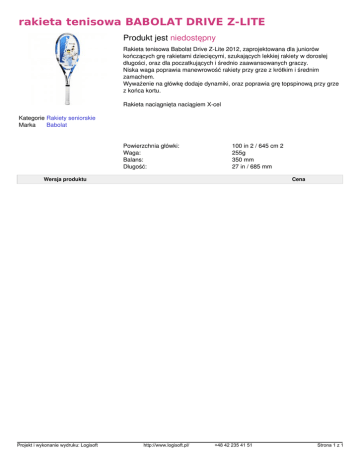 rakieta tenisowa BABOLAT DRIVE Z-LITE Produkt jest niedostępny Rakieta tenisowa Babolat Drive Z-Lite 2012, zaprojektowana dla juniorów kończących grę rakietami dziecięcymi, szukających lekkiej rakiety w dorosłej długości, oraz dla poczatkujących i średnio zaawansowanych graczy. Niska waga poprawia manewrowość rakiety przy grze z krótkim i średnim zamachem. Wyważenie na główkę dodaje dynamiki, oraz poprawia grę topspinową przy grze z końca kortu. Rakieta naciągnięta naciągiem X-cel Kategorie Rakiety seniorskie Marka Babolat Powierzchnia główki: Waga: Balans: Długość: 100 in 2 / 645 cm 2 255g 350 mm 27 in / 685 mm Wersja produktu Projekt i wykonanie wydruku: Logisoft Powered by TCPDF (www.tcpdf.org) Cena http://www.logisoft.pl/ +48 42 235 41 51 Strona 1 z 1