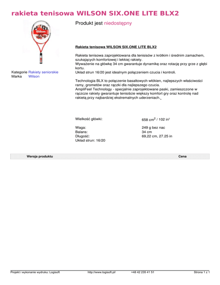 rakieta tenisowa WILSON SIX.ONE LITE BLX2 Produkt jest niedostępny Rakieta tenisowa WILSON SIX.ONE LITE BLX2 Kategorie Rakiety seniorskie Marka Wilson Rakieta tenisowa zaprojektowana dla tenisisów z krótkim i średnim zamachem, szukających komfortowej i lekkiej rakiety. Wyważenie na główkę 34 cm gwarantuje dynamikę oraz rotację przy grze z głębi kortu. Układ strun 16/20 jest idealnym połączeniem czucia i kontroli. Technologia BLX to połączenie basaltowych włókien, najlepszych właściwości ramy, grometów oraz rączki dla najlepszego czucia. AmpliFeel Technology - specjalnie zaprojektowane paski, zamieszczone w rączcze rakiety gwarantuje tenisiście większy komfort gry oraz kontrolę nad rakietą przy najbardziej ekstremalnych uderzeniach. Wielkość główki: 658 cm2 / 102 in Waga: Balans: Długość: Układ strun: 16/20 249 g bez nac 34 cm 69,22 cm, 27.25 in Wersja produktu Projekt i wykonanie wydruku: Logisoft Powered by TCPDF (www.tcpdf.org) 2 Cena http://www.logisoft.pl/ +48 42 235 41 51 Strona 1 z 1