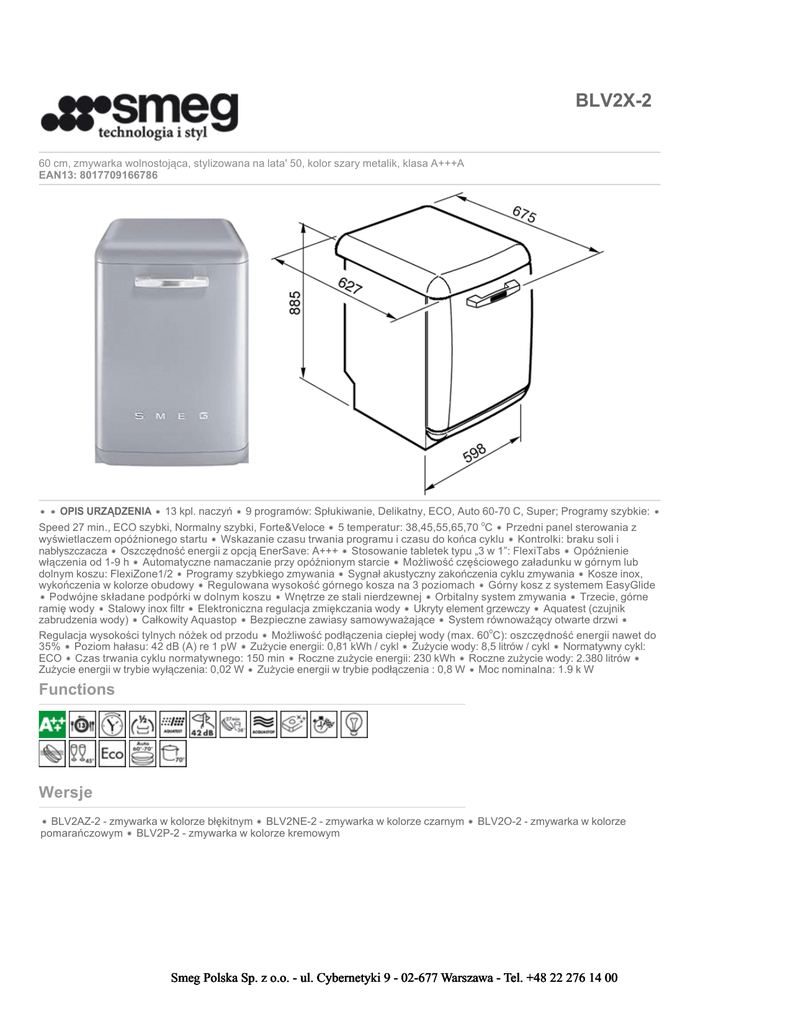 BLV2X-2 60 cm, zmywarka wolnostojąca, stylizowana na lata' 50, kolor szary metalik, klasa A+++A EAN13: 8017709166786 OPIS URZĄDZENIA 13 kpl. naczyń 9 programów: Spłukiwanie, Delikatny, ECO, Auto 60-70 C, Super; Programy szybkie: Speed 27 min., ECO szybki, Normalny szybki, Forte&Veloce 5 temperatur: 38,45,55,65,70 oC Przedni panel sterowania z wyświetlaczem opóźnionego startu Wskazanie czasu trwania programu i czasu do końca cyklu Kontrolki: braku soli i nabłyszczacza Oszczędność energii z opcją EnerSave: A+++ Stosowanie tabletek typu „3 w 1”: FlexiTabs Opóźnienie włączenia od 1-9 h Automatyczne namaczanie przy opóźnionym starcie Możliwość częściowego załadunku w górnym lub dolnym koszu: FlexiZone1/2 Programy szybkiego zmywania Sygnał akustyczny zakończenia cyklu zmywania Kosze inox, wykończenia w kolorze obudowy Regulowana wysokość górnego kosza na 3 poziomach Górny kosz z systemem EasyGlide Podwójne składane podpórki w dolnym koszu Wnętrze ze stali nierdzewnej Orbitalny system zmywania Trzecie, górne ramię wody Stalowy inox filtr Elektroniczna regulacja zmiękczania wody Ukryty element grzewczy Aquatest (czujnik zabrudzenia wody) Całkowity Aquastop Bezpieczne zawiasy samowyważające System równoważący otwarte drzwi Regulacja wysokości tylnych nóżek od przodu Możliwość podłączenia ciepłej wody (max. 60oC): oszczędność energii nawet do 35% Poziom hałasu: 42 dB (A) re 1 pW Zużycie energii: 0,81 kWh / cykl Zużycie wody: 8,5 litrów / cykl Normatywny cykl: ECO Czas trwania cyklu normatywnego: 150 min Roczne zużycie energii: 230 kWh Roczne zużycie wody: 2.380 litrów Zużycie energii w trybie wyłączenia: 0,02 W Zużycie energii w trybie podłączenia : 0,8 W Moc nominalna: 1.9 k W Functions Wersje BLV2AZ-2 - zmywarka w kolorze błękitnym BLV2NE-2 - zmywarka w kolorze czarnym pomarańczowym BLV2P-2 - zmywarka w kolorze kremowym BLV2O-2 - zmywarka w kolorze Smeg Polska Sp. z o.o. - ul. Cybernetyki 9 - 02-677 Warszawa - Tel. +48 22 276 14 00