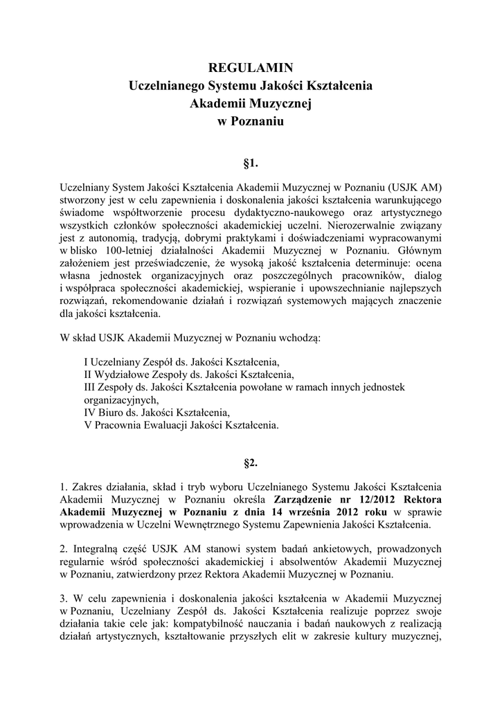 REGULAMIN Uczelnianego Systemu Jakości Kształcenia Akademii Muzycznej w Poznaniu §1. Uczelniany System Jakości Kształcenia Akademii Muzycznej w Poznaniu (USJK AM) stworzony jest w celu zapewnienia i doskonalenia jakości kształcenia warunkującego świadome współtworzenie procesu dydaktyczno-naukowego oraz artystycznego wszystkich członków społeczności akademickiej uczelni. Nierozerwalnie związany jest z autonomią, tradycją, dobrymi praktykami i doświadczeniami wypracowanymi w blisko 100-letniej działalności Akademii Muzycznej w Poznaniu. Głównym założeniem jest przeświadczenie, że wysoką jakość kształcenia determinuje: ocena własna jednostek organizacyjnych oraz poszczególnych pracowników, dialog i współpraca społeczności akademickiej, wspieranie i upowszechnianie najlepszych rozwiązań, rekomendowanie działań i rozwiązań systemowych mających znaczenie dla jakości kształcenia. W skład USJK Akademii Muzycznej w Poznaniu wchodzą: I Uczelniany Zespół ds. Jakości Kształcenia, II Wydziałowe Zespoły ds. Jakości Kształcenia, III Zespoły ds. Jakości Kształcenia powołane w ramach innych jednostek organizacyjnych, IV Biuro ds. Jakości Kształcenia, V Pracownia Ewaluacji Jakości Kształcenia. §2. 1. Zakres działania, skład i tryb wyboru Uczelnianego Systemu Jakości Kształcenia Akademii Muzycznej w Poznaniu określa Zarządzenie nr 12/2012 Rektora Akademii Muzycznej w Poznaniu z dnia 14 września 2012 roku w sprawie wprowadzenia w Uczelni Wewnętrznego Systemu Zapewnienia Jakości Kształcenia. 2. Integralną część USJK AM stanowi system badań ankietowych, prowadzonych regularnie wśród społeczności akademickiej i absolwentów Akademii Muzycznej w Poznaniu, zatwierdzony przez Rektora Akademii Muzycznej w Poznaniu. 3. W celu zapewnienia i doskonalenia jakości kształcenia w Akademii Muzycznej w Poznaniu, Uczelniany Zespół ds. Jakości Kształcenia realizuje poprzez swoje działania takie cele jak: kompatybilność nauczania i badań naukowych z realizacją działań artystycznych, kształtowanie przyszłych elit w zakresie kultury muzycznej, podniesienie atrakcyjności i konkurencyjności Akademii Muzycznej w odniesieniu do innych uczelni polskich i zagranicznych oraz dbanie o wypełnienie misji i strategii jej rozwoju. Zespoły ds. Jakości Kształcenia poszczególnych jednostek dydaktycznych i organizacyjnych odpowiednio do miejsca ich powołania realizują swoje działania mając na uwadze misję i strategię rozwoju wydziałów i innych jednostek organizacyjnych w zakresie doskonalenia jakości kształcenia. §3. 1. W skład Uczelnianego Zespołu ds. Jakości Kształcenia wchodzą: - Dziekani wszystkich wydziałów, - Przewodniczący Wydziałowych Zespołów ds. Jakości Kształcenia, - Przewodniczący Zespołów ds. Jakości Kształcenia innych jednostek organizacyjnych (np. administracja, jednostki ogólnouczelniane i międzywydziałowe), - jeden przedstawiciel studentów studiów I stopnia, - jeden przedstawiciel studentów studiów II stopnia, - jeden przedstawiciel studentów III stopnia. 2. Przewodniczącym Zespołu jest Pełnomocnik Rektora ds. Jakości Kształcenia mianowany przez Rektora AM na okres kadencji organów uczelni. 3. Uczelniany Zespół ds. Jakości Kształcenia pełni przede wszystkim funkcję doradczą dla Rektora. W szczególności opracowuje i przedstawia Rektorowi wnioski i projekty dotyczące strategii zapewniania i doskonalenia jakości kształcenia w Akademii Muzycznej zgodne z misją i strategią rozwoju uczelni oraz ogólnouczelnianymi procedurami zapewnienia jakości kształcenia, a także nadzoruje zasady tworzenia systemów zapewnienia jakości kształcenia na wydziałach i w innych jednostkach organizacyjnych uczelni. 4. Wewnętrzne systemy zapewniania jakości kształcenia na wydziałach i w innych jednostkach organizacyjnych Akademii Muzycznej w Poznaniu budowane są w oparciu o opracowane przez Uczelniany Zespół ds. Jakości Kształcenia i zaakceptowane przez Rektora AM propozycje dotyczące rozwiązań i monitorowania jakości kształcenia na wydziałach i w innych jednostkach organizacyjnych. Dotyczy to m.in. okresowego przeglądu programów nauczania i ich efektów, zasad oceniania studentów i zasad zapewniania jakości kadry dydaktycznej, zasad przeglądu i podnoszenia jakości zasobów naukowych i artystycznych, zasad wsparcia dla studentów, zasad gromadzenia, analizowania i publikowania informacji na temat jakości kształcenia. 5. Podstawowym narzędziem USJK AM są sprawozdania z oceny własnej jednostek dydaktycznych uczelni. Zadaniem Uczelnianego Zespołu jest ustalenie harmonogramu badań poszczególnych zagadnień związanych z jakością kształcenia oraz opracowanie formularzy sprawozdań z oceny własnej dla wydziałów i innych jednostek organizacyjnych. Istotnym elementem monitorowania jakości kształcenia są również ogólnouczelniane badania ankietowe dotyczące jakości kształcenia i organizacji pracy uczelni, które przygotowuje Uczelniany Zespół ds. Jakości Kształcenia wg wcześniej ustalonego harmonogramu. Podobne zadania realizują również Wydziałowe Zespoły ds. Jakości Kształcenia, a wyniki przekazują do Uczelnianego Zespołu ds. Jakości Kształcenia. Uczelniany Zespół dokonuje analizy sprawozdań i sporządza na ich podstawie raport na temat jakości kształcenia, który przedstawia Rektorowi wraz z rekomendowanymi zmianami dotyczącymi upowszechniania wzorów dobrych praktyk w dziedzinie jakości kształcenia. §4. 1. Na poziomie jednostek dydaktycznych i organizacyjnych działają zespoły (Wydziałowe Zespoły ds. Jakości Kształcenia), które podejmują działania na rzecz zapewniania i doskonalenia jakości kształcenia w jednostce dydaktycznej lub organizacyjnej. W tym celu zespoły opracowują i przedstawiają dziekanom lub kierownikom jednostki wnioski i projekty dotyczące Wewnętrznego Systemu Zapewniania Jakości Kształcenia 