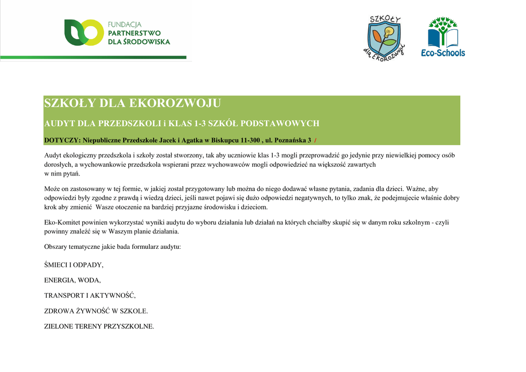 SZKOŁY DLA EKOROZWOJU AUDYT DLA PRZEDSZKOLI i KLAS 1-3 SZKÓŁ PODSTAWOWYCH DOTYCZY: Niepubliczne Przedszkole Jacek i Agatka w Biskupcu 11-300 , ul. Poznańska 3 / Audyt ekologiczny przedszkola i szkoły został stworzony, tak aby uczniowie klas 1-3 mogli przeprowadzić go jedynie przy niewielkiej pomocy osób dorosłych, a wychowankowie przedszkola wspierani przez wychowawców mogli odpowiedzieć na większo ć zawartych w nim pytań. Mo e on zastosowany w tej formie, w jakiej został przygotowany lub mo na do niego dodawać własne pytania, zadania dla dzieci. Wa ne, aby odpowiedzi były zgodne z prawdą i wiedzą dzieci, je li nawet pojawi się du o odpowiedzi negatywnych, to tylko znak, e podejmujecie wła nie dobry krok aby zmienić Wasze otoczenie na bardziej przyjazne rodowisku i dzieciom. Eko-Komitet powinien wykorzystać wyniki audytu do wyboru działania lub działań na których chciałby skupić się w danym roku szkolnym - czyli powinny znale ć się w Waszym planie działania. Obszary tematyczne jakie bada formularz audytu: MIźCI I ODPADY, ENERGIA, WODA, TRANSPORT I AKTYWNO Ć, ZDROWA YWNO Ć W SZKOLź. ZIELONE TERENY PRZYSZKOLNE. LEGENDA: Znak ten wskazuje, e odpowied na to pytanie uczniowie mogą odnale ć samodzielnie obserwując otoczenie swojej szkoły lub przedszkola. Na niektóre z tych pytań będą potrzebowali W przypadku tego rodzaju pytań, być mo e potrzebne będzie przepytanie większej liczby dzieci o zdanie lub ich wiedzę, czy zachowania. Te pytania dotyczą mierzenia Waszego wpływu na rodowisko i dają Wam mo liwo ć pokazania jakie postępy udało się Wam osiągnąć. Je li przy Waszej odpowiedzi znajduje się u miechnięta bu ka - jeste cie w tym aspekcie szkołą przyjazną rodowisku i dzieciom Je li przy Waszej odpowiedzi znajduje się smutna bu ka - jeszcze w tym aspekcie mo ecie popracować aby być szkołą bardziej przyjazną rodowisku i dzieciom MIźCI i miecenie Zastanowimy się i sprawd my, czy nasza szkoła i teren wokół niej jest czysty i czy wszyscy wiemy gdzie wyrzucać nasze mieci? Czy na podłodze w szkole możecie znaleźć jakieś śmieci? NIE Czy na zewnątrz - wokół szkoły możecie znaleźć jakieś śmieci pozostawione na ziemi? Czy w czasie zabawy, po zabawie, wszystkie dzieci wyrzucają swoje śmieci do kosza? Czy któryś z koszy na śmieci w szkole jest przepełniony? Czy wszyscy w Waszej szkole wiedzą dlaczego należy wyrzucać śmieci w odpowiednie miejsce (do kosza, odpowiednich pojemników)? TAK TAK NIE TAK ODPADY - ograniczanie, ponowne wykorzystanie i recykling Czy większość uczniów przynosi swoje drugie śniadanie w opakowaniu, które można ponownie użyć (np. pudełko śniadaniowe)? Nie dotyczy Czy nauczyciele i wychowawcy drukują i kserują dokumenty dwustronnie (obie strony są zadrukowane) kiedy to tylko możliwe? TAK Czy używacie drugiej strony papieru (zadrukowanego jednostronnie) do rysunków, notatek, itp. zanim trafi do kosza? TAK Czy w toalecie szkolnej używany jest papier z recyklingu? Czy w szkole organizowane są wymiany lub giełdy używanych książek, gier, filmów, itp.? Czy w koszach do sortowania śmieci zawsze znajdują się odpowiednie odpady? Czy w Waszej szkole znajduje się kompost? TAK TAK TAK TAK Czy osoby gotujące w szkolnej kuchni wyrzucają odpady po warzywach i owocach na kompost? Czy wiecie co dzieje się z odpadami, które trafiły do recyklingu? Czy wiecie co dzieje się ze śmieciami, które trafiły do zwykłego kosza na śmieci? Czy szkoła używa poczty elektronicznej (e-mail) do kontaktu z rodzicami? TAK TAK TAK TAK ENERGIA Czy światło jest zawsze wyłączane, kiedy klasa jest pusta? Czy światło jest gaszone jeśli w klasie jest wystarczająco słonecznie? Czy sprawdzacie, czy wszystkie światła i komputery są wyłączone np. w czasie długiej przerwy lub po lekcjach? Czy okna i drzwi są zamykane kiedy ogrzewanie jest włączone? Czy zasłony, firanki w czasie ogrzewania zasłaniają kaloryfer? TAK TAK TAK TAK NIE WODA Czy z któregoś kranu cieknie/kapie woda po zakręceniu? NIE Czy zdarza się, że ktoś pozostawia włączoną wodę w łazience i wychodzi? Czy spłuczka posiada funkcję start-stop lub ma dwudzielny przycisk? Jeśli nie - to czy w spłuczkach znajduje się ogranicznik spłukiwanej wody? (specjalne opakowanie lub plastikowa butelka napełniona wodą) TAK TAK TAK Czy na zewnątrz szkoły znajduje się zbiornik lub zbiorniki na wodę deszczową? (wykorzystywaną później np. do podlewania kwiatów) Czy wiecie, czy w Waszej miejscowości można pić bezpiecznie wodę z kranu? NIE TAK Czy wiecie dlaczego tak ważne jest oszczędzanie wody? TAK TRANSPORT i AKTYWNO Ć Czy droga piesza do Twojej szkoły jest bezpieczna? NIE Czy do Twojej szkoły można dojechać bezpiecznie na rowerze? (np. ścieżkami rowerowymi) Czy przed szkołą znajdują się stojaki rowerowe dla rodziców i uczniów? Czy codziennie w szkole macie ćwiczenia ruchowe? Czy w roku szkolnym są dni, w których zachęcacie jak największą liczbę dzieci do przyjścia pieszo do szkoły? Czy w szkole organizowane są wspólne piesze wycieczki? NIE TAK TAK TAK TAK Czy rano i na koniec lekcji, przed szkołą znajduje się duża liczba zaparkowanych samochodów? Czy w szkole prowadzone są zajęcia jak bezpiecznie jeździć na rowerze? TAK TAK Czy badacie, ilu uczniów podwozi samochodem jeden rodzic? (np. rodzice podwożą dzieci sąsiadów) NIE Czy w szkole liczycie co jakiś czas ile osób dojeżdża do szkoły rowerem lub chodzi pieszo? TAK Czy rodzice czekający w samochodzie na dzieci, wyłączają silnik w zaparkowanym samochodzie? TAK Czy wszystkie dzieci wiedzą jak bezpiecznie przechodzić przez ulicę? TAK ZDROWA YWNO Ć W SZKOLE Czy każdego dnia jecie owoce (np. w trakcie przerwy, po obiedzie)? Czy do szkolnego obiadu serwowana jest sałatka/warzywa? Czy możliwe jest żeby mieć ze sobą butelkę wody w trakcie lekcji/zajęć? Czy dzieci uprawiają jakieś warzywa lub owo