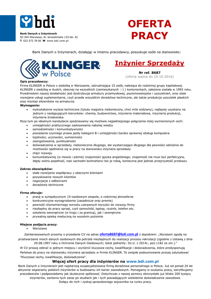 OFERTA PRACY Bank Danych o Inżynierach 02-304 Warszawa, Al. Jerozolimskie 133 lok. 42 T 022 572 78 00 W www.bdi.com.pl Bank Danych o Inżynierach, działając w imieniu pracodawcy, poszukuje osób na stanowisko: Inżynier Sprzedaży Nr ref. 8687 (oferta ważna do 19.10.2016) Opis pracodawcy: Firma KLINGER w Polsce z siedzibą w Warszawie, zatrudniająca 15 osób, należąca do rodzinnej grupy kapitałowej KLINGER z siedzibą w Austrii, obecnej na wszystkich (zamieszkanych :-) ) kontynentach, założona została w 1992 roku. Przedmiotem naszej działalności jest dystrybucja armatury przemysłowej, poziomowskazów i uszczelnień, oraz stale rozwijane usługi suplementarne, czyli przede wszystkim doradztwo techniczne, ale także produkcja uszczelek płaskich oraz montaż siłowników na armaturze. Wymagania: wykształcenie wyższe techniczne (tytułu magistra niekonieczny, choć mile widziany), najlepiej uzyskany na jednym z następujących kierunków: chemia, budownictwo, inżynieria materiałowa, inżynieria produkcji, inżynieria środowiska. Poza tym po idealnym kandydacie spodziewamy się możliwie najpełniejszego połączenia niżej wymienionych cech: umiejętności praktycznego zastosowania nabytej wiedzy samodzielności i komunikatywności posiadania czynnego prawa jazdy kategorii B i umiejętności bardzo sprawnej obsługi komputera lojalności, uczciwości, sumienności zaangażowania, punktualności doświadczenia w sprzedaży, niekoniecznie długiego, ale wystarczająco długiego dla pewności odnośnie do możliwości spełnienia się w pracy na stanowisku inżyniera sprzedaży chęci rozwoju komunikatywnej (w mowie i piśmie) znajomości języka angielskiego; znajomość nie musi być perfekcyjna, błędy wolno popełniać, nasi zachodni kontrahenci też je robią, konieczna jest jednak przejrzystość przekazu Zakres obowiązków: stałe rozwijanie współpracy z obecnymi klientami pozyskiwanie nowych klientów negocjacje z odbiorcami doradztwo techniczne Firma oferuje: pracę w sympatycznym 15-osobowym zespole, o rodzinnej atmosferze konkurencyjne wynagrodzenie (zasadnicze oraz premie) pewność równomiernego wzrostu czerpanych korzyści do rozwoju firmy niezbędny do pracy sprzęt, czyli samochód, laptop, rzutnik, telefon etc. szkolenia wewnętrzne (w kraju i za granicą), jak i zewnętrzne prywatną opiekę medyczną na wysokim poziomie Miejsce podjęcia pracy: Warszawa Zainteresowanych prosimy o przesłanie CV na adres [email protected] z dopiskiem: „Wyrażam zgodę na przetwarzanie moich danych osobowych dla potrzeb niezbędnych do realizacji procesu rekrutacji (zgodnie z Ustawą z dnia 29.08.1997 roku o Ochronie Danych Osobowych; tekst jednolity: Dz.U. z 2014r., poz.1182 ze zm.).” W CV proszę zebrać w jednym miejscu i wyróżnić kluczowe cechy, kwalifikacje i doświadczenia, które predysponują Państwa do pracy na stanowisku inżyniera sprzedaży w firmie KLINGER. To zwięzłe podsumowanie proszę zatytułować "Kluczowe cechy, kwalifikacje, doświadczenia". Więcej ofert pracy dla inżynierów na www.bdi.com.pl Bank Danych o Inżynierach jest najstarszą wyspecjalizowana firmą doradztwa personalnego w Polsce. Już od ponad 24 lat aktywnie wspieramy polskich inżynierów w budowaniu ich karier zawodowych. Pomagamy w szukaniu pracy, weryfikujemy pracodawców i podpowiadamy jak skutecznie aplikować. Dotychczas z naszej pomocy skorzystało już blisko 200 tysięcy inżynierów, zarówno tych zaraz po studiach jak i tych posiadających wieloletnie doświadczenie zawodowe. Dołącz do nich i zyskaj sprawdzonego sojusznika na rynku pracy.