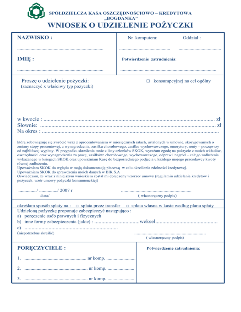 SPÓŁDZIELCZA KASA OSZCZĘDNOŚCIOWO – KREDYTOWA „BOGDANKA” WNIOSEK O UDZIELENIE POŻYCZKI NAZWISKO : ....................................................................... IMIĘ : ....................................................................... Nr komputera: .......................................... Oddział : ................................... Potwierdzenie zatrudnienia: ................... ........................................................... □ Proszę o udzielenie pożyczki: konsumpcyjnej na cel ogólny (zaznaczyć x właściwy typ pożyczki) w kwocie : ......................................................................................................................... zł Słownie: ............................................................................................................................ zł Na okres : ............................................................................................................................. którą zobowiązuję się zwrócić wraz z oprocentowaniem w miesięcznych ratach, ustalonych w umowie, skorygowanych o zmiany stopy procentowej, z wynagrodzenia, zasiłku chorobowego, zasiłku wychowawczego, emerytury, renty – począwszy od najbliższej wypłaty. W przypadku skreślenia mnie z listy członków SKOK, wyrażam zgodę na pokrycie z moich wkładów, oszczędności oraz wynagrodzenia za pracę, zasiłków: chorobowego, wychowawczego, odpraw i nagród – całego zadłużenia wykazanego w księgach SKOK oraz upoważniam Kasę do bezpośredniego podjęcia u każdego mojego pracodawcy kwoty równej zadłużeniu. Upoważniam SKOK do wglądu w moją dokumentację płacową w celu określenia zdolności kredytowej. Upoważniam SKOK do sprawdzenia moich danych w BIK S.A Oświadczam, że wraz z niniejszym wnioskiem został mi doręczony wzorzec umowy (regulamin udzielania kredytów i pożyczek, wzór umowy pożyczki konsumenckiej) .............../ .............../ 2007 r /data/ .......................................................... ( własnoręczny podpis) określam sposób spłaty na : □ spłata przez transfer □ spłata własna w kasie według planu spłaty Udzieloną pożyczkę proponuje zabezpieczyć następująco : a) poręczenie osób prawnych i fizycznych b) inne formy zabezpieczenia (jakie) : ................................weksel............................................ c) .................................................................. (niepotrzebne skreślić) ........................................................... ( własnoręczny podpis) PORĘCZYCIELE : 1. ................................................... nr komp. ........................ 2. .................................................... nr komp. ...................... 3. .................................................... nr komp. ...................... Potwierdzenie zatrudnienia: DECYZJA SKOK STWIERDZAM NASTĘPUJĄCY STAN KONT WNIOSKODAWCY : Przeciętny dochód w rodzinie...................................................................................................................... Ilość osób w rodzinie ............................................................................................................................ Przeciętne wynagrodzenie: ......................................................................................................................... Wynagrodzenie netto (ROR ) : ................................................................................................................... Inne zobowiązania (np. w bankach).......................................................................................................................................... Obciążenia miesięcznie : ........................................................................................................................... Wyliczenie zdolności kredytowej.............................................................................................................. Opinia pracownika SKOK Udzielenie kredytu ..................................................... /data/ Odmowa udzielenia kredytu ......................................................... /podpis pracownika SKOK/ PROPONUJE SIĘ 1. Przyznać pożyczkę w kwocie : ............................................................................................................. Oprocentowanie w dniu udzielenia pożyczki ................... % - zmienna stopa oprocentowania. Termin realizacji pożyczki ......................................................................................................................... 2. Odmówić przyznania pożyczki .............................................................................................................. .............../...................../ 2007 r /data/ ......................................................... /podpis Kierownika SKOK/ OPINIA KOMISJI KREDYTOWEJ 1. Przyznano wnioskodawcy pożyczkę w kwocie ....................................................................................... Słownie : ......................................................................................................................................................... 2. Nie przyznano pożyczki : ......................................................................................................................... .......................................................................................................................................................................... Podpisy Komisji Kredytowej DECYZJA O PRZYZNANIU POŻYCZKI Zatwierdzono/Nie do wypłaty kwotę w wysokości : ................................................................................zł Słownie: ........................................................................................................................................................ ...................................................... /data/ ..........