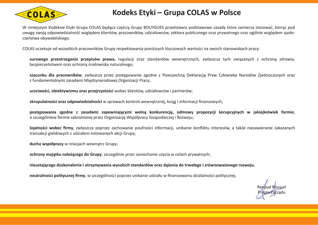 Kodeks Etyki – Grupa COLAS w Polsce W niniejszym Kodeksie Etyki Grupa COLAS będąca częścią Grupy BOUYGUES przedstawia podstawowe zasady które zamierza stosować, biorąc pod uwagę swoją odpowiedzialność względem klientów, pracowników, udziałowców, sektora publicznego oraz prywatnego oraz ogólnie względem społeczeństwa obywatelskiego. COLAS oczekuje od wszystkich pracowników Grupy respektowania poniższych kluczowych wartości na swoich stanowiskach pracy: surowego przestrzegania przepisów prawa, regulacji oraz standardów wewnętrznych, zwłaszcza tych związanych z ochroną zdrowia, bezpieczeństwem oraz ochroną środowiska naturalnego; szacunku dla pracowników, zwłaszcza przez postępowanie zgodne z Powszechną Deklaracją Praw Człowieka Narodów Zjednoczonych oraz z fundamentalnymi zasadami Międzynarodowej Organizacji Pracy; uczciwości, obiektywizmu oraz przejrzystości wobec klientów, udziałowców i partnerów; skrupulatności oraz odpowiedzialności w sprawach kontroli wewnętrznej, ksiąg i informacji finansowych; postępowania zgodne z zasadami zapewniającymi wolną konkurencję, odmowy propozycji korupcyjnych w jakiejkolwiek formie, a szczególniew formie zabronionej przez Organizację Współpracy Gospodarczej i Rozwoju; lojalności wobec firmy, zwłaszcza poprzez zachowanie poufności informacji, unikanie konfliktu interesów, a także niezawieranie zakazanych transakcji giełdowych z udziałem notowanych akcji Grupy; ducha współpracy w relacjach wewnątrz Grupy; ochrony majątku należącego do Grupy, szczególnie przez zaniechanie użycia w celach prywatnych; nieustającego doskonalenia i utrzymywania wysokich standardów oraz dążenia do trwałego i zrównoważonego rozwoju; neutralności politycznej firmy, w szczególności poprzez unikanie udziału w finansowaniu działalności politycznej. Renaud Roussel Prezes Zarządu