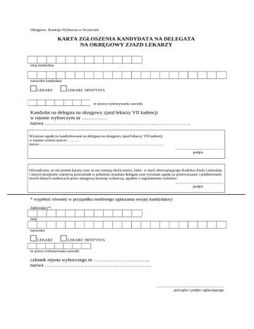 Okręgowa Komisja Wyborcza w Szczecinie KARTA ZGŁOSZENIA KANDYDATA NA DELEGATA NA OKRĘGOWY ZJAZD LEKARZY imię kandydata nazwisko kandydata □ LEKARZ □ LEKARZ DENTYSTA nr prawa wykonywania zawodu Kandydat na delegata na okręgowy zjazd lekarzy VII kadencji w rejonie wyborczym nr …………… nazwa …………………….………………………………….………………… Wyrażam zgodę na kandydowanie na delegata na okręgowy zjazd lekarzy VII kadencji w rejonie wyborczym nr …….… nazwa …………………………………………….……………………………………… .................................................. podpis Oświadczam, że nie jestem karany oraz że nie istnieją okoliczności, które w myśl obowiązującego Kodeksu Etyki Lekarskiej i innych przepisów stanowią przeszkodę w pełnieniu mandatu delegata oraz wyrażam zgodę na przetwarzanie i publikowanie moich danych osobowych przez okręgową komisję wyborczą, zgodnie z regulaminem wyborów. .................................................. podpis * wypełnić również w przypadku osobistego zgłaszania swojej kandydatury Zgłaszający*: imię nazwisko □ LEKARZ □ LEKARZ DENTYSTA nr prawa wykonywania zawodu członek rejonu wyborczego nr ………………………..…, nazwa …………………………………………..…………. ...................................................................... pieczątka i podpis zgłaszającego