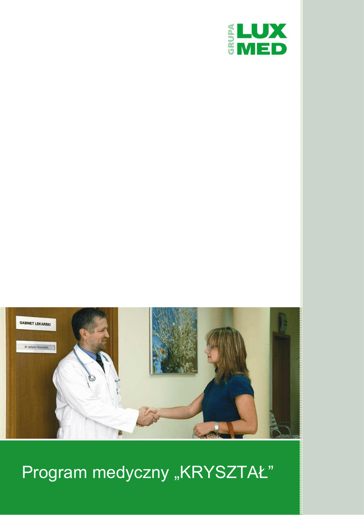 Program medyczny „KRYSZTAŁ” Zasady przystąpienia do programu medycznego Grupa LUX MED opracowała program medyczny "KRYSZTAŁ" obejmujący szeroki zakres badań i konsultacji specjalistycznych oraz atrakcyjny rabat na usługi nie objęte programem. Program medyczny jest dedykowany osobom chcącym zadbać o swoje zdrowie. Oferta składa się z zalecanych konsultacji lekarskich związanych z obowiązkową profilaktyką dla danej grupy wiekowej, rozszerzonych konsultacji specjalistycznych i rozszerzonych badań diagnostycznych. W przypadku programu „KRYSZTAŁ” mają Państwo do dyspozycji profesjonalną opieką medyczną jaką może zagwarantować Grupa LUX MED. Zasady przystąpienia do indywidualnego programu „KRYSZTAŁ”: • Program skierowany jest dla osób od 15 do 65 roku życia. • Obsługa w ramach pakietu odbywa się w placówkach własnych: • PROMEDIS • MEDYCYNA RODZINNA wskazanych na funkcjonowania. stronie internetowej www.promedis.pl w godzinach ich W ramach pakietu Kryształ nie ma możliwości korzystania z placówek współpracujących. • Opłaty dokonywane są na indywidualne konto bankowe wskazane w Umowie i wynoszą: • 1000 PLN (za rok) za osobę, w przypadku płatności uiszczanej za rok z góry. • 1100 PLN (za rok) za osobę, w przypadku płatności, uiszczanej w ratach półrocznych. • Umowa podpisywana jest minimum na rok, z możliwością automatycznego przedłużenia na kolejny; • W przypadku chęci skorzystania z opieki medycznej w ramach oferty prosimy o wypełnienie i przesłanie wypełnionego Formularza danych, na adres [email protected] • Na podstawie otrzymanego Formularza danych przygotujemy dwa podpisane ze strony LUX MED egzemplarze Umowy, które zostaną wysyłane listem zwykłym priorytetowym na adres korespondencyjny do podpisu. • Po otrzymaniu umowy prosimy o dokonanie wpłaty na podane w umowie indywidualny numer rachunku i wysłanie do nas potwierdzenia dokonania wpłaty. • Umowy wchodzą w życie z 1 dniem następnego miesiąca, po otrzymaniu przez dział sprzedaży co najmniej na 5 dni roboczych przed końcem miesiąca potwierdzenia wpłaty na konto i dostarczenia podpisanego oryginału Umowy. Klientów chcących wykupić opieką medyczną prosimy o kontakt telefoniczny pod numer 22 339 37 33, lub e-mailowy na adres [email protected] 2 Zakres programu ZAKRES OPIEKI MEDYCZNEJ Cena pakietu (za rok) za osobę, w przypadku płatności uiszczanych za rok z góry 1000zł Cena pakietu (za rok) za osobę, w przypadku płatności uiszczanych w ratach półrocznych 1100 zł Rozszerzone konsultacje specjalistyczne Rozszerzone badania diagnostyczne Szczepienia przeciwko grypie/ anatoksyna p/tężcowa Prowadzenie ciąży Konsultacyjne zabiegi ambulatoryjne 10% rabat na pozostałe usługi świadczone przez Grupę LUX MED Definicje usług medycznych Rozszerzone konsultacje specjalistyczne W ramach abonamentu pacjent ma nielimitowany dostęp do konsultacji lekarzy specjalistów w sytuacjach chorobowych, leczenia i zaostrzenia chorób przewlekłych, pomoc w nagłych zachorowaniach, poradnictwa ogólnomedycznego i specjalistycznego. Konsultacje specjalistyczne obejmują: wywiad, poradę specjalisty wraz z czynnościami podstawowymi niezbędnymi do postawienia diagnozy, podjęcia właściwej decyzji terapeutycznej, monitorowania leczenia. Zleceniobiorca gwarantuje Pacjentom dostęp bez skierowania do lekarzy niżej wymienionych specjalności w Centrach Medycznych PROMEDIS i Medycyna Rodzinna. • • • • • • • • • • • • • • choroby wewnętrzne (internista) lekarz medycyny rodzinnej ginekolog laryngolog okulista dermatolog neurolog 3 reumatolog ortopeda kardiolog endokrynolog diabetolog chirurg ogólny urolog • • • • • • alergolog gastrolog nefrolog onkolog hematolog lekarz dyżurny Rozszerzone badania diagnostyczne W zakres rozszerzonych badań diagnostycznych wchodzą niżej wymienione badania diagnostyki laboratoryjnej, obrazowej i czynnościowej. Liczba wykonywanych badań diagnostycznych jest nielimitowana. Badania diagnostyczne wykonywane są na podstawie skierowań wystawionych przez lekarza Centrum Medycznego Medycyna Rodzinna/PROMEDIS. Diagnostyka laboratoryjna: OB, morfologia krwi obwodowej z rozmazem, retykulocyty, czas tromboplastynowy (INR), APTT, białko C-reaktywne, ALAT – aminotransferaza alaninowa, ASPAT – aminotransferaza asparaginianowa, amylaza we krwi, albuminy, białko całkowite, chlorki, cholesterol całkowity, cholesterol HDL, cholesterol LDL, fosfataza zasadowa, GGTP – gammaglutamylostranspeptydaza, glukoza - badanie glukometrem, glukoza, kreatynina, kwas moczowy, magnez, p/anty-HBs, mocznik, potas, sód, trójglicerydy, wapń, żelazo, TIBC – całkowita zdolność wiązania żelaza, szybki test troponinowy/Troponina I, TSH, beta-HCG, PSA, odczyn TPHA, ASO, RF-czynnik reumatoidalny, antygen HBs (HBs-Ag), test BTA, grupa krwi, przeciwciała anty-HCV, toksoplazmoza przeciwciała w klasie IGG/IGM, badanie ogólne moczu + osad, posiewy i wymazy w kierunku bakterii tlenowych – posiew moczu, posiew kału ogólny, wymaz z gardła, w zależności od wskazań dodatkowo antybiogram, posiew i wymaz w kierunku bakterii tlenowych i beztlenowych – wymaz z ucha, oka, nosa, odbytu, pochwy, rany, czystość pochwy, posiew plwociny, wymaz z szyjki macicy, na krew utajoną, badania cytologiczne – cytologia ginekologiczna, badania mykologiczne z posiewem, mykogram, badania toksykologiczne – digoksyna, ołów. Diagnostyka obrazowa: badania rentgenowskie (wykonywane niezależnie od rodzaju i ilości projekcji): RTG czaszki, RTG żuchwy, RTG zatok, RTG nosa, RTG klatki piersiowej – AP+bok/AP/bok, RTG żeber, RTG mostka, RTG łopatki, RTG obojczyków, RTG nosogardła (trzeci migdał), RTG kości kończyn (np. podudzia, udowej, ramienia, przedramienia), RTG stawów (np. skokowych, kolanowych, barkowych, łokciowych, biodrowych), RTG miednicy, RTG jamy brzusznej, RTG kości krzyżow