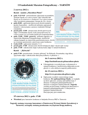I Frankofoński Maraton Fotograficzny – TARNÓW 2 czerwca 2012 r. Rynek - namiot „Marathon Photo” godz. 9.15-9.45 - potwierdzenie zgłoszenia uczestników, złoŜenie Zgody na wykorzystanie zdjęć (dorośli) lub Zgody na uczestnictwo w konkursie i na wykorzystanie zdjęć (uczniowie gimnazjum i liceum do 18 r. Ŝycia) godz.10.00 - ogłoszenie pierwszych dwóch tematów – w języku francuskim – moŜliwość pobrania zapisanych tematów i skorzystania z pomocy studentek filologii romańskiej przed godz. 13.00 - dostarczenie dwóch pierwszych zdjęć i ewentualnie Zgody osoby fotografowanej na wykorzystanie jej wizerunku.(jeŜeli jest rozpoznawalna) godz. 13.00 – 14.00 - przerwa : pobranie napojów ze stanowiska Maratonu Fotograficznego, moŜliwość zakupu kanapek na stanowisku gastronomicznym, chwila na wymianę spostrzeŜeń z pierwszej części konkursu. Godz.14.00 - ogłoszenie tematów 3 i 4 przed godz. 17.00 - dostarczenie dwóch kolejnych zdjęć i Zgody (jak wyŜej) godz. 17.00 - zakończenie etapu wykonywania zdjęć w ramach konkursu. Rynek - „Hybryda” godz.17.00 - przeniesienie „kwatery głównej” do Hybrydy. Ewentualny ciąg dalszy zgrywania zdjęć i zakończenie dnia pracy/zabawy w plenerze :) do 5 czerwca 2012 r. http://institutfrancais.pl/marathon-photo Udostępnienie wszystkich prac wykonanych w ramach konkursu z moŜliwością oddawania na nie głosów w celu zdobycia nagrody publiczności. do 12 czerwca 2012 r. http://www.pwsztar.edu.pl/news.php Ogłoszenie wyników tarnowskiego etapu konkursu. Do ogólnopolskiego finału, ze względu na ilość zgłoszeń, zostaną zakwalifikowane 3 druŜyny w kategorii gimnazjum/liceum i 1 druŜyna w kategorii studenci/dorośli. Nagrody zostaną zaś przyznane 4 najlepszym druŜynom w kategorii gimnazjum/liceum i 2 druŜynom w kategorii studenci/dorośli. Decyzja jury jest ostateczna. 15 czerwca 2012 r. godz. 17.00 WernisaŜ prac laureatów konkursu w budynku Dworca PKP w Tarnowie Nagrody zostaną wręczone laureatom w Państwowej WyŜszej Szkole Zawodowej w Tarnowie; szczegóły zostaną przekazane zwycięzcom drogą mailową. Organizatorem I Frankofońskiego Maratonu Fotograficznego jest Instytut Francuski w Polsce http://institutfrancais.pl/ W Tarnowie odbywa się on w ramach Tarnowskich Dni Języka i Kultury Francuskiej w dniach 1 i 2 czerwca 2012 r. Współorganizatorami 1 FMF w Tarnowie są PWSZ w Tarnowie oraz Urząd Miasta Tarnowa. Państwowa WyŜsza Szkoła Zawodowa w Tarnowie Jury tarnowskiego etapu I Frankofońskiego Maratonu Fotograficznego w składzie : Przewodniczący : Członkowie : Dariusz Kobylański, fotograf i wydawca Tadeusz Koniarz, fotoreporter, filmowiec, pedagog, członek Klubu Fotografii Prasowej przy Stowarzyszeniu Dziennikarzy Polskich Marta Garcia-Darowska, artystka, Sorbona, WyŜsza Szkoła Luwru, członek ICOM (International Council of Museums), Centre de Ressources Photographie – Francja Paweł Topolski, fotograf, Urząd Miasta Tarnowa Magdalena Szczepanik-Ninin, romanistka, Państwowa WyŜsza Szkoła Zawodowa w Tarnowie oceni prace konkursowe według następujących kryteriów : zgodność z podanym tematem; oryginalność, indywidualne podejście do tematu; wartość, kompozycja pracy; prace mają stanowić spójną całość, cykl. Dzięki naszym sponsorom, w tarnowskim etapie konkursu przewidziane są ciekawe nagrody : albumy fotografii historycznej S-CAN Wydawnictwo s.c. http://www.s-can.pl ● pakiety wywołania zdjęć w róŜnych formatach, gadŜety oraz wywołanie prac laureatów na potrzeby wystawy FDI CENTRUM FOTOGRAFII - Piotr Grzyb www.cfoto.pl przewodniki do nauki fotografowania oraz inne nagrody ksiąŜkowe Księgarnia " Pan Tadeusz " Księgarnia Współczesna http://www.pantadeusz.eu/ www.ksiegarnia.tarnow.pl wystawa prac laureatów zorganizowana przez Galerię Miejską w Tarnowie w budynku Dworca PKP od 15 do 30 czerwca 2012 r. www.gm.tarnow.pl ● napoje chłodzące "Qbology", Software Development