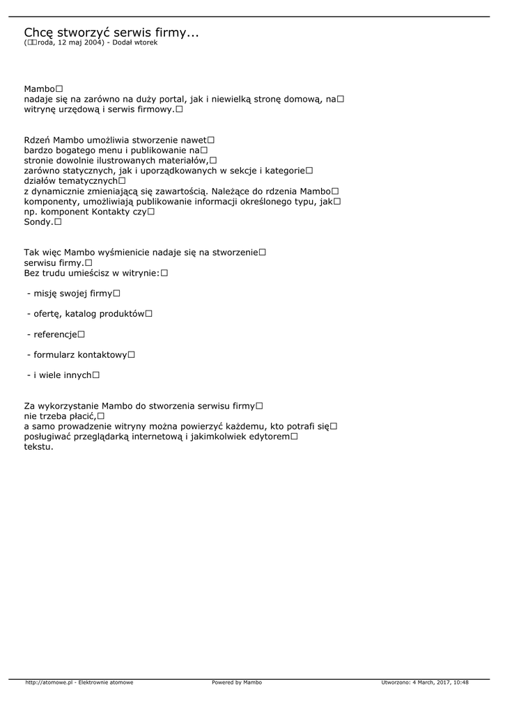 Chcę stworzyć serwis firmy... (Å›roda, 12 maj 2004) - Dodał wtorek Mambo nadaje się na zarówno na duży portal, jak i niewielką stronę domową, na witrynę urzędową i serwis firmowy. Rdzeń Mambo umożliwia stworzenie nawet bardzo bogatego menu i publikowanie na stronie dowolnie ilustrowanych materiałów, zarówno statycznych, jak i uporządkowanych w sekcje i kategorie działów tematycznych z dynamicznie zmieniającą się zawartością. Należące do rdzenia Mambo komponenty, umożliwiają publikowanie informacji określonego typu, jak np. komponent Kontakty czy Sondy. Tak więc Mambo wyśmienicie nadaje się na stworzenie serwisu firmy. Bez trudu umieścisz w witrynie: - misję swojej firmy - ofertę, katalog produktów - referencje - formularz kontaktowy - i wiele innych Za wykorzystanie Mambo do stworzenia serwisu firmy nie trzeba płacić, a samo prowadzenie witryny można powierzyć każdemu, kto potrafi się posługiwać przeglądarką internetową i jakimkolwiek edytorem tekstu. http://atomowe.pl - Elektrownie atomowe Powered by Mambo Utworzono: 4 March, 2017, 10:48