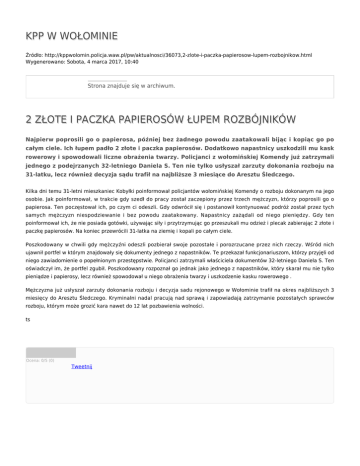 KPP W WOŁOMINIE Źródło: http://kppwolomin.policja.waw.pl/pw/aktualnosci/36073,2-zlote-i-paczka-papierosow-lupem-rozbojnikow.html Wygenerowano: Sobota, 4 marca 2017, 10:40 Strona znajduje się w archiwum. 2 ZŁOTE I PACZKA PAPIEROSÓW ŁUPEM ROZBÓJNIKÓW Najpierw poprosili go o papierosa, później bez żadnego powodu zaatakowali bijąc i kopiąc go po całym ciele. Ich łupem padło 2 złote i paczka papierosów. Dodatkowo napastnicy uszkodzili mu kask rowerowy i spowodowali liczne obrażenia twarzy. Policjanci z wołomińskiej Komendy już zatrzymali jednego z podejrzanych 32-letniego Daniela S. Ten nie tylko usłyszał zarzuty dokonania rozboju na 31-latku, lecz również decyzja sądu trafił na najbliższe 3 miesiące do Aresztu Śledczego. Kilka dni temu 31-letni mieszkaniec Kobyłki poinformował policjantów wołomińskiej Komendy o rozboju dokonanym na jego osobie. Jak poinformował, w trakcie gdy szedł do pracy został zaczepiony przez trzech mężczyzn, którzy poprosili go o papierosa. Ten poczęstował ich, po czym ci odeszli. Gdy odwrócił się i postanowił kontynuować podróż został przez tych samych mężczyzn niespodziewanie i bez powodu zaatakowany. Napastnicy zażądali od niego pieniędzy. Gdy ten poinformował ich, że nie posiada gotówki, używając siły i przytrzymując go przeszukali mu odzież i plecak zabierając 2 złote i paczkę papierosów. Na koniec przewrócili 31-latka na ziemię i kopali po całym ciele. Poszkodowany w chwili gdy mężczyźni odeszli pozbierał swoje pozostałe i porozrzucane przez nich rzeczy. Wśród nich ujawnił portfel w którym znajdowały się dokumenty jednego z napastników. Te przekazał funkcjonariuszom, którzy przyjęli od niego zawiadomienie o popełnionym przestępstwie. Policjanci zatrzymali właściciela dokumentów 32-letniego Daniela S. Ten oświadczył im, że portfel zgubił. Poszkodowany rozpoznał go jednak jako jednego z napastników, który skarał mu nie tylko pieniądze i papierosy, lecz również spowodował u niego obrażenia twarzy i uszkodzenie kasku rowerowego . Mężczyzna już usłyszał zarzuty dokonania rozboju i decyzja sadu rejonowego w Wołominie trafił na okres najbliższych 3 miesięcy do Aresztu Śledczego. Kryminalni nadal pracują nad sprawą i zapowiadają zatrzymanie pozostałych sprawców rozboju, którym może grozić kara nawet do 12 lat pozbawienia wolności. ts Ocena: 0/5 (0) Tweetnij
