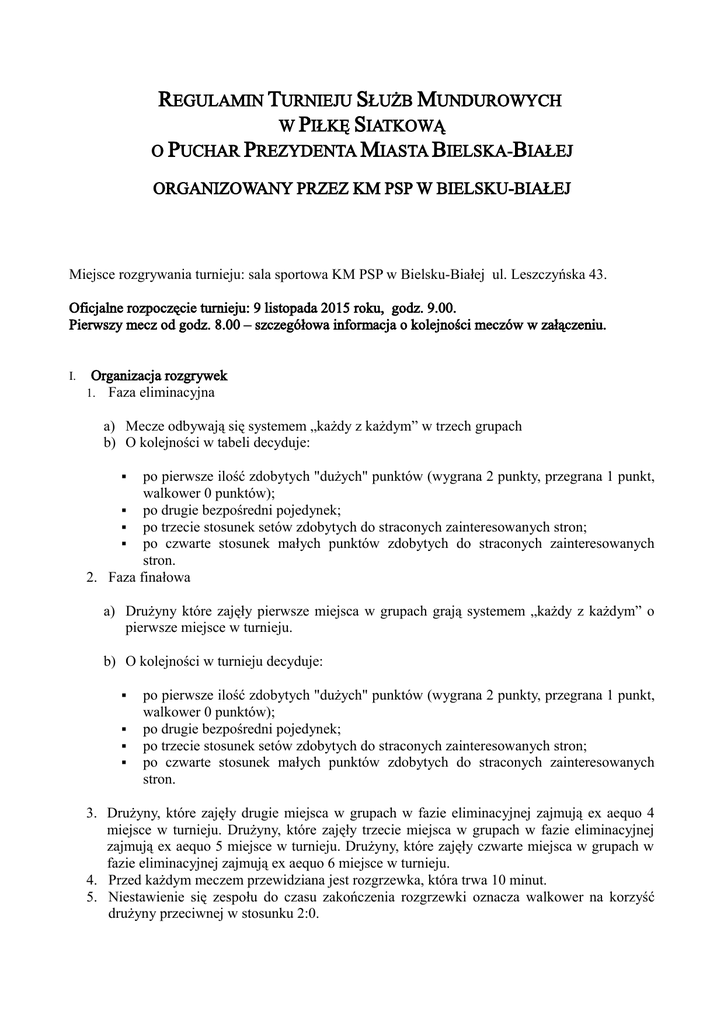 REGULAMIN TURNIEJU SŁUŻB MUNDUROWYCH W PIŁKĘ SIATKOWĄ O PUCHAR PREZYDENTA MIASTA BIELSKA-BIAŁEJ ORGANIZOWANY PRZEZ KM PSP W BIELSKU-BIAŁEJ Miejsce rozgrywania turnieju: sala sportowa KM PSP w Bielsku-Białej ul. Leszczyńska 43. Oficjalne rozpoczęcie turnieju: 9 listopada 2015 roku, godz. 9.00. Pierwszy mecz od godz. 8.00 – szczegółowa informacja o kolejności meczów w załączeniu. I. Organizacja rozgrywek Faza eliminacyjna 1. a) Mecze odbywają się systemem „każdy z każdym” w trzech grupach b) O kolejności w tabeli decyduje: po pierwsze ilość zdobytych "dużych" punktów (wygrana 2 punkty, przegrana 1 punkt, walkower 0 punktów); po drugie bezpośredni pojedynek; po trzecie stosunek setów zdobytych do straconych zainteresowanych stron; po czwarte stosunek małych punktów zdobytych do straconych zainteresowanych stron. 2. Faza finałowa a) Drużyny które zajęły pierwsze miejsca w grupach grają systemem „każdy z każdym” o pierwsze miejsce w turnieju. b) O kolejności w turnieju decyduje: po pierwsze ilość zdobytych "dużych" punktów (wygrana 2 punkty, przegrana 1 punkt, walkower 0 punktów); po drugie bezpośredni pojedynek; po trzecie stosunek setów zdobytych do straconych zainteresowanych stron; po czwarte stosunek małych punktów zdobytych do straconych zainteresowanych stron. 3. Drużyny, które zajęły drugie miejsca w grupach w fazie eliminacyjnej zajmują ex aequo 4 miejsce w turnieju. Drużyny, które zajęły trzecie miejsca w grupach w fazie eliminacyjnej zajmują ex aequo 5 miejsce w turnieju. Drużyny, które zajęły czwarte miejsca w grupach w fazie eliminacyjnej zajmują ex aequo 6 miejsce w turnieju. 4. Przed każdym meczem przewidziana jest rozgrzewka, która trwa 10 minut. 5. Niestawienie się zespołu do czasu zakończenia rozgrzewki oznacza walkower na korzyść drużyny przeciwnej w stosunku 2:0. II. Przepisy gry W rozgrywkach obowiązują przepisy określone w "Międzynarodowych Przepisach Gry w Piłkę Siatkową”, z następującymi wyjątkami: 1. 2. 3. 4. 5. 6. 7. III. Mecze rozgrywane są do 2 wygranych setów. Sety rozgrywane są do 15 punktów, nie stosuje się zasady dwupunktowej przewagi. W przypadku remisu rozgrywany jest "tie break" do 10, nie stosuje się zasady dwupunktowej przewagi (po 5 punkcie zmiana stron). W trakcie meczu każda drużyna może wykonać dowolną ilość zmian. W trakcie każdego seta na wniosek kapitana drużyny, drużyna może zażądać jednej jednominutowej przerwy . W trakcie gry na boisku przebywa 6 zawodników z każdej drużyny - wszelkie odstępstwa od tej zasady są możliwe za zgodą sędziego. Mecz prowadzi jeden sędzia. Sytuacje sporne podczas meczu sędzia wyjaśnia wyłącznie z kapitanem zespołu. Postanowienia końcowe W przypadku nie przestrzegania regulaminu lub przepisów gry organizator ma prawo do weryfikacji wyniku meczu lub dyskwalifikowania zawodnika lub drużyny z turnieju. 2. Ci sami zawodnicy mogą grać tylko w jednej drużynie w turnieju siatkówki. 3. Organizator ma prawo sprawdzenia tożsamości zawodników wpisanych do składu. 1. Grupa A 1. Komenda Miejska PSP w Bielsku-Białej 2. Wojskowa Komenda Uzupełnień 3. Bielskie Pogotowie Ratunkowe 4. Areszt Śledczy w Bielsku-Białej Grupa B 1. Komenda Miejska Policji w Bielsku-Białej 2. Nadleśnictwo Bielsko-Biała 3. Straż Graniczna 4. Urząd Celny w Bielsku-Białej Grupa C 1. 18 Bielski Batalion Powietrznodesantowy 2. GOPR – Grupa Beskidzka 3. Straż Miejska w Bielsku-Białej Kolejność meczów. PSP – WKU – początek 8. 00 Policja – Nadleśnictwo – początek ok. 8.30 Jednostka Wojskowa – GOPR Pogotowie Ratunkowe – Areszt Śledczy Straż Graniczna – Urząd Celny PSP – Pogotowie Ratunkowe Policja - Straż Graniczna Straż Miejska – Jednostka Wojskowa WKU – Areszt Śledczy Nadleśnictwo – Urząd Celny GOPR – Straż Miejska PSP – Areszt Śledczy Policja – Urząd Celny WKU – Pogotowie Ratunkowe Nadleśnictwo – Straż Graniczna I miejsce gr. A – I miejsce gr. C I miejsce gr. B – I miejsce gr. C I miejsce gr. A – I miejsce gr. B