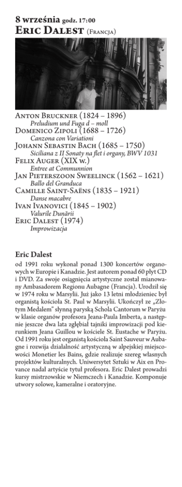 8 września godz. 17:00 Eric Dalest (Francja) Anton Bruckner (1824 – 1896) Preludium und Fuga d – moll Domenico Zipoli (1688 – 1726) Canzona con Variationi Johann Sebastin Bach (1685 – 1750) Siciliana z II Sonaty na flet i organy, BWV 1031 Felix Auger (XIX w.) Entree at Communnion Jan Pieterszoon Sweelinck (1562 – 1621) Ballo del Granduca Camille Saint-Saëns (1835 – 1921) Danse macabre Ivan Ivanovici (1845 – 1902) Valurile Dunării Eric Dalest (1974) Improwizacja Eric Dalest od 1991 roku wykonał ponad 1300 koncertów organowych w Europie i Kanadzie. Jest autorem ponad 60 płyt CD i DVD. Za swoje osiągnięcia artystyczne został mianowany Ambasadorem Regionu Aubagne (Francja). Urodził się w 1974 roku w Marsylii. Już jako 13 letni młodzieniec był organistą kościoła St. Paul w Marsylii. Ukończył ze „Złotym Medalem” słynną paryską Schola Cantorum w Paryżu w klasie organów profesora Jeana-Paula Imberta, a następnie jeszcze dwa lata zgłębiał tajniki improwizacji pod kierunkiem Jeana Guillou w kościele St. Eustache w Paryżu. Od 1991 roku jest organistą kościoła Saint Sauveur w Aubagne i rozwija działalność artystyczną w alpejskiej miejscowości Monetier les Bains, gdzie realizuje szereg własnych projektów kulturalnych. Uniwersytet Sztuki w Aix en Provance nadał artyście tytuł profesora. Eric Dalest prowadzi kursy mistrzowskie w Niemczech i Kanadzie. Komponuje utwory solowe, kameralne i oratoryjne.