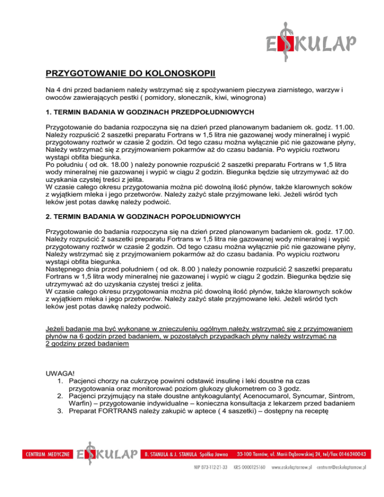 PRZYGOTOWANIE DO KOLONOSKOPII Na 4 dni przed badaniem naleŜy wstrzymać się z spoŜywaniem pieczywa ziarnistego, warzyw i owoców zawierających pestki ( pomidory, słonecznik, kiwi, winogrona) 1. TERMIN BADANIA W GODZINACH PRZEDPOŁUDNIOWYCH Przygotowanie do badania rozpoczyna się na dzień przed planowanym badaniem ok. godz. 11.00. NaleŜy rozpuścić 2 saszetki preparatu Fortrans w 1,5 litra nie gazowanej wody mineralnej i wypić przygotowany roztwór w czasie 2 godzin. Od tego czasu moŜna wyłącznie pić nie gazowane płyny, NaleŜy wstrzymać się z przyjmowaniem pokarmów aŜ do czasu badania. Po wypiciu roztworu wystąpi obfita biegunka. Po południu ( od ok. 18.00 ) naleŜy ponownie rozpuścić 2 saszetki preparatu Fortrans w 1,5 litra wody mineralnej nie gazowanej i wypić w ciągu 2 godzin. Biegunka będzie się utrzymywać aŜ do uzyskania czystej treści z jelita. W czasie całego okresu przygotowania moŜna pić dowolną ilość płynów, takŜe klarownych soków z wyjątkiem mleka i jego przetworów. NaleŜy zaŜyć stale przyjmowane leki. JeŜeli wśród tych leków jest potas dawkę naleŜy podwoić. 2. TERMIN BADANIA W GODZINACH POPOŁUDNIOWYCH Przygotowanie do badania rozpoczyna się na dzień przed planowanym badaniem ok. godz. 17.00. NaleŜy rozpuścić 2 saszetki preparatu Fortrans w 1,5 litra nie gazowanej wody mineralnej i wypić przygotowany roztwór w czasie 2 godzin. Od tego czasu moŜna wyłącznie pić nie gazowane płyny, NaleŜy wstrzymać się z przyjmowaniem pokarmów aŜ do czasu badania. Po wypiciu roztworu wystąpi obfita biegunka. Następnego dnia przed południem ( od ok. 8.00 ) naleŜy ponownie rozpuścić 2 saszetki preparatu Fortrans w 1,5 litra wody mineralnej nie gazowanej i wypić w ciągu 2 godzin. Biegunka będzie się utrzymywać aŜ do uzyskania czystej treści z jelita. W czasie całego okresu przygotowania moŜna pić dowolną ilość płynów, takŜe klarownych soków z wyjątkiem mleka i jego przetworów. NaleŜy zaŜyć stale przyjmowane leki. JeŜeli wśród tych leków jest potas dawkę naleŜy podwoić. JeŜeli badanie ma być wykonane w znieczuleniu ogólnym naleŜy wstrzymać się z przyjmowaniem płynów na 6 godzin przed badaniem, w pozostałych przypadkach płyny naleŜy wstrzymać na 2 godziny przed badaniem UWAGA! 1. Pacjenci chorzy na cukrzycę powinni odstawić insulinę i leki doustne na czas przygotowania oraz monitorować poziom glukozy glukometrem co 3 godz. 2. Pacjenci przyjmujący na stałe doustne antykoagulanty( Acenocumarol, Syncumar, Sintrom, Warfin) – przygotowanie indywidualne – konieczna konsultacja z lekarzem przed badaniem 3. Preparat FORTRANS naleŜy zakupić w aptece ( 4 saszetki) – dostępny na receptę