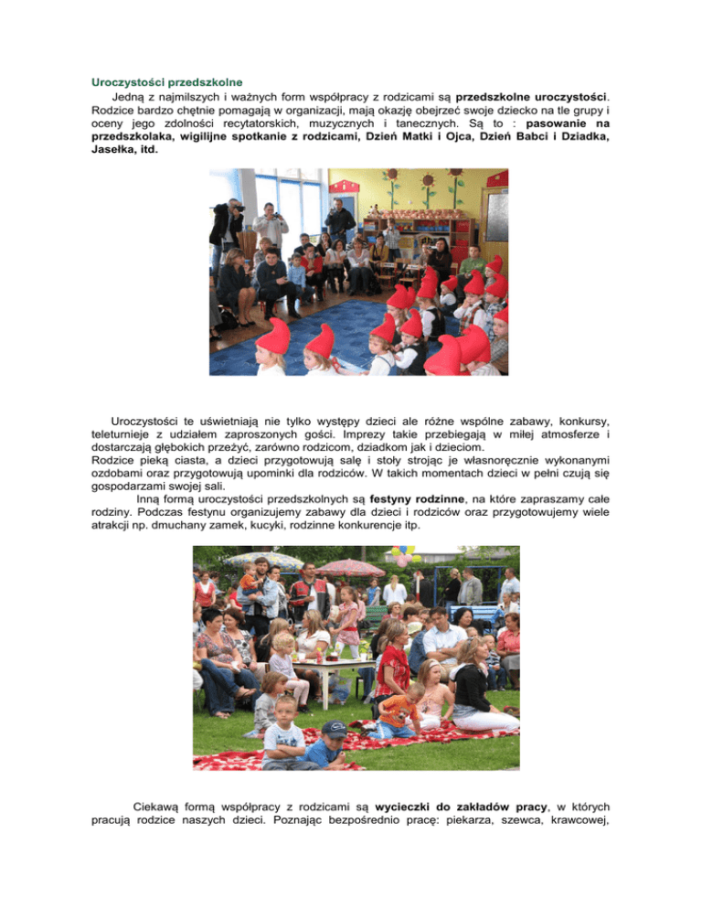 Uroczystości przedszkolne Jedną z najmilszych i ważnych form współpracy z rodzicami są przedszkolne uroczystości. Rodzice bardzo chętnie pomagają w organizacji, mają okazję obejrzeć swoje dziecko na tle grupy i oceny jego zdolności recytatorskich, muzycznych i tanecznych. Są to : pasowanie na przedszkolaka, wigilijne spotkanie z rodzicami, Dzień Matki i Ojca, Dzień Babci i Dziadka, Jasełka, itd. Uroczystości te uświetniają nie tylko występy dzieci ale różne wspólne zabawy, konkursy, teleturnieje z udziałem zaproszonych gości. Imprezy takie przebiegają w miłej atmosferze i dostarczają głębokich przeżyć, zarówno rodzicom, dziadkom jak i dzieciom. Rodzice pieką ciasta, a dzieci przygotowują salę i stoły strojąc je własnoręcznie wykonanymi ozdobami oraz przygotowują upominki dla rodziców. W takich momentach dzieci w pełni czują się gospodarzami swojej sali. Inną formą uroczystości przedszkolnych są festyny rodzinne, na które zapraszamy całe rodziny. Podczas festynu organizujemy zabawy dla dzieci i rodziców oraz przygotowujemy wiele atrakcji np. dmuchany zamek, kucyki, rodzinne konkurencje itp. Ciekawą formą współpracy z rodzicami są wycieczki do zakładów pracy, w których pracują rodzice naszych dzieci. Poznając bezpośrednio pracę: piekarza, szewca, krawcowej, listonosza itp. Dzieci przyglądają się czynnościom wykonywanym w czasie pracy, poznają narzędzia, wzbogacają swoja wiedzę. Rodzice, również interesują się pracą dzieci w przedszkolu dlatego sprawdzoną formą współpracy jest: „Kącik dla rodziców”. Obok przedstawianych przez nauczycielki miesięcznych zamierzeń dotyczących pracy dydaktyczno – wychowawczej w danej grupie, zawsze można dowiedzieć się co obecnie dzieci poznają, znaleźć wierszyki i piosenki, których uczymy się w przedszkolu. Polecamy również ciekawą literaturę, zapraszamy na spotkania w przedszkolu i nie tylko. Organizujemy często w holu przedszkola wystawy prac plastyczno – technicznych dzieci, aby rodzice mogli zobaczyć wytwory własnych dzieci. Najważniejszą z form współpracy są kontakty indywidualne z rodzicami. Zaczynają się one od momentu zapisu dziecka do przedszkola i trwają cały rok szkolny. Oferujemy rodzicom konsultacje z nauczycielkami, a także udzielamy informacji na bieżąco. Staramy się wspólnie z rodzicami szukać dobrych rozwiązań, do każdej rozmowy przygotowujemy się, by była ona przemyślana, wymaga od nas często wielkiego taktu i kompetencji. Dzieci podczas całego roku mają możliwość korzystania z wycieczek do kina, teatru, zoo, czy leśniczówki. Organizowane są dla nich zabawy: andrzejkowa i karnawałowa. Na zakończenie roku szkolnego uroczystość „Pożegnania przedszkola” przez dzieci 6letnie odbywa się w obecności rodziców. Dzieci przygotowują program artystyczny, w którym pokazują swoje osiągnięcia. Jest to moment bardzo ważny w życiu przedszkolaka, gdyż kończy się okres beztroskiej, swobodnej zabawy a wkraczają w etap obowiązków szkolnych. Na uroczystości tej panuje niepowtarzalna atmosfera, pełna wzruszeń, niezapomnianych słów podziękowań i pożegnań. Każdy absolwent naszego przedszkola jest obdarowany dyplomem i pamiątką z przedszkola. Rodzice aktywnie działający na rzecz przedszkola otrzymują podziękowania i drobne upominki. Ponadto przedszkole proponuje rodzicom bogatą ofertę zajęć dodatkowych, mianowicie: język angielski, rytmika, zajęcia na basenie, szachy, taekwondo, taniec towarzyski - zajęcia płatne przez rodziców oraz gimnastykę korekcyjno- kompensacyjną, terapię pedagogiczną – prowadzone przez nasze nauczycielki. Terapia logopedyczna prowadzona jest przez specjalistę zatrudnionego przez Gminę. Wszystkie nasze działania podejmowane są dla zapewnienia dzieciom opieki, bezpieczeństwa psychicznego, fizycznego i warunków do indywidualnego rozwoju zgodnie z ich możliwościami. Umożliwiamy dzieciom wszechstronny rozwój osobowości a rodziców wspieramy w działaniach wychowawczych i edukacyjnych. KALENDARZ IMPREZ W PRZEDSZKOLU NR 3 Lp. 1 Temat uroczystości i imprez Termin Rozpoczęcie roku. 2 Dożynki – kultywujemy tradycje. IX IX 3 Dzień Edukacji Narodowej X 4 „ Święto pieczonego ziemniaka” - wyjazdy do gospodarstw agroturystycznych. X Akcja „Zbieramy kasztany dla zwierzą na zimę”. X Pasowanie na przedszkolaka X 5 Grupa odpowiedzialna I – V , oddz. „ 0 „ IV V Grupy starsze Wszystkie dzieci 6 I , IV, oddz. „O” Uwagi 7 8 9 10 11 12. 13 14 15 16 17 18 19 20 21 22 23 24 Wróżby, wróżby – zabawa andrzejkowa. Imieniny Mikołaja – powitanie dzieci w dniu imienin przed wejściem do przedszkola. I - V , oddz. „ 0 „ XI XII I – V , oddz.” 0” Przegląd recytatorski – promowanie czytelnictwa. Wieczór wigilijny – spotkania rodzinne w przedszkolu Herbatka z babcią i dziadkiem uroczyste spotkanie z najbliższymi. Dom seniora - występy dzieci XII Dzieci z rawickich przedszkoli Balik Karnawałowy –zabawa taneczna Dni otwarte w przedszkolu, dla rodziców i dzieci , pragnących się zapisać na nowy rok. Pożegnanie zimy – powitanie wiosny- realizacja zwyczajów roku obrzędowego. W poszukiwaniu zajączka wielkanocnego – wyjazd do leśniczówki Turniej Sportowy – igrzyska przedszkolaków. I POZNAJEMY EUROPĘ - Dni europejskie w Przedszkolu. Zielone Przedszkole – wyjazd do ośrodka wczasów dziecięcych we Wroniawach. Wycieczki turystyczno – edukacyjne – poznawanie bliższego i dalszego regionu. Dzień Matki i Ojca – wzmacnianie więzi rodzinnych. Festyn Rodzinny - „Bawimy się razem” Urodziny Hałabały – integracja środowiska przedszkolnego. Żegnamy już przedszkole – pożegnanie 6 – latków. XII I - V , oddz. „ 0 „ I I – V , oddz. „ 0 „ I Dzieci starsze II III III III - IV V I - V, I – V , oddz. „ 0 „ III I – V , oddz. „ 0 „ Drużyny z przedszkoli gminy Rawicz Wszystkie grupy