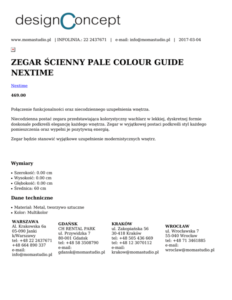 www.momastudio.pl | INFOLINIA.: 22 2437671 | e-mail: [email protected] | 2017-03-04 ZEGAR ŚCIENNY PALE COLOUR GUIDE NEXTIME Nextime 469.00 Połączenie funkcjonalności oraz niecodziennego uzupełnienia wnętrza. Niecodzienna postać zegara przedstawiająca kolorystyczny wachlarz w lekkiej, dyskretnej formie doskonale podkreśli elegancję każdego wnętrza. Zegar w wyjątkowej postaci podkreśli styl każdego pomieszczenia oraz wypełni je pozytywną energią. Zegar będzie stanowić wyjątkowe uzupełnienie modernistycznych wnętrz. Wymiary ● ● ● ● Szerokość: 0.00 cm Wysokość: 0.00 cm Głębokość: 0.00 cm Średnica: 60 cm Dane techniczne ● ● Materiał: Metal, tworzywo sztuczne Kolor: Multikolor WARSZAWA Al. Krakowska 6a 05-090 Janki k/Warszawy tel: +48 22 2437671 +48 664 890 337 e-mail: [email protected] GDAŃSK CH RENTAL PARK ul. Przywidzka 7 80-001 Gdańsk tel: +48 58 3508790 e-mail: [email protected] KRAKÓW ul. Zakopiańska 56 30-418 Kraków tel: +48 505 436 669 tel: +48 12 3070112 e-mail: [email protected] WROCŁAW ul. Wrocławska 7 55-040 Wrocław tel: +48 71 3461885 e-mail: [email protected]