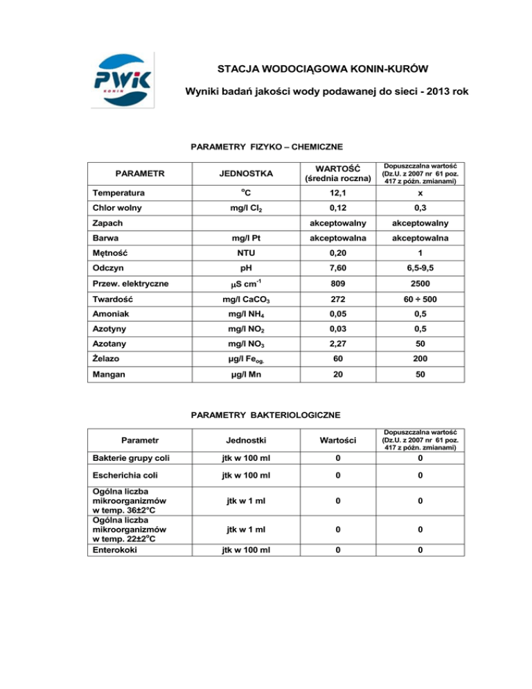 STACJA WODOCIĄGOWA KONIN-KURÓW Wyniki badań jakości